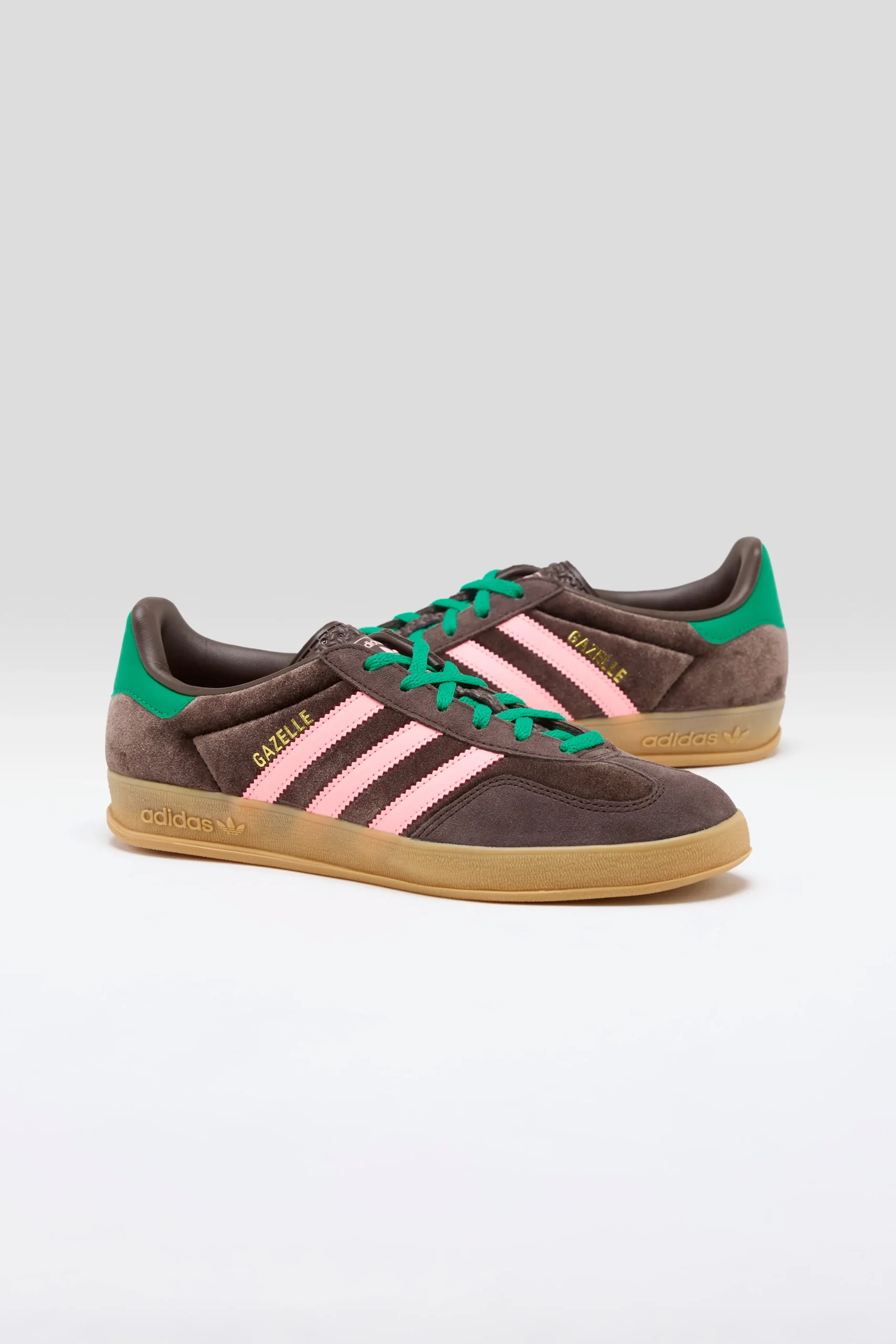 The Adidas Gazelle Indoor sneakers in lush brown velvet feature suede panels, brand details, and textile lining.