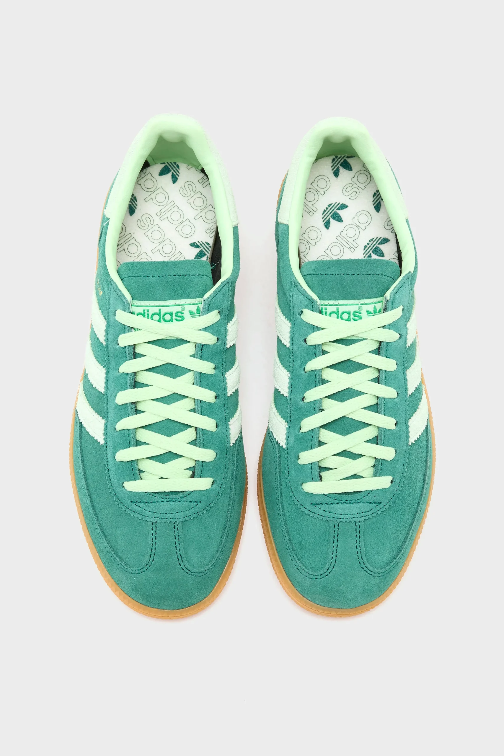The Adidas Handball Spezial sneakers feature a suede upper, padded ankle collar, and gum rubber sole.