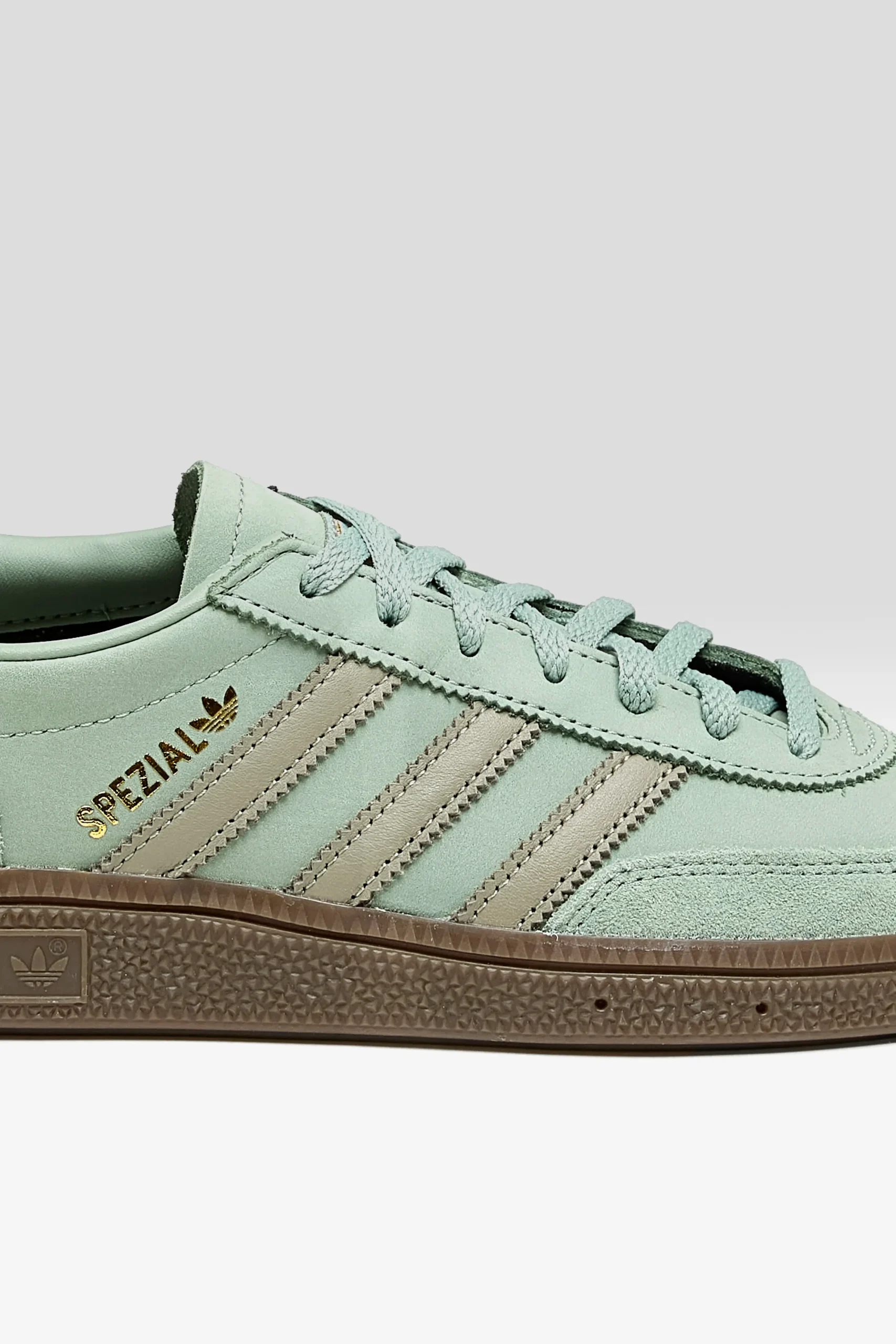 The Adidas Handball Spezial sneakers feature a smooth nubuck leather upper with a reinforced toe and leather lining.