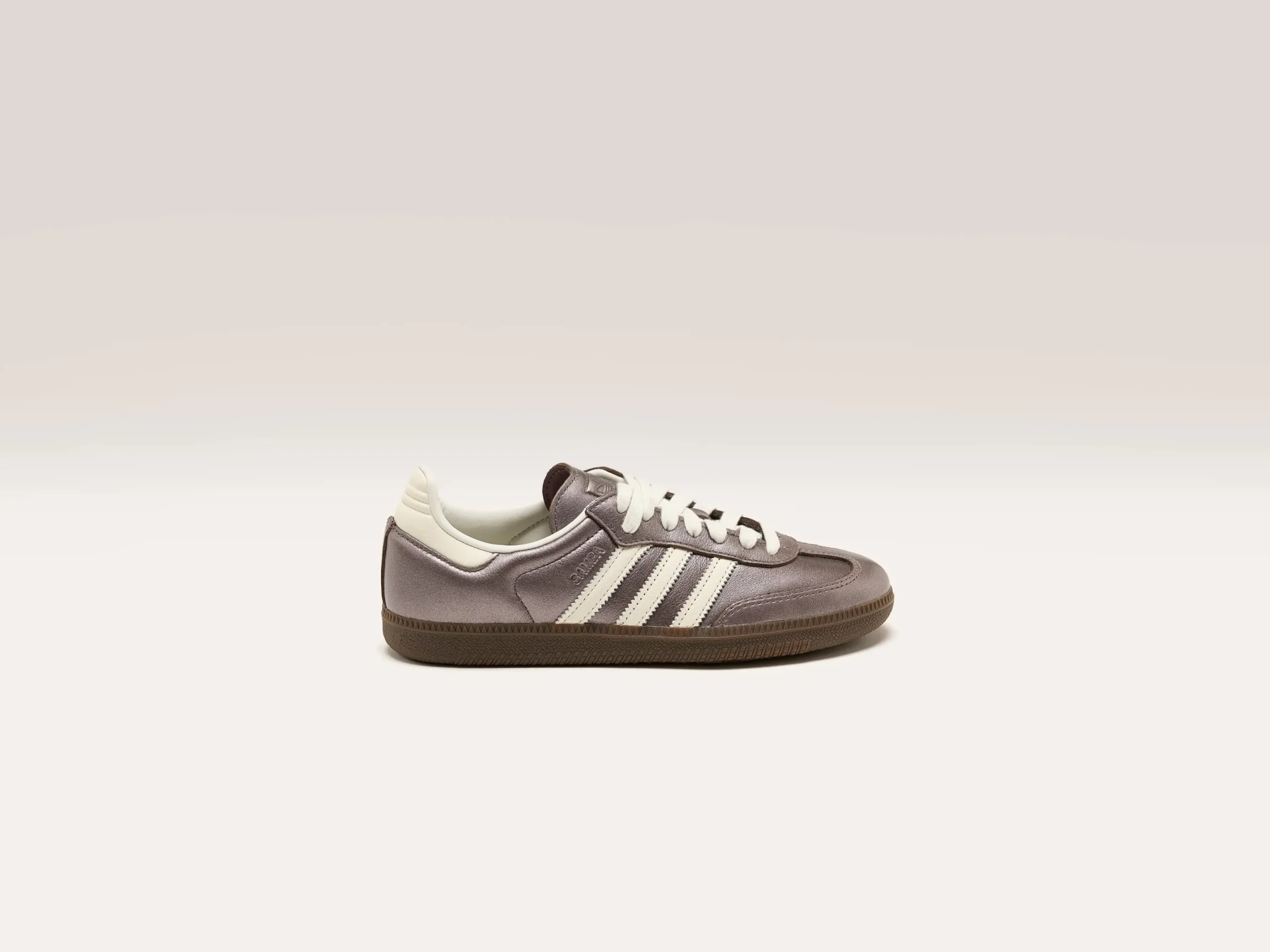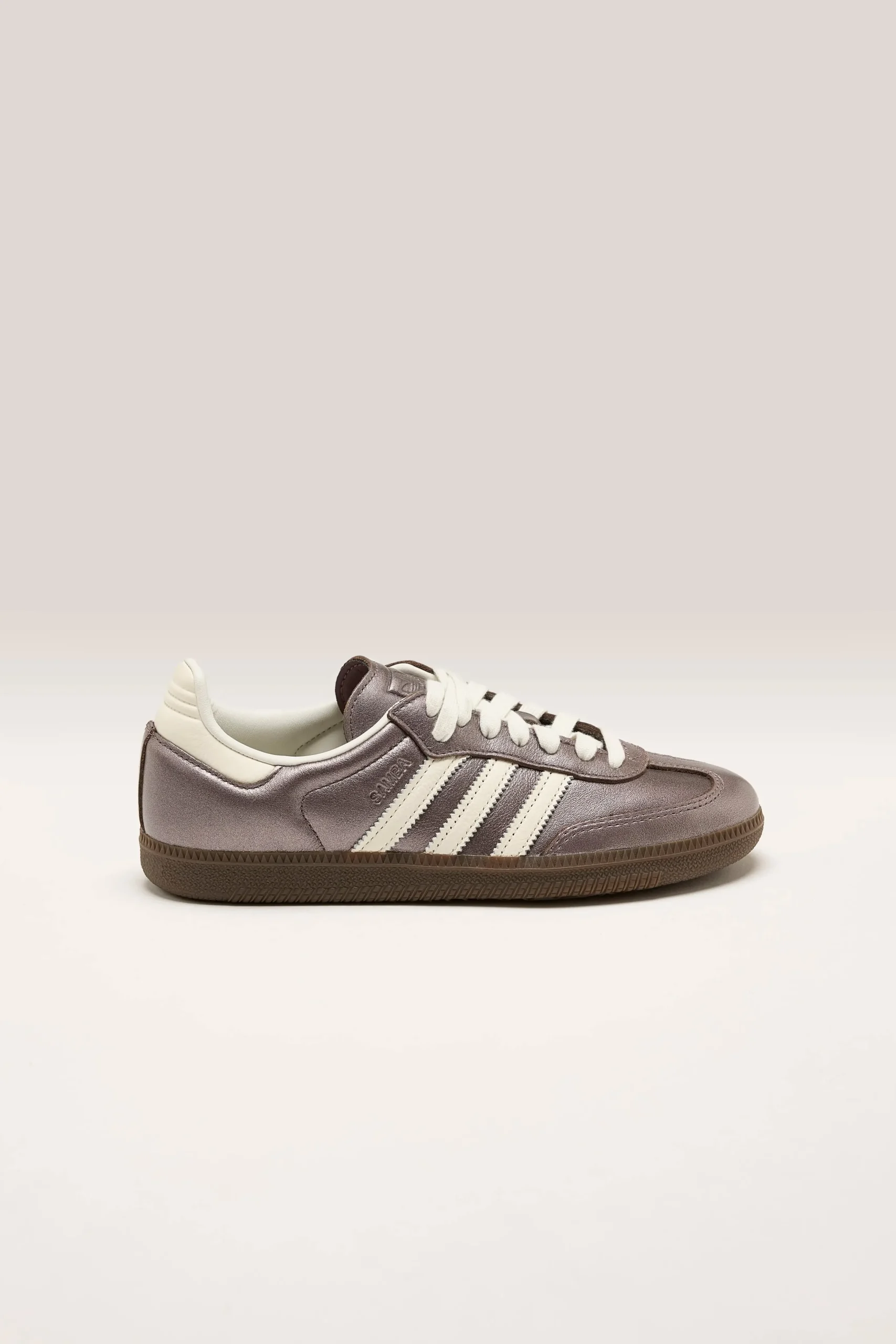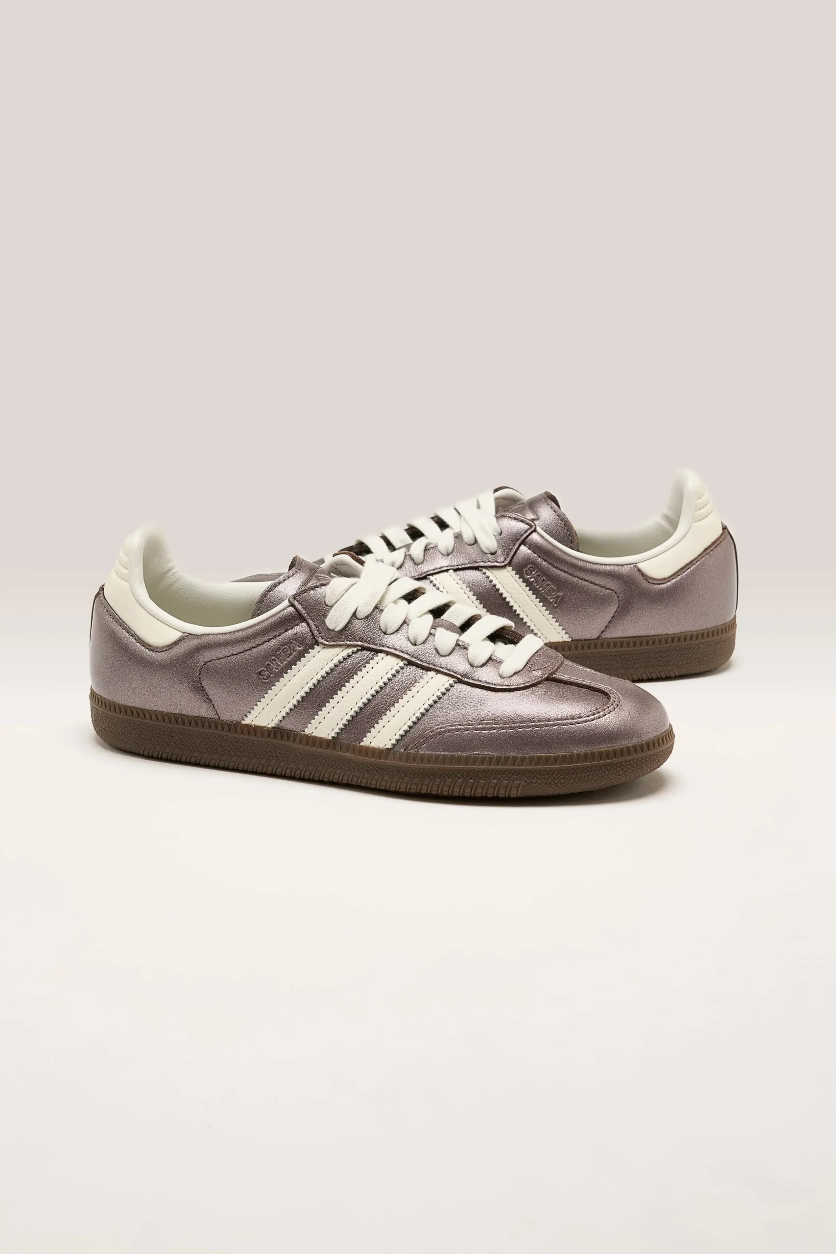 The Adidas Samba OG legacy sneakers feature a smooth leather upper with a high-shine metallic finish in a low-profile si…