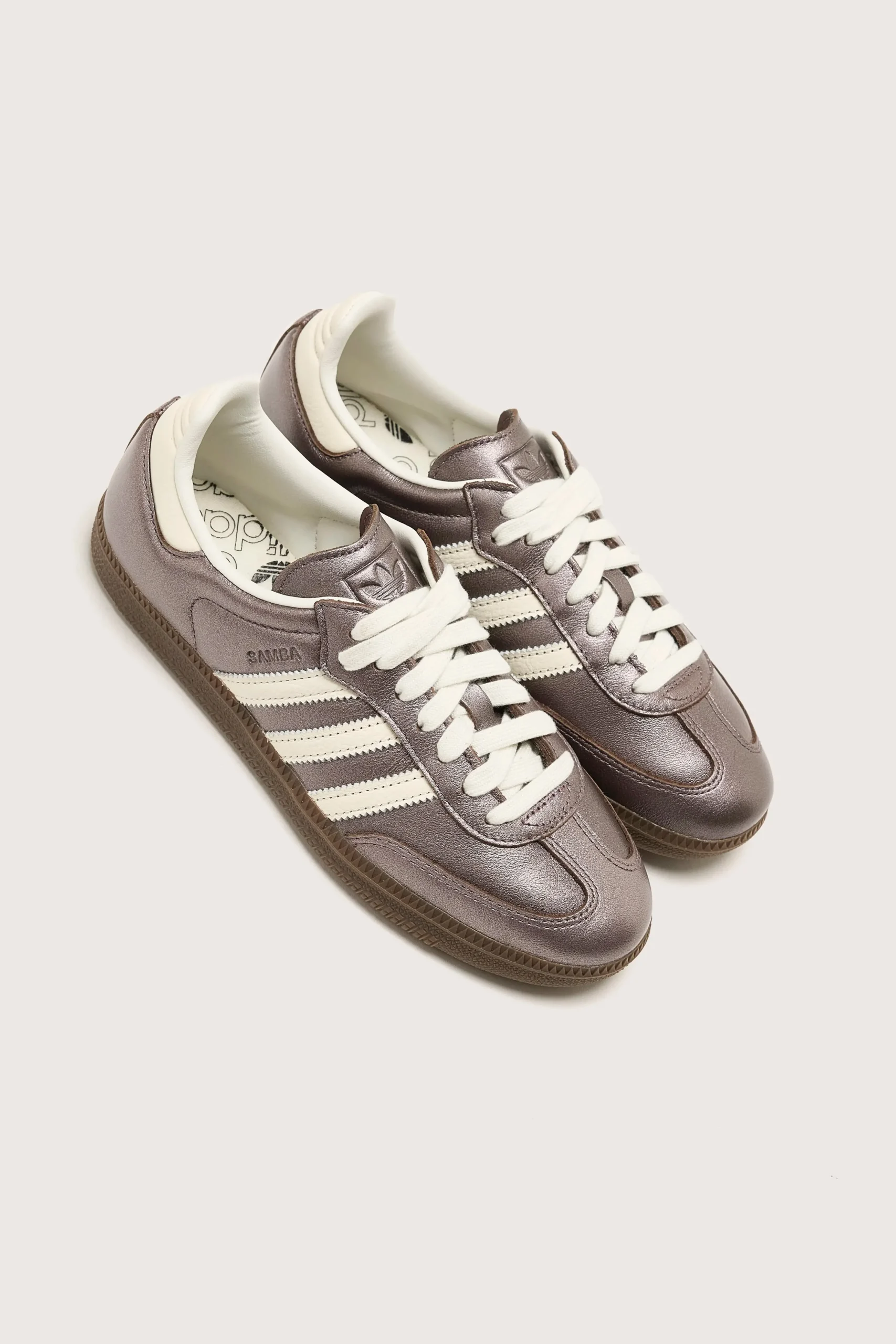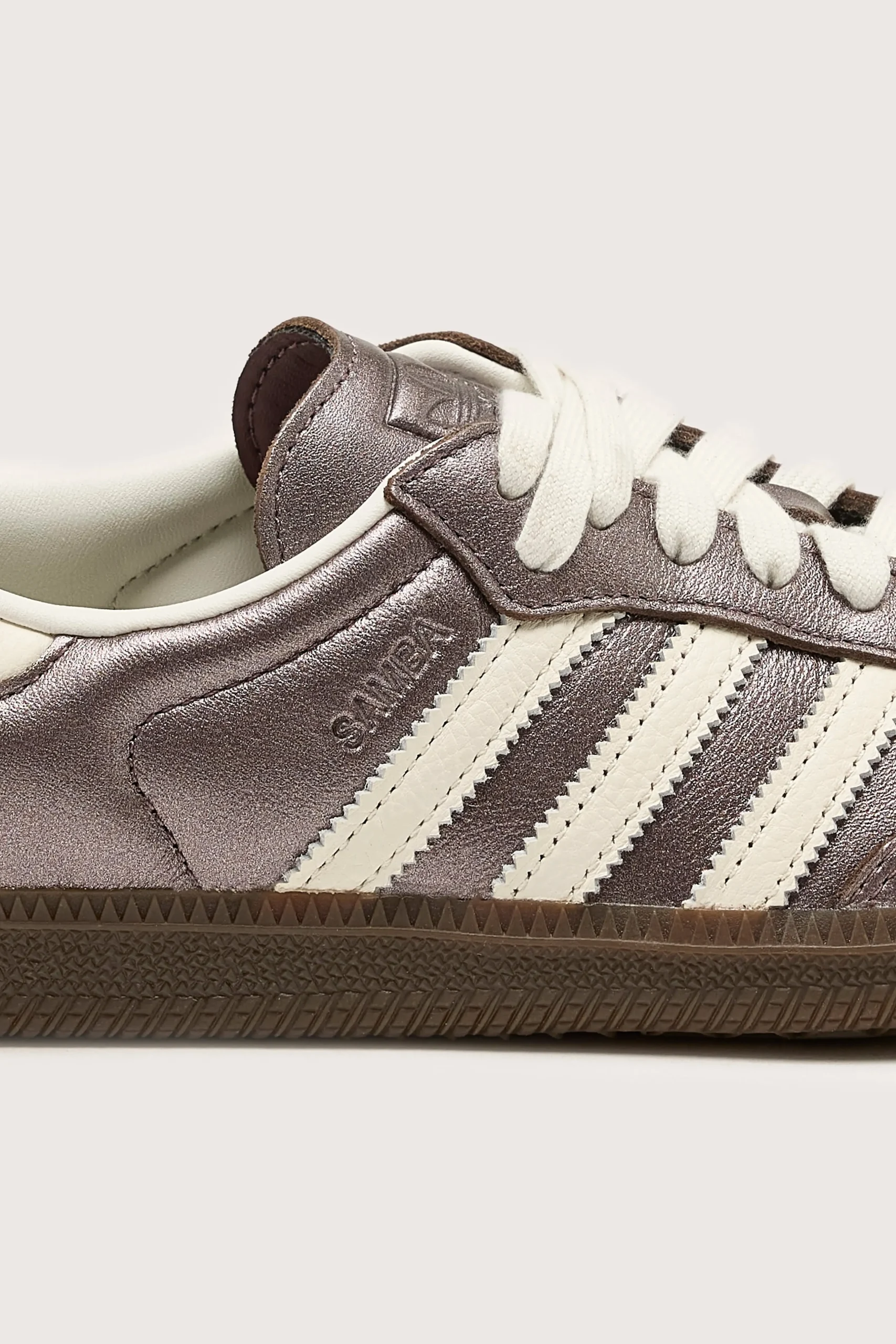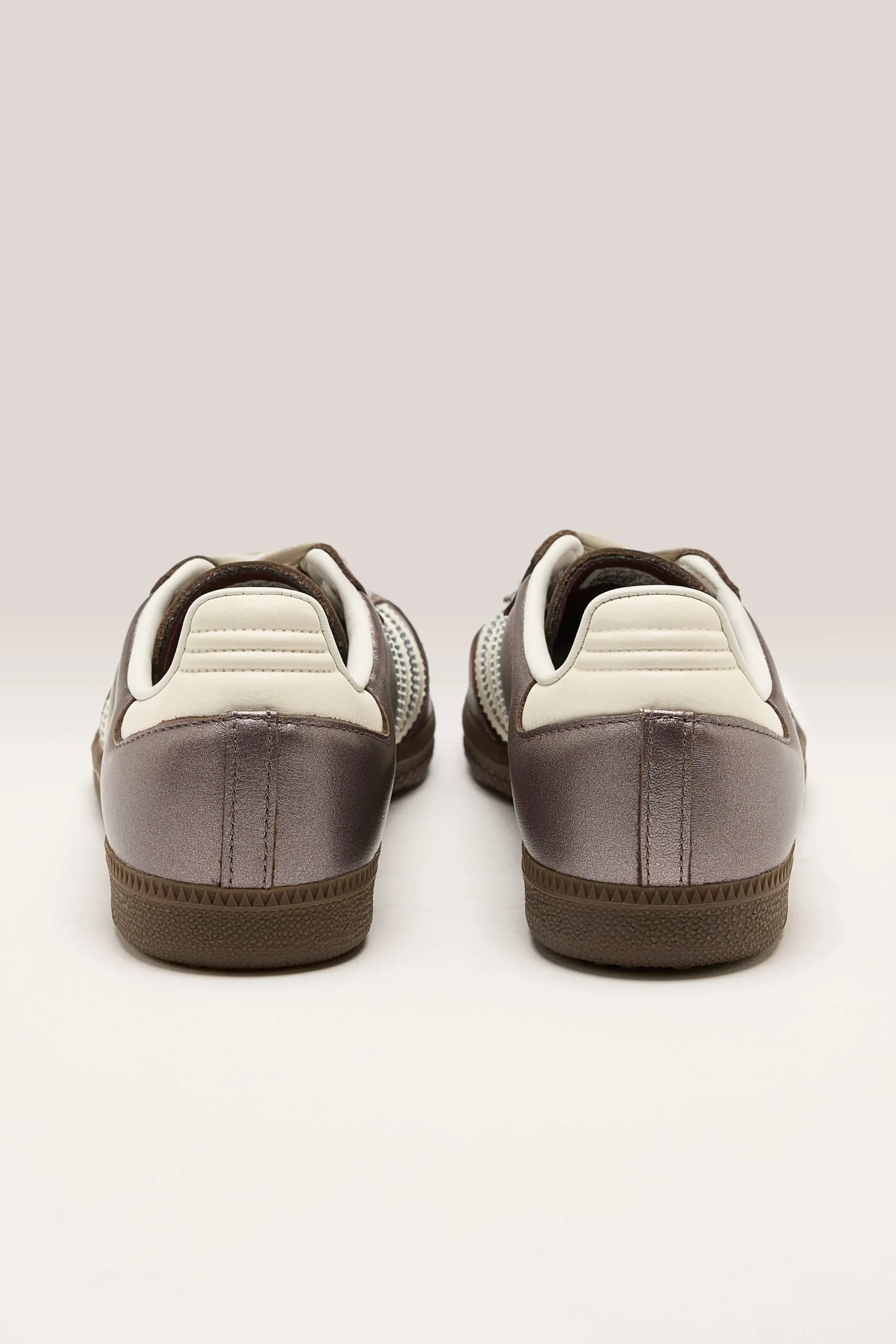 The Adidas Samba OG legacy sneakers feature a smooth leather upper with a high-shine metallic finish in a low-profile silhouette.