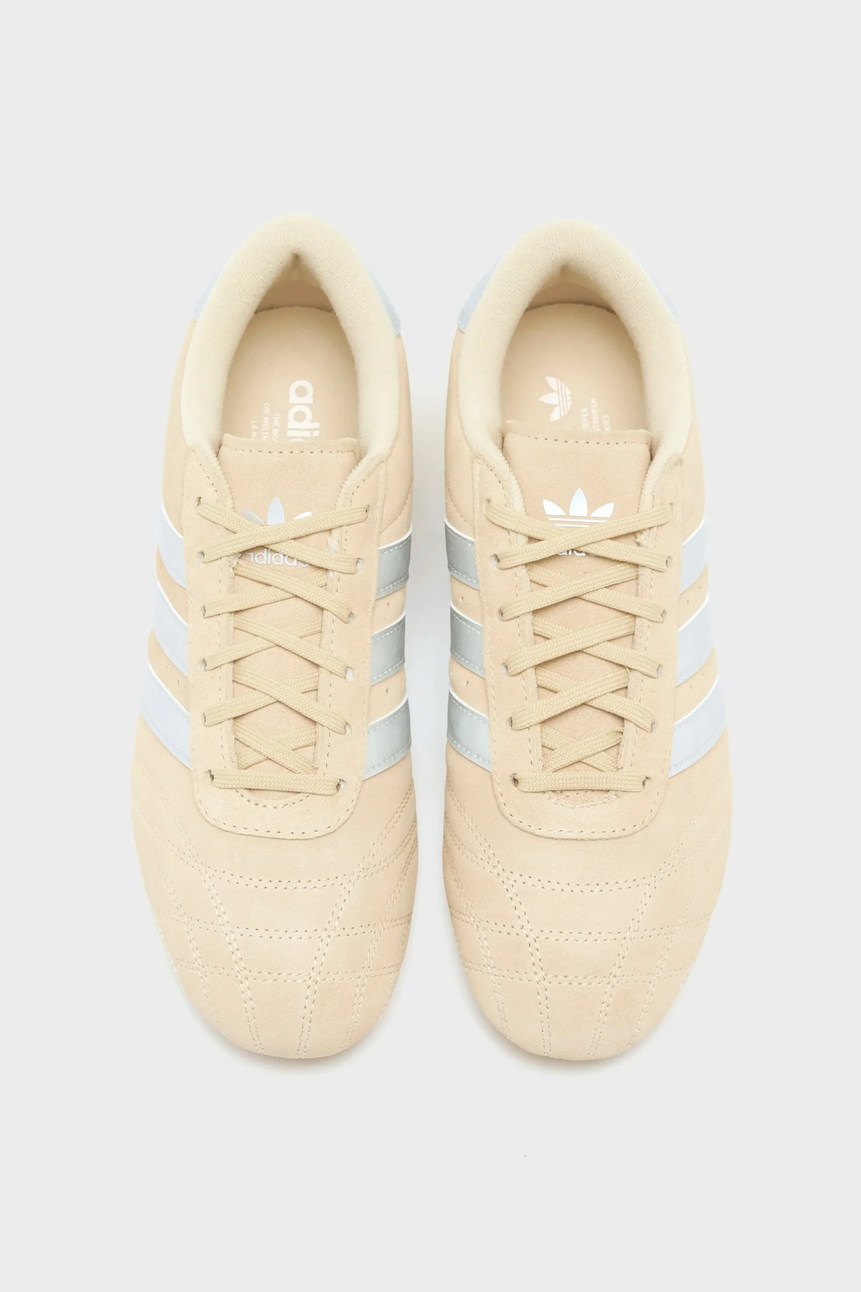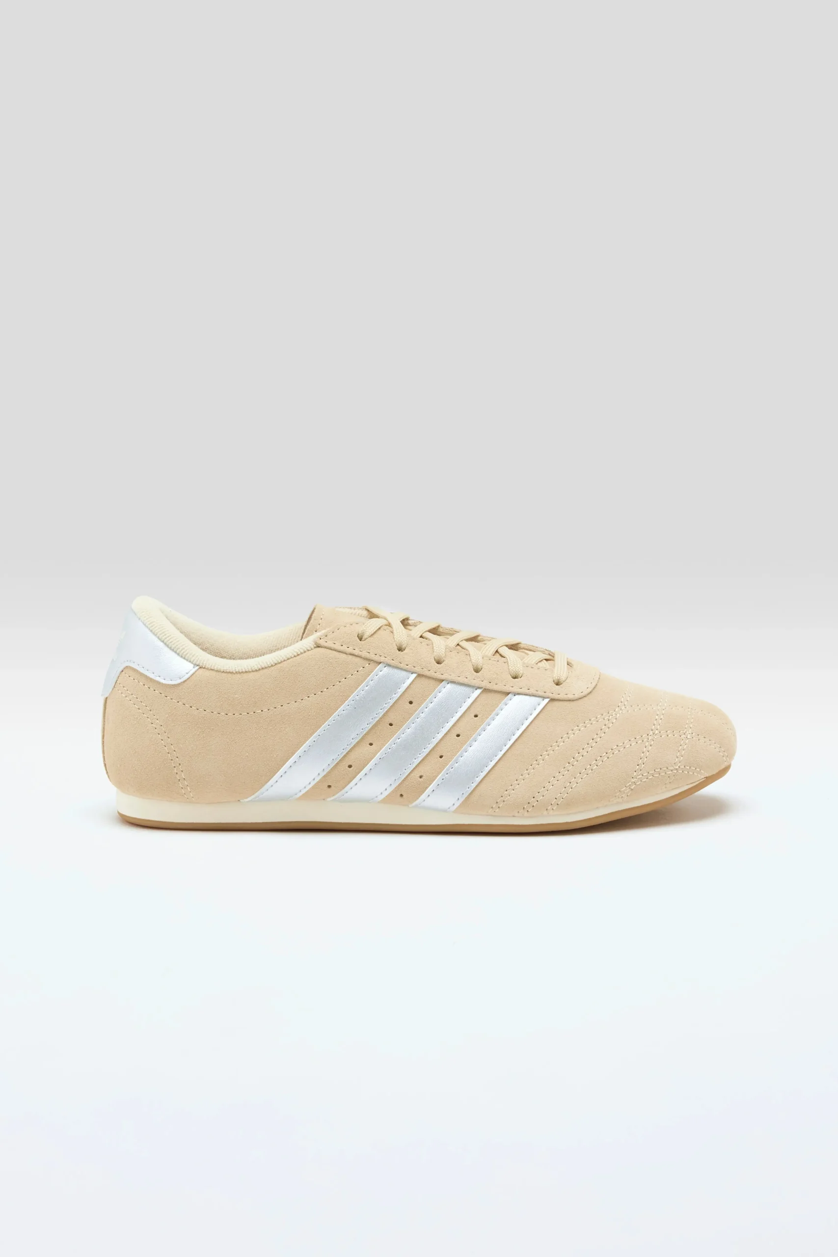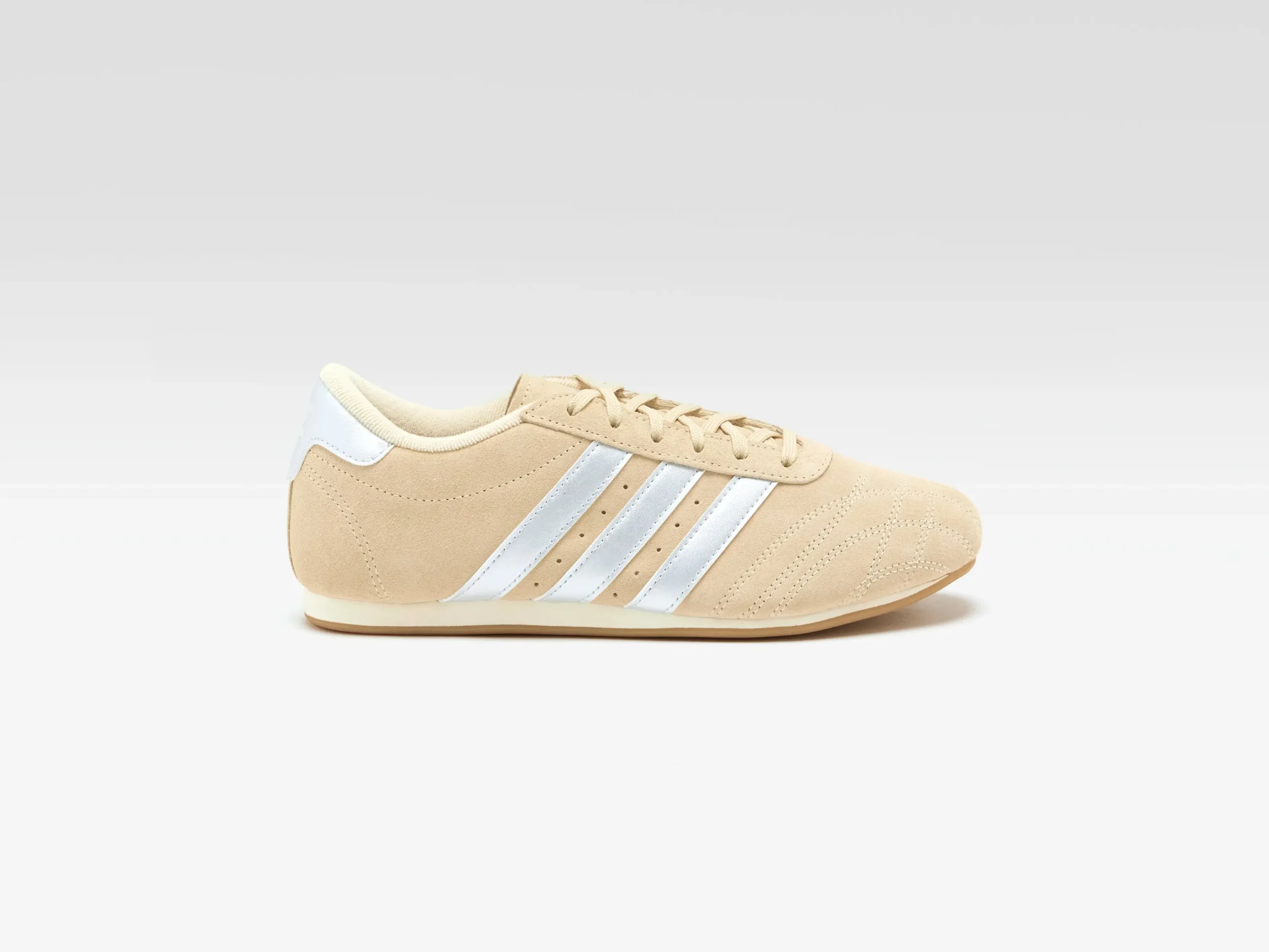 The Adidas Taekwondo Lace sneakers feature an ultra-low profile in quilted leather with metallic brand details, wedge midsole, and thin rubber outsole.