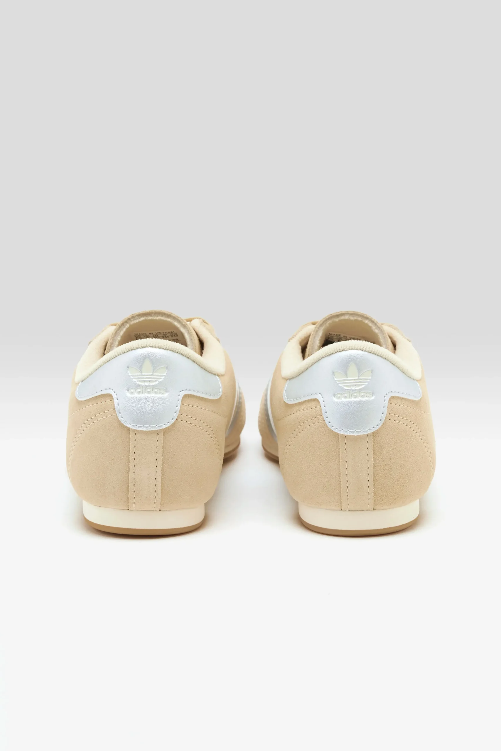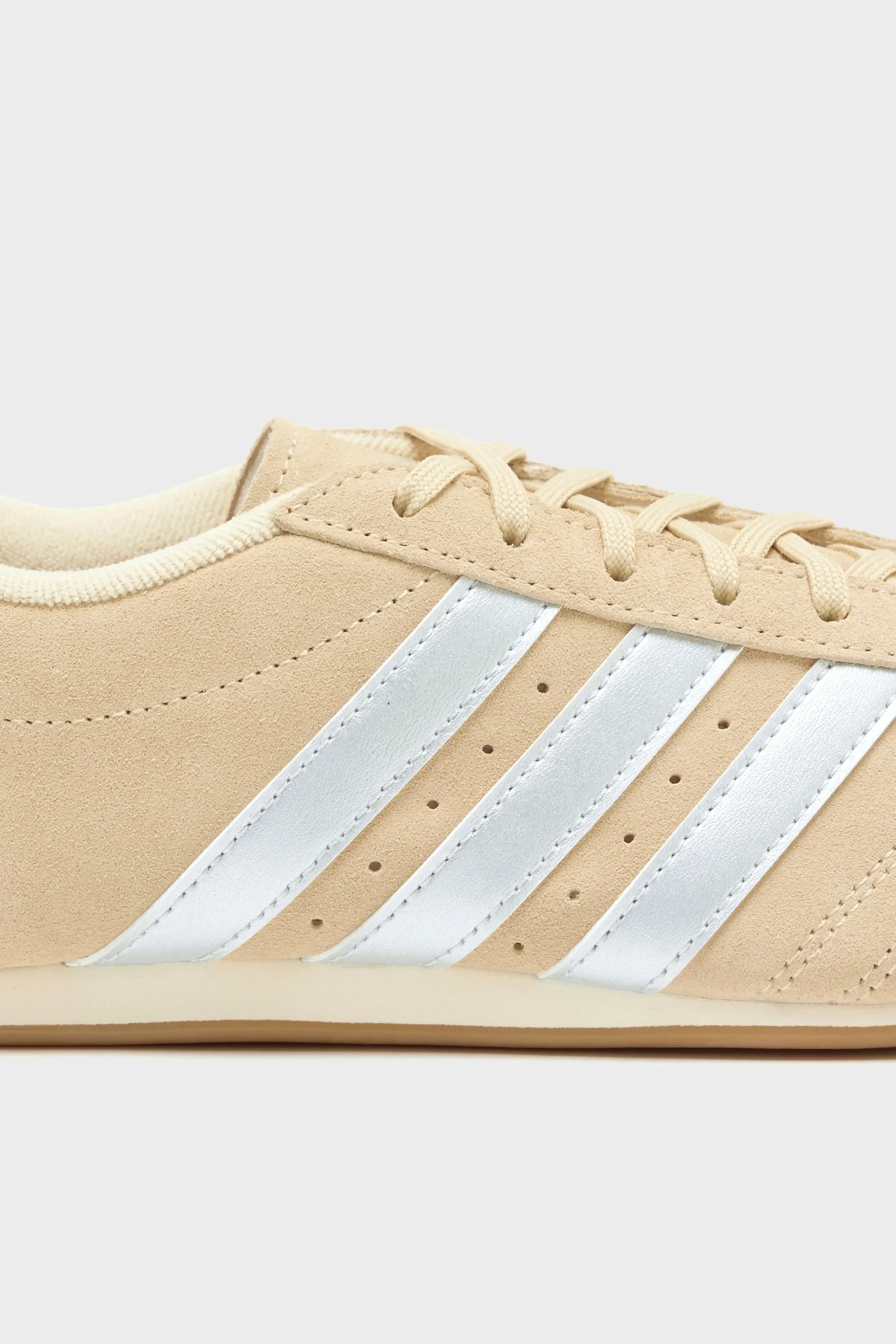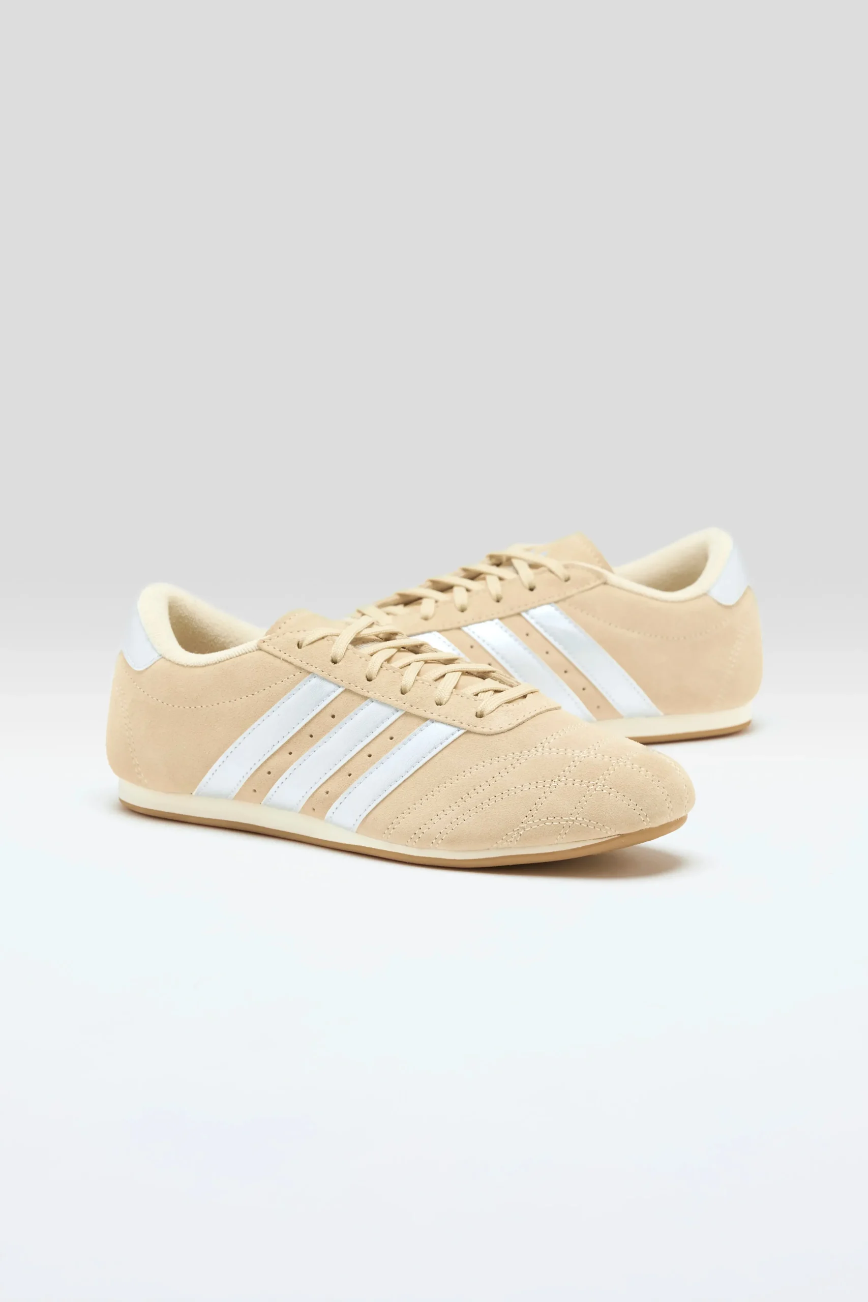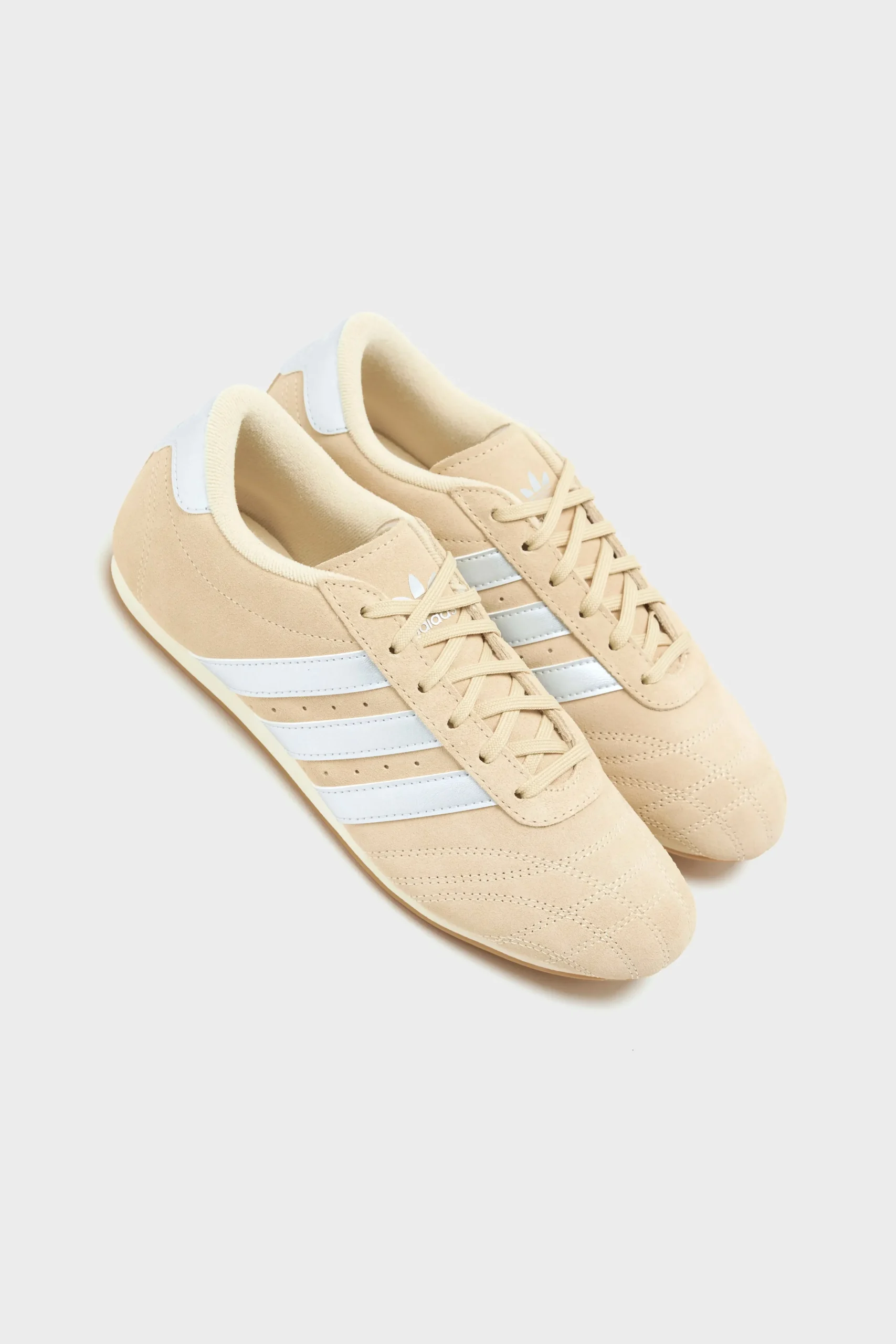 The Adidas Taekwondo Lace sneakers feature an ultra-low profile in quilted leather with metallic brand details, wedge midsole, and thin rubber outsole.
