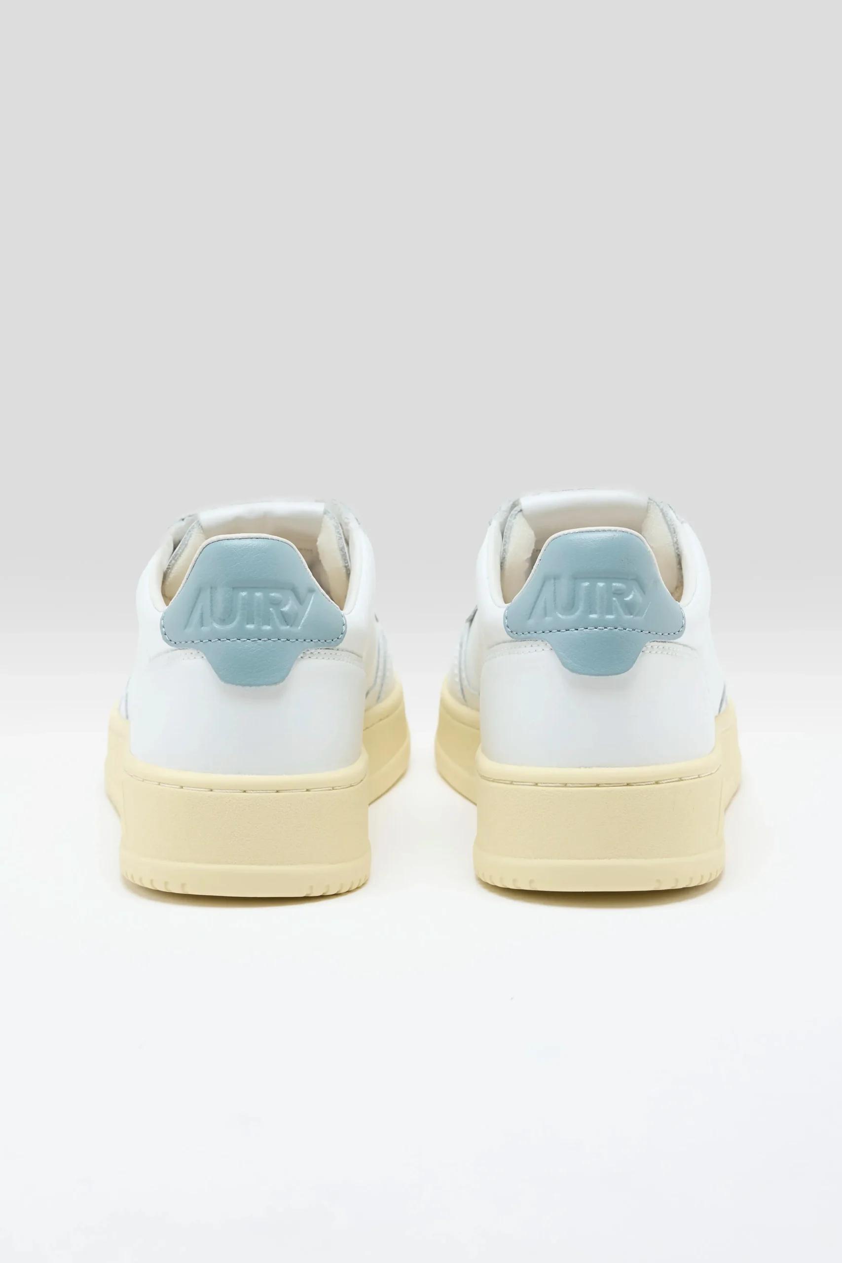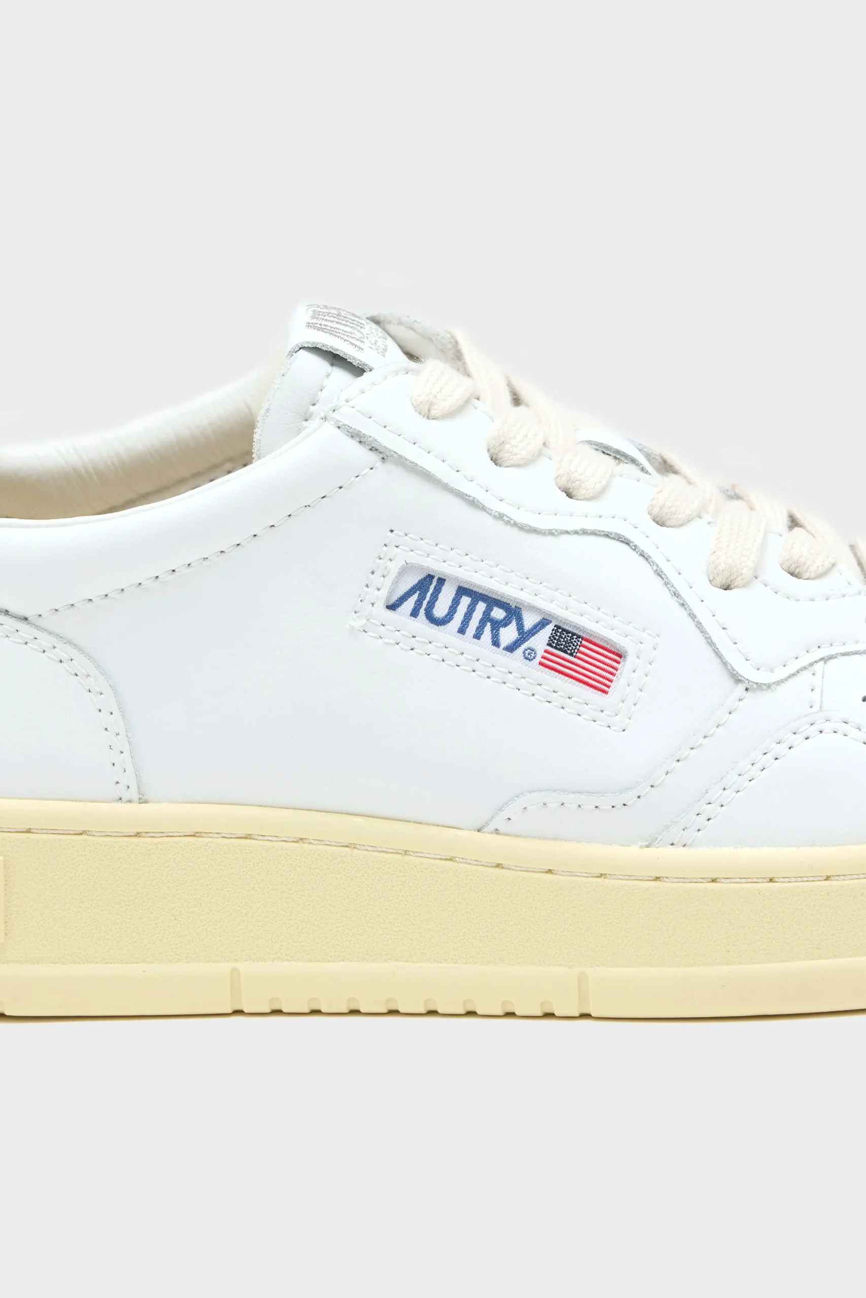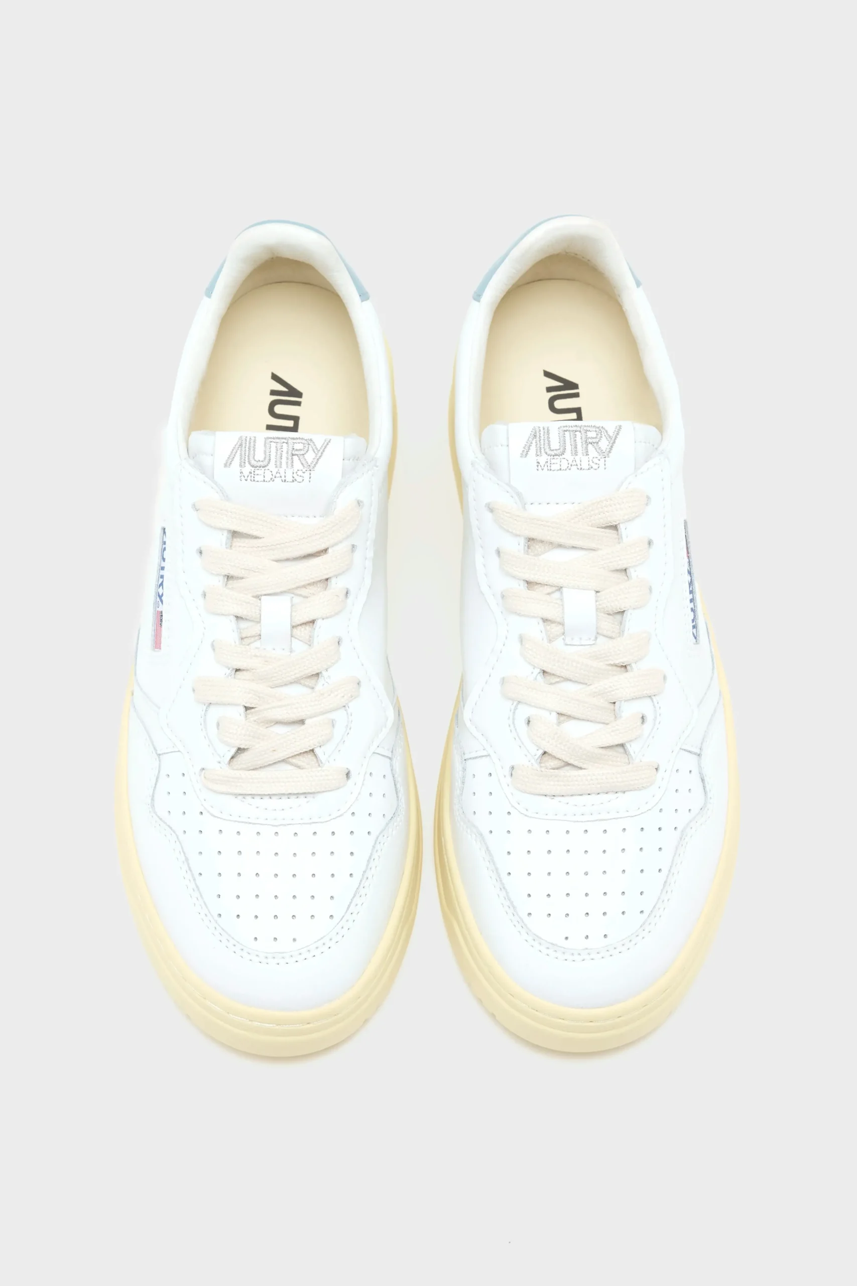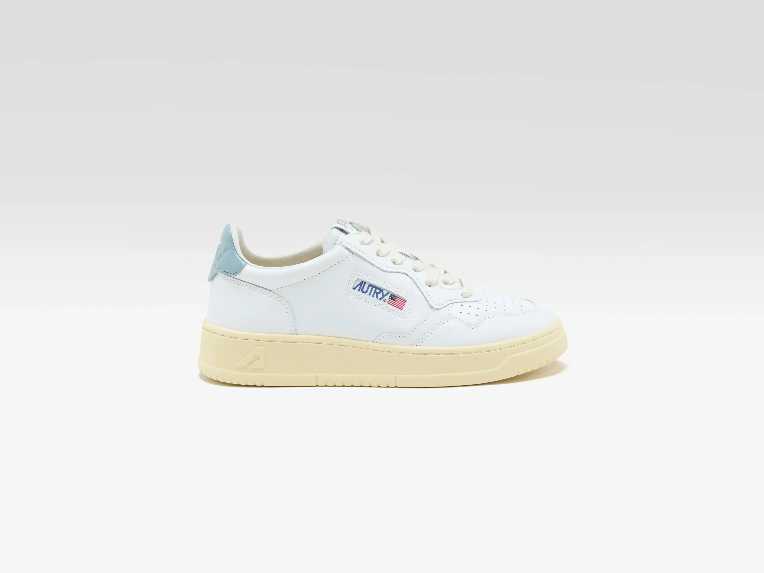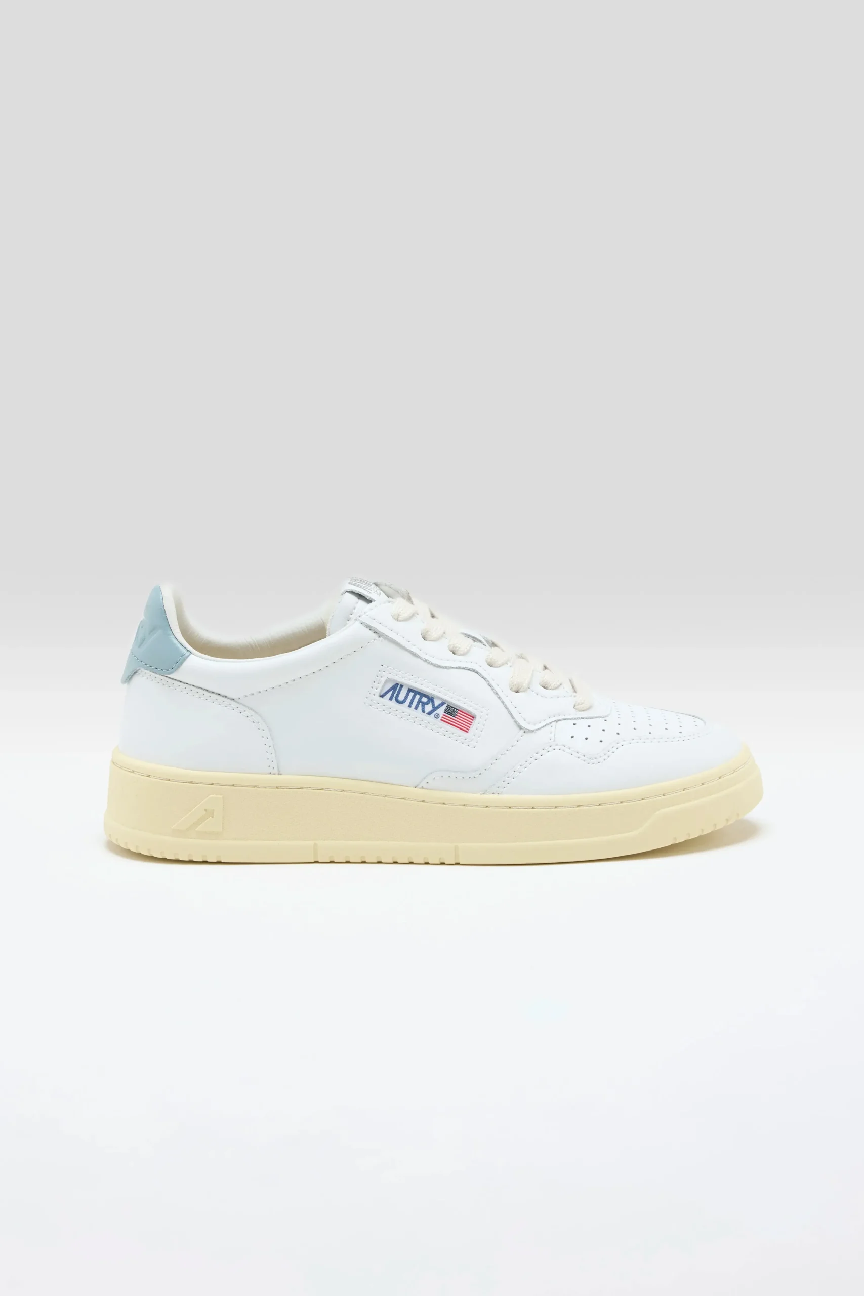 The Autry Medalist Low features a white leather upper, a perforated toe box, and a silver blue padded ankle collar.