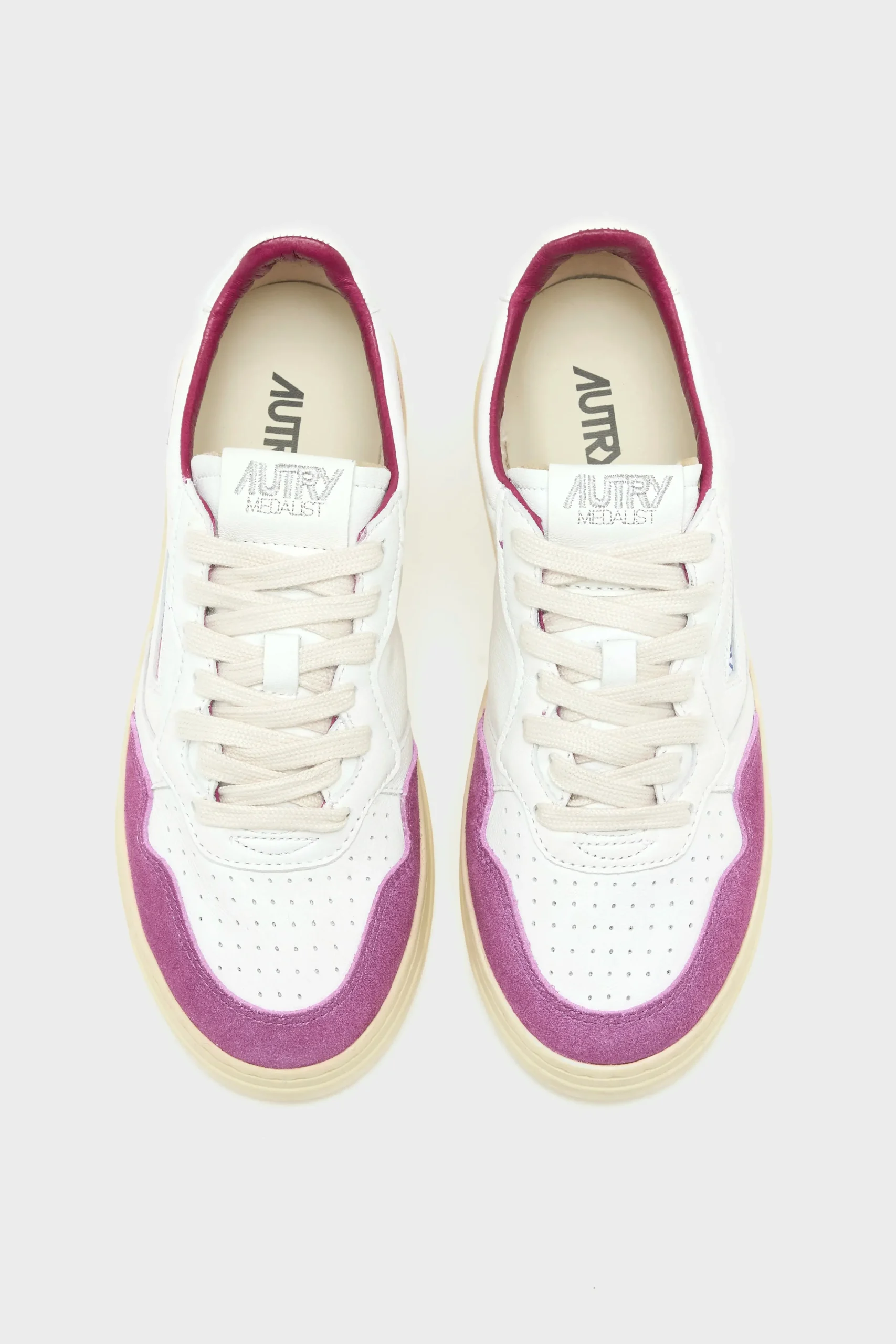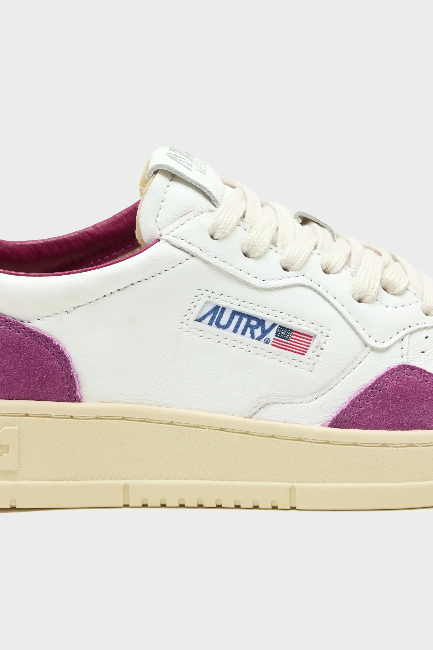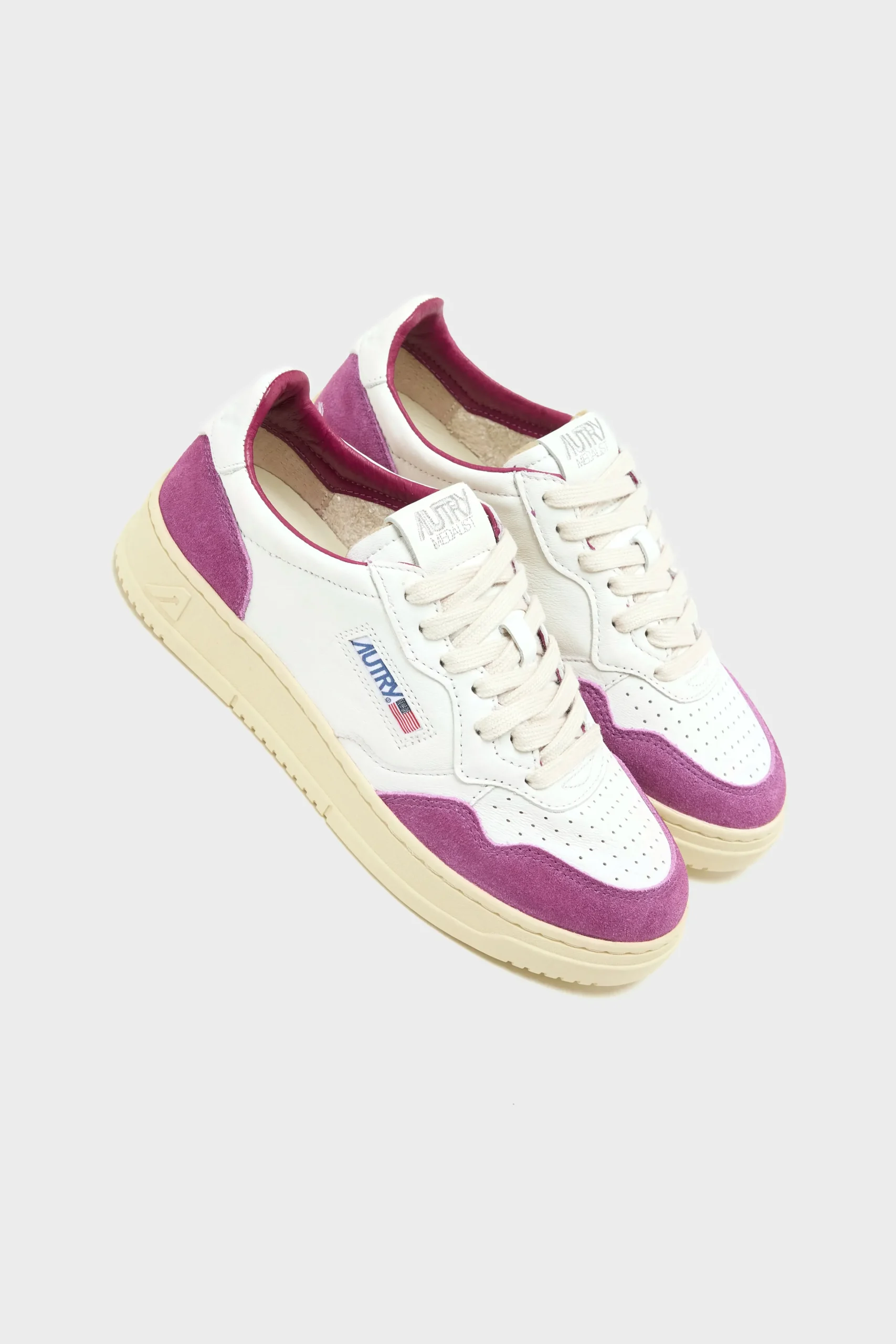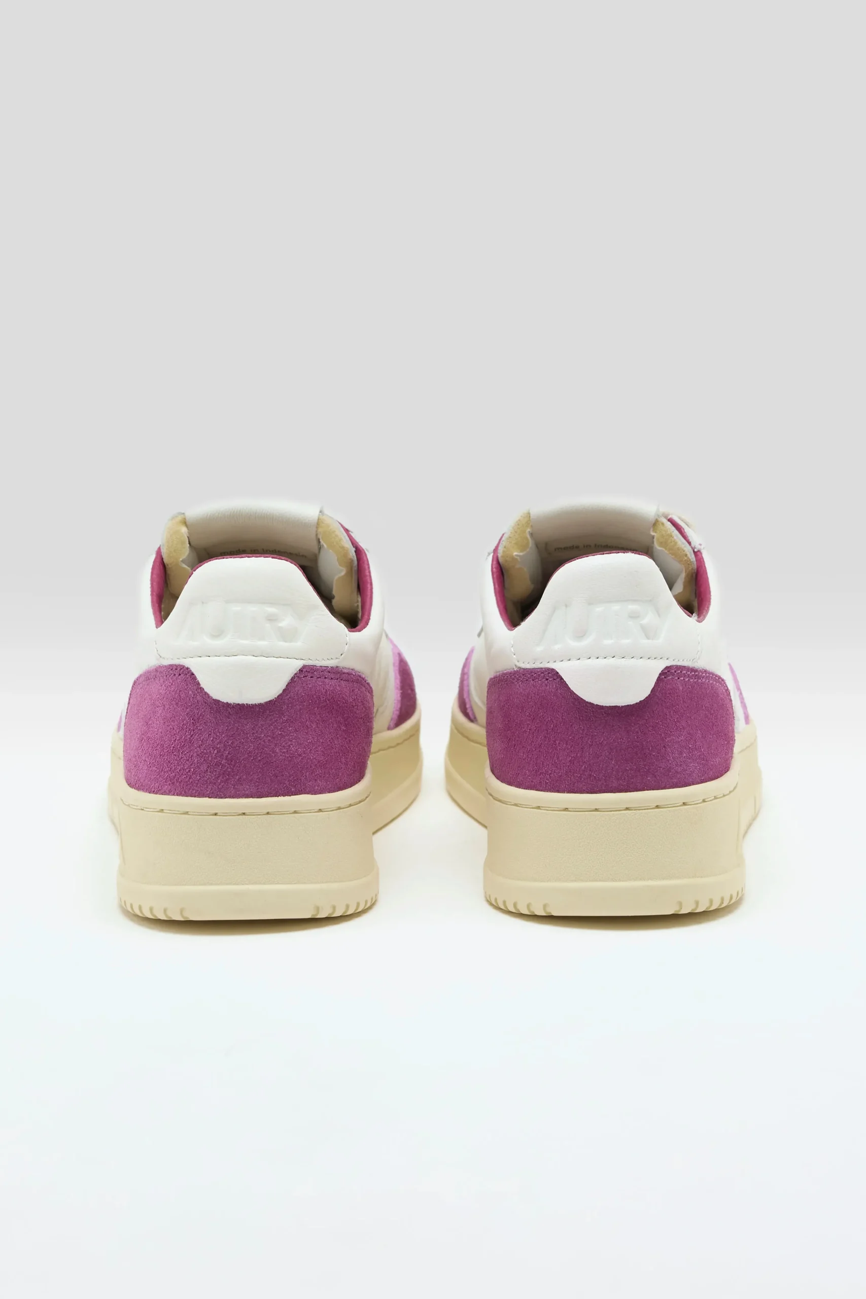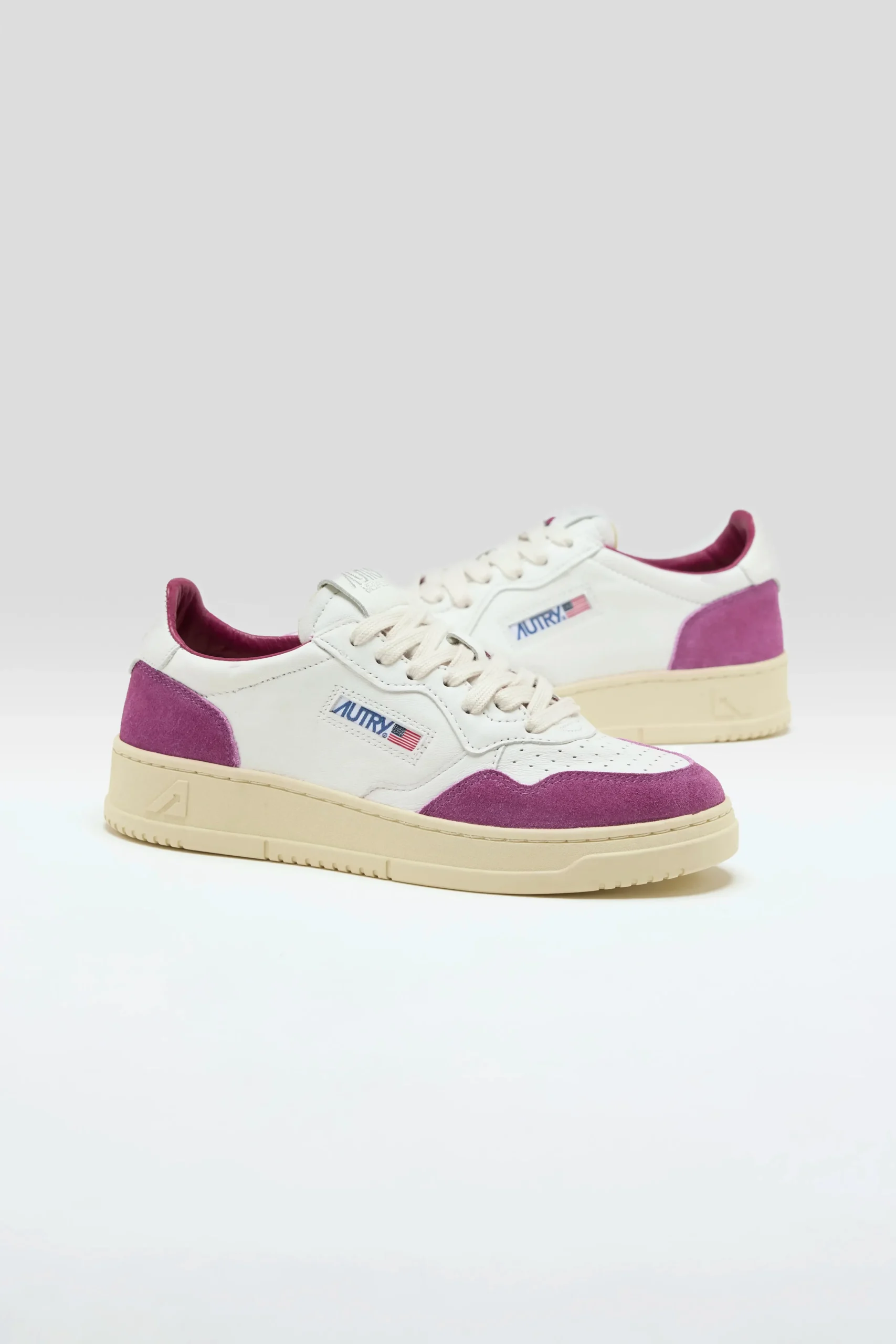 The Autry Medalist Low sneakers have a white goatskin leather upper with suede panels, featuring a handcrafted washed tr…