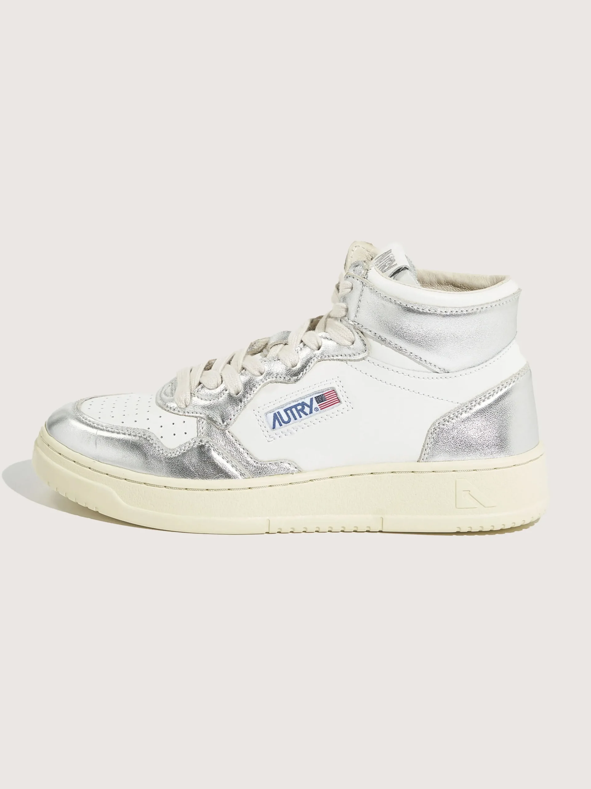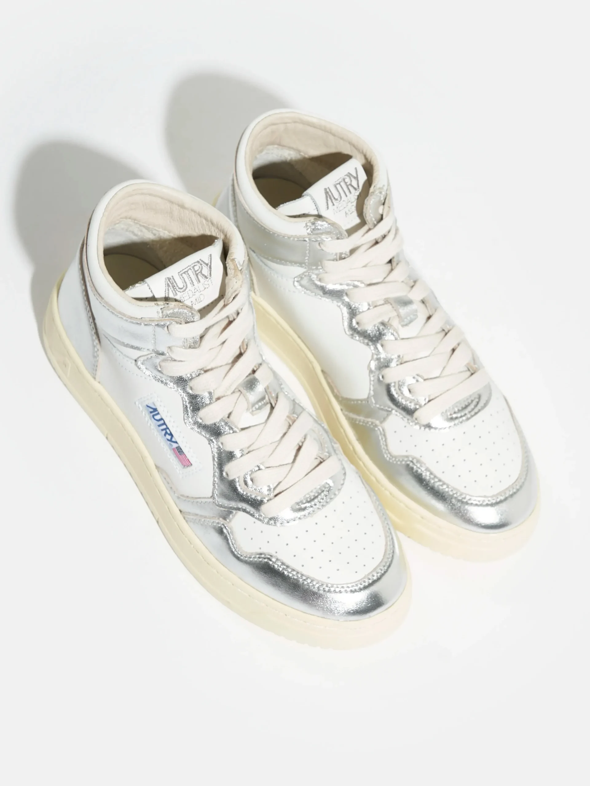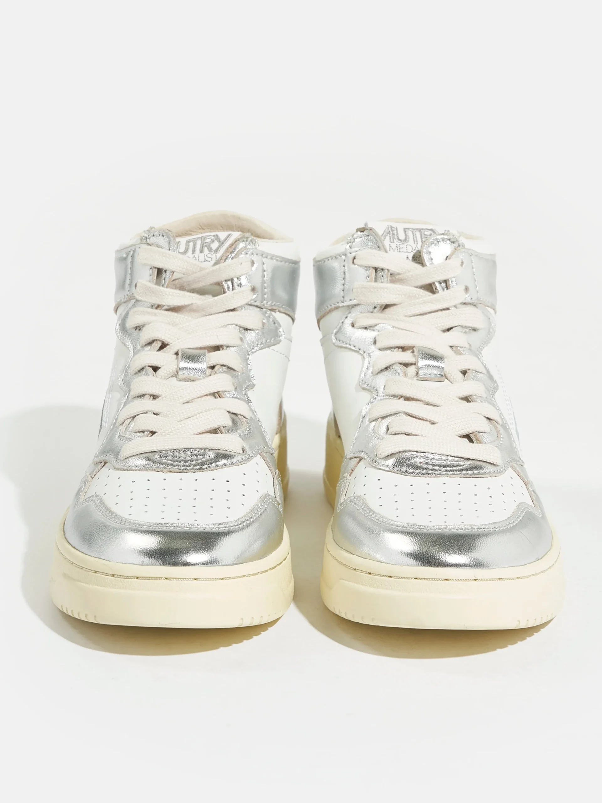 De Autry Medalist Mid bicolor mid-top sneakers hebben een bovenwerk van zilver en wit gelamineerd leder met een zool van natuurlijk rubber. Normale pasvormZoolhoogte: 2,5 – 3,5 cmStijl: AUMW-WB18Kleur: White and silver bicolor leather