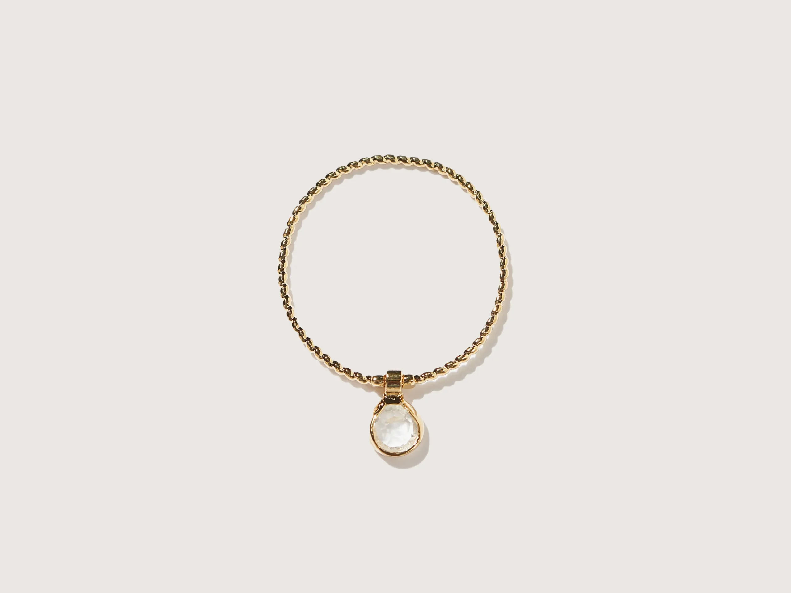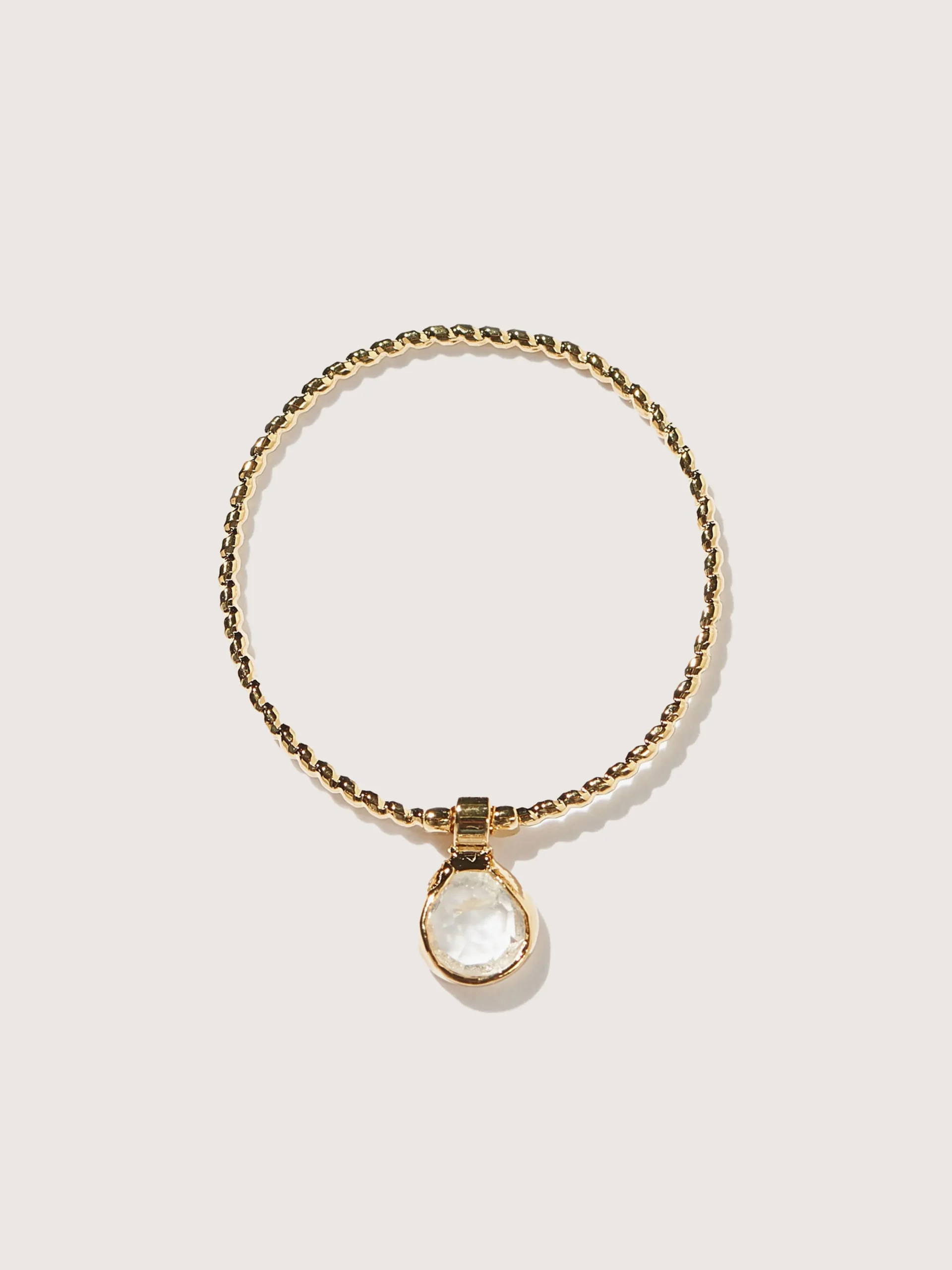 De Deva ring is een delicaat gedraaide vergulde band met een glinsterende kristallen hanger die sierlijk in het midden bungelt.r