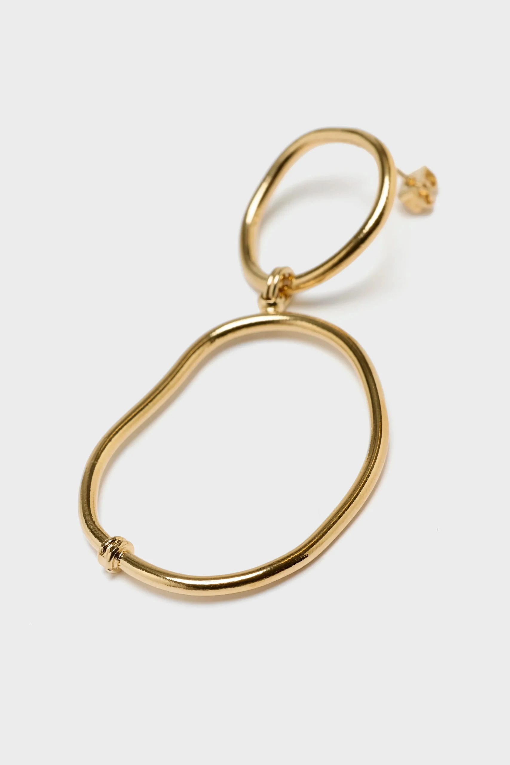 The BDM Studio Victoire Pendant Earrings feature gold-plated irregular circles suspended from stud posts, with larger irregular oval hoops connected by a single chain link allowing for movement.