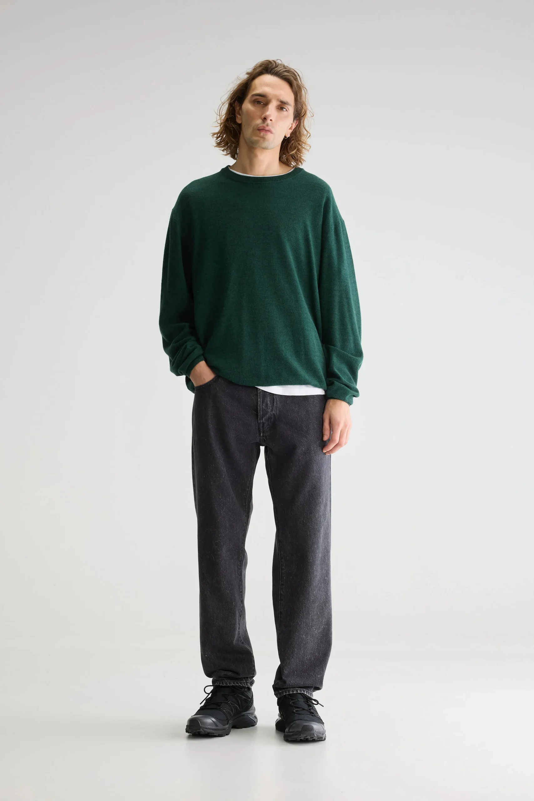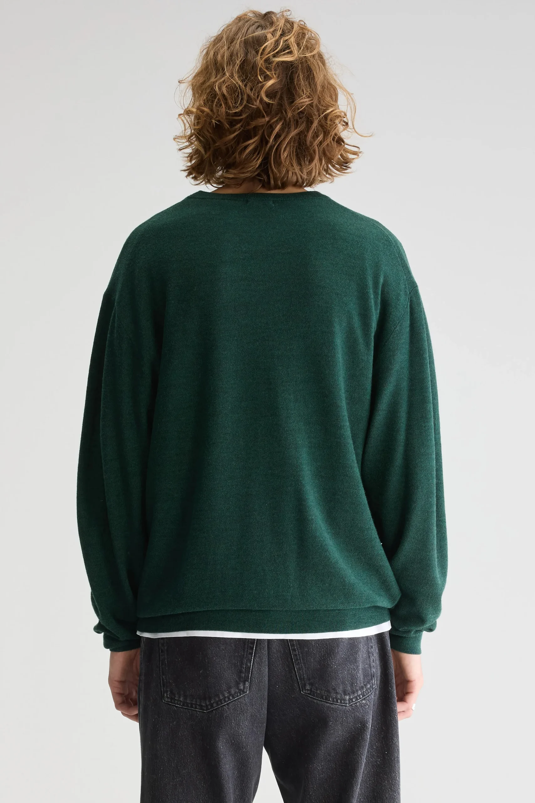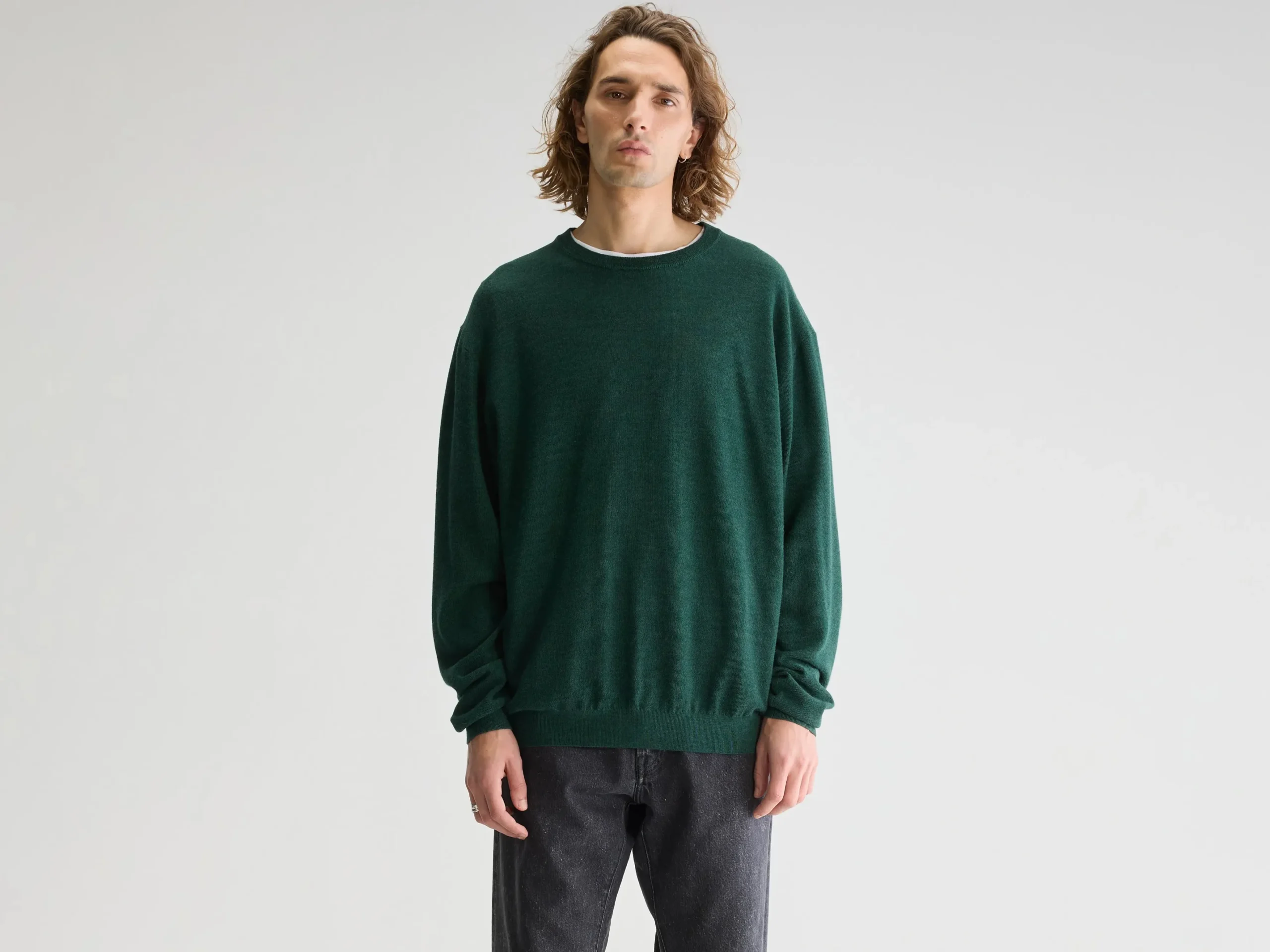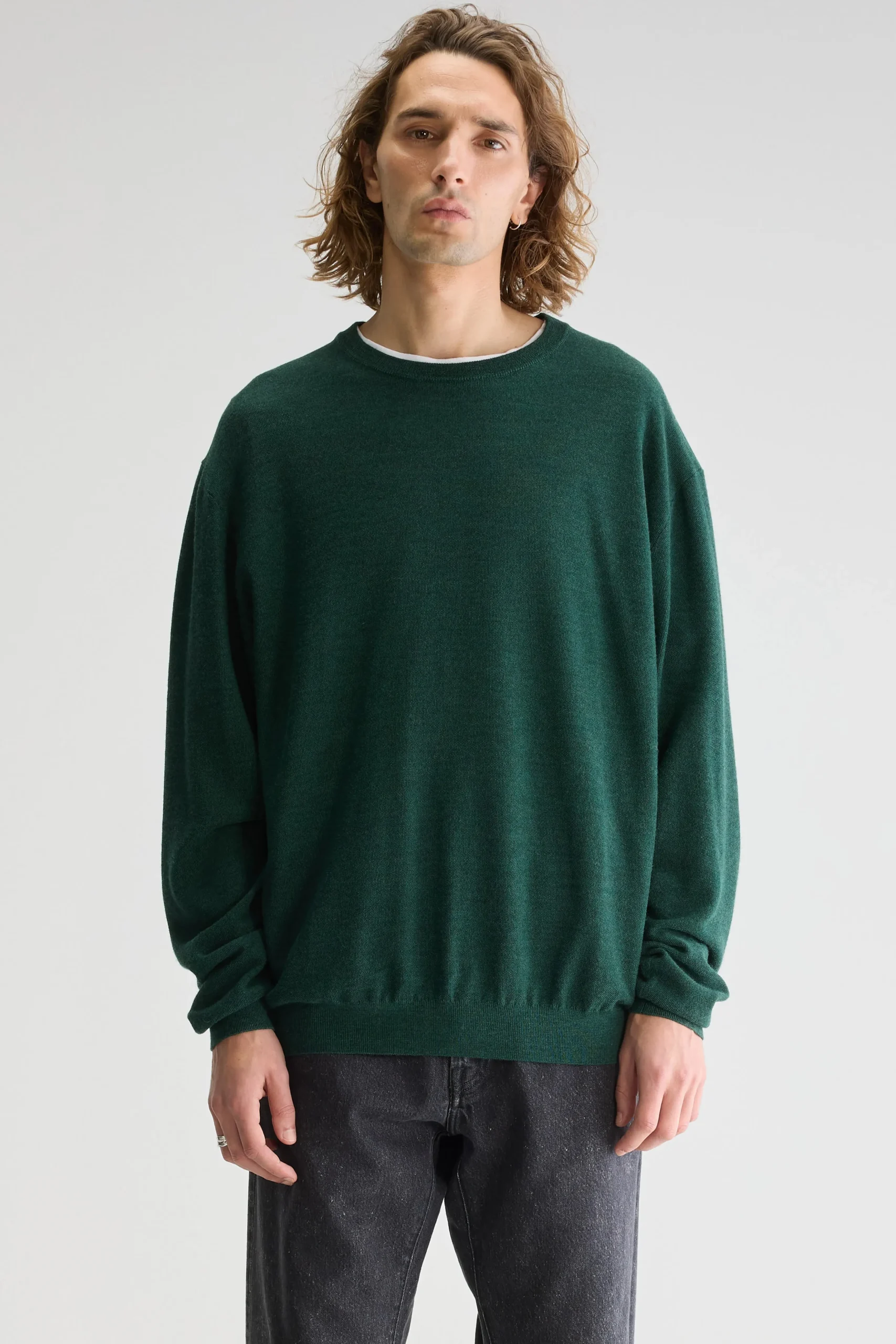 Losse trui met ronde hals, gebreid in een rijststeek van saliegroene merinowol.Losse pasvorm Geribde ronde hals Lange mo…