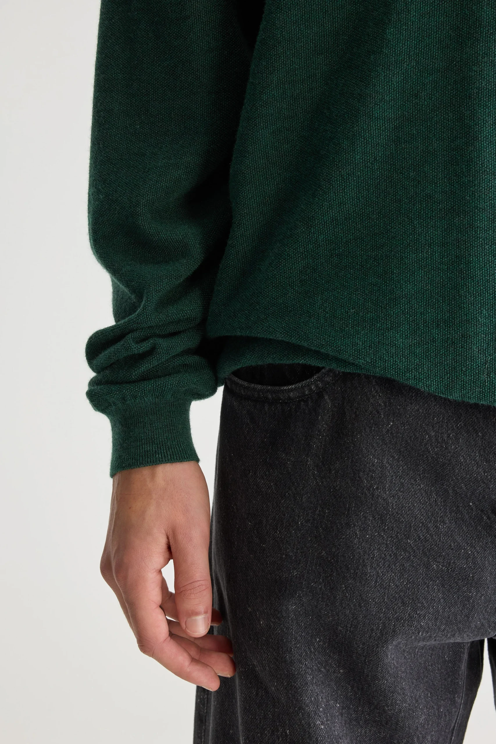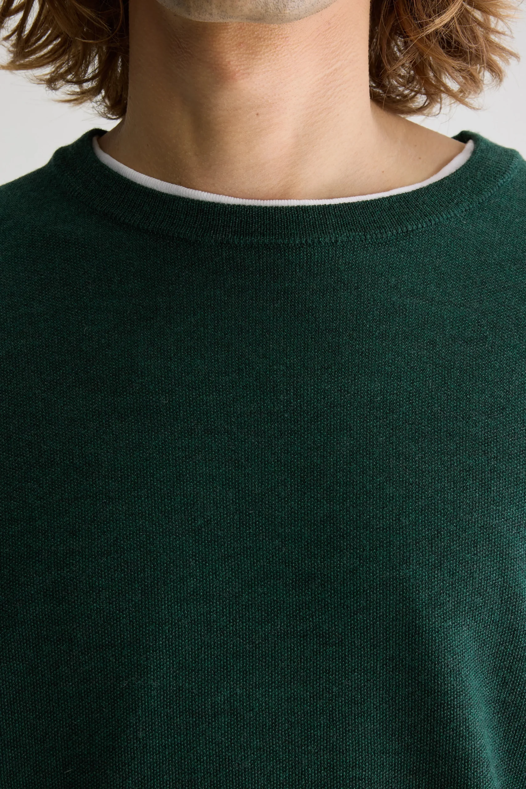 Losse trui met ronde hals, gebreid in een rijststeek van saliegroene merinowol.Losse pasvorm Geribde ronde hals Lange mouwen RijststekenGeribde boorden Volledig getailleerdFine gauge