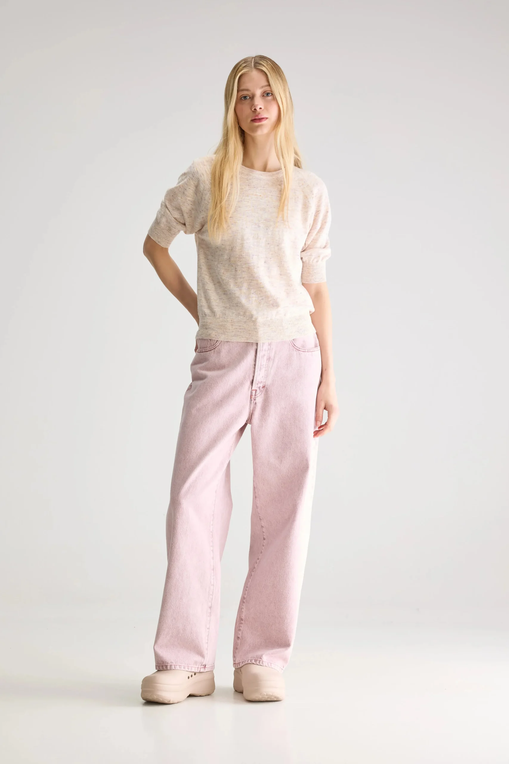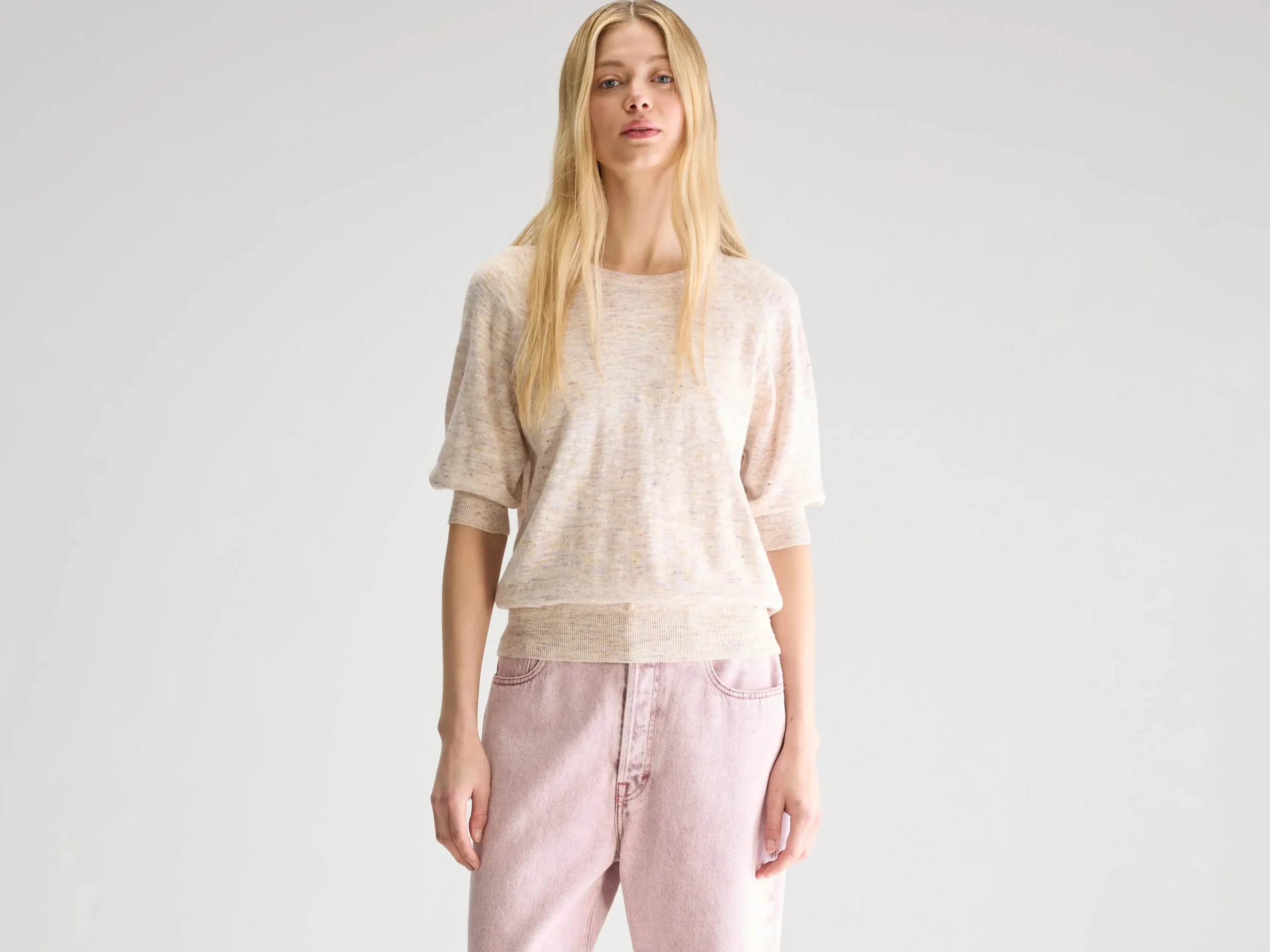 Klassieke, gespikkelde gebreide trui met wijde hals en 3/4-mouwen.Klassieke pasvorm3/4-mouwenWijde, ronde halsZacht, m…