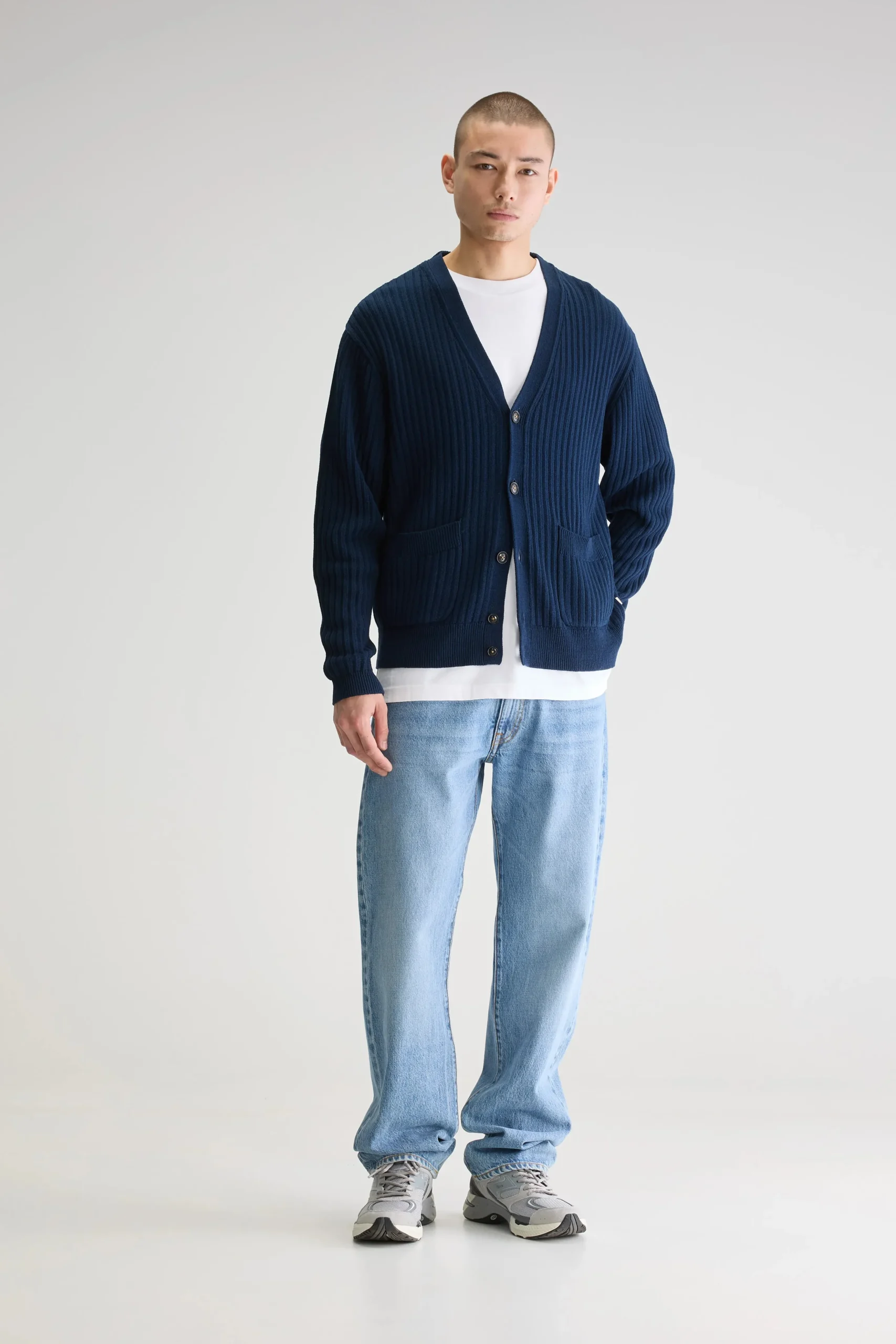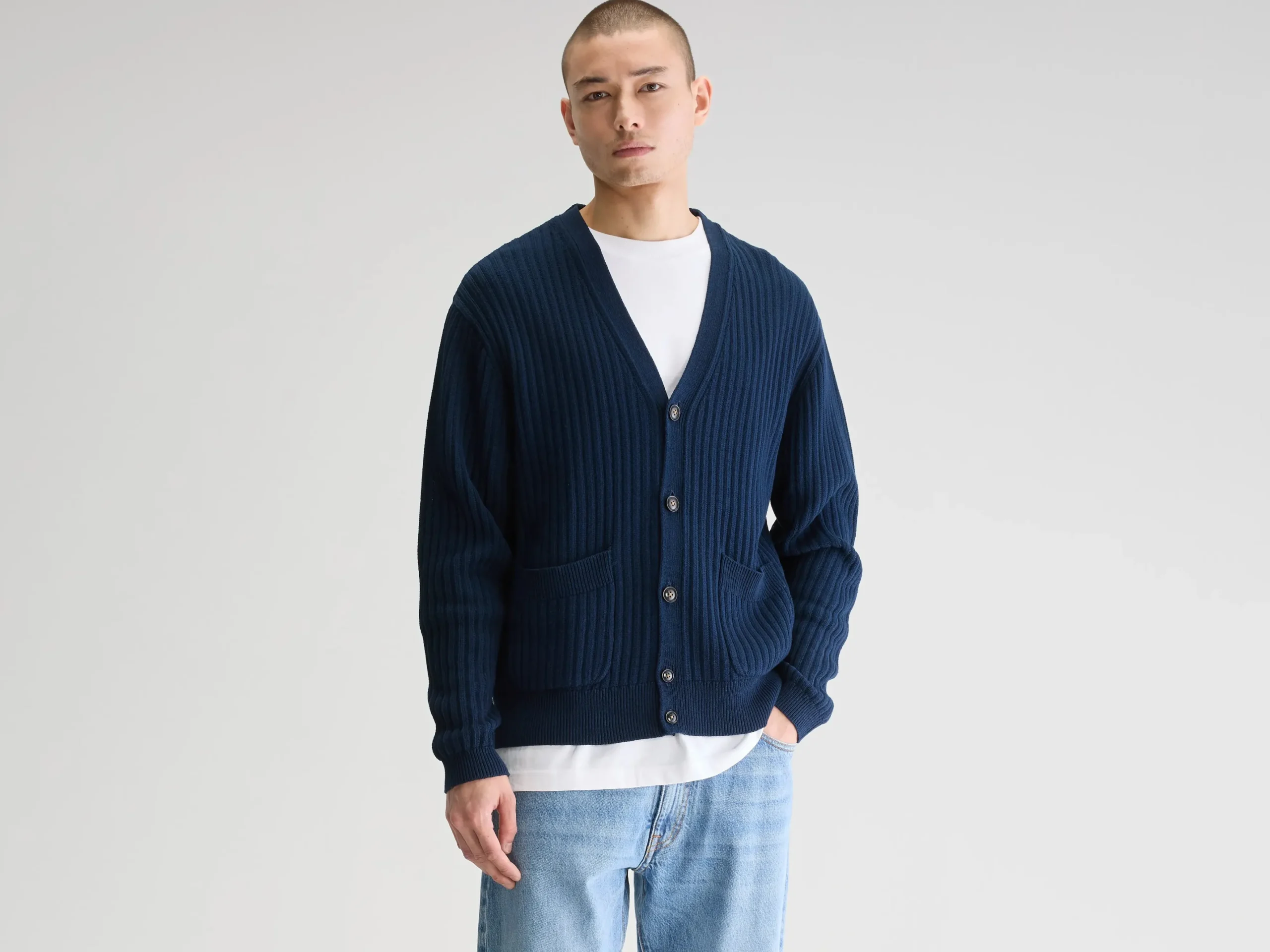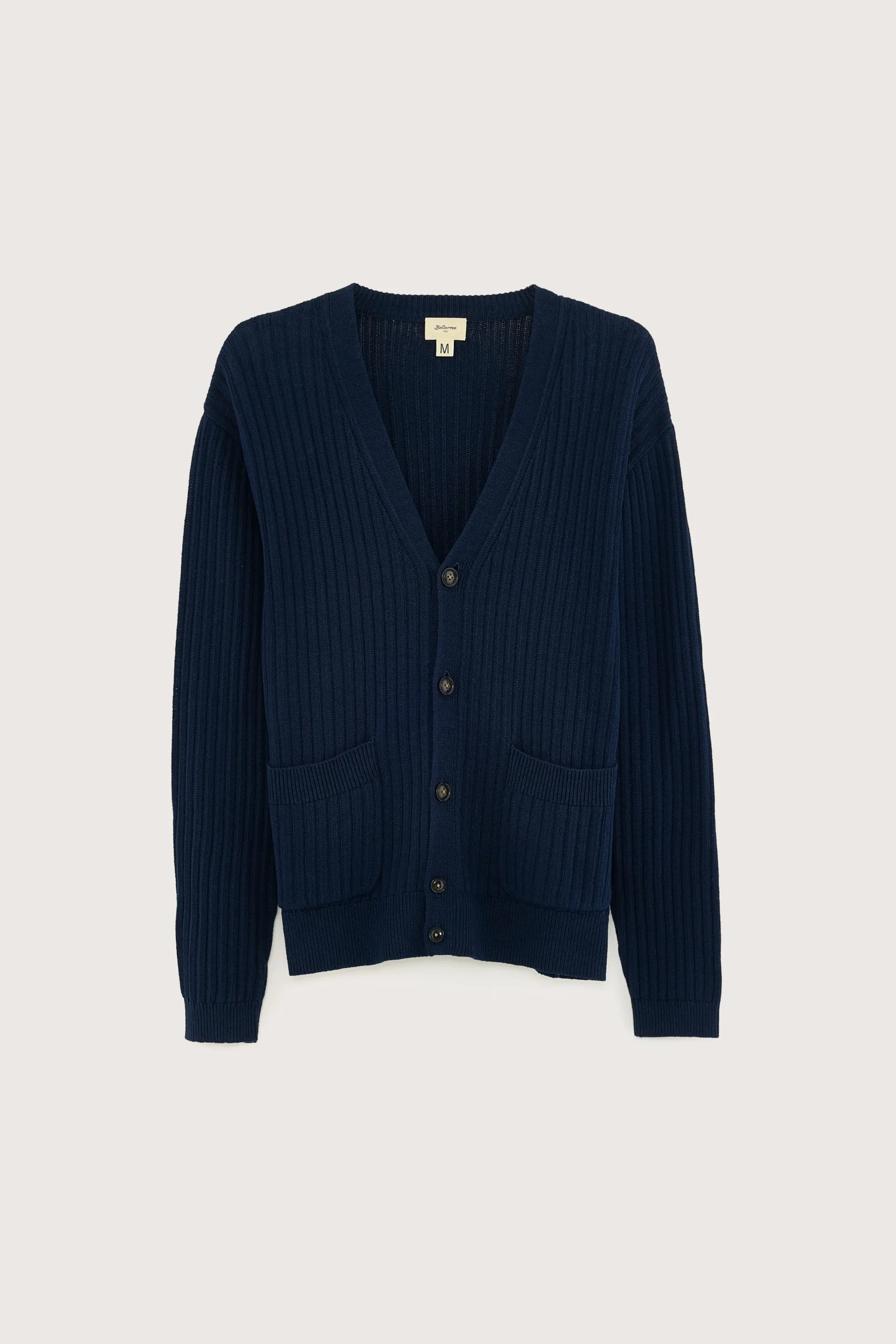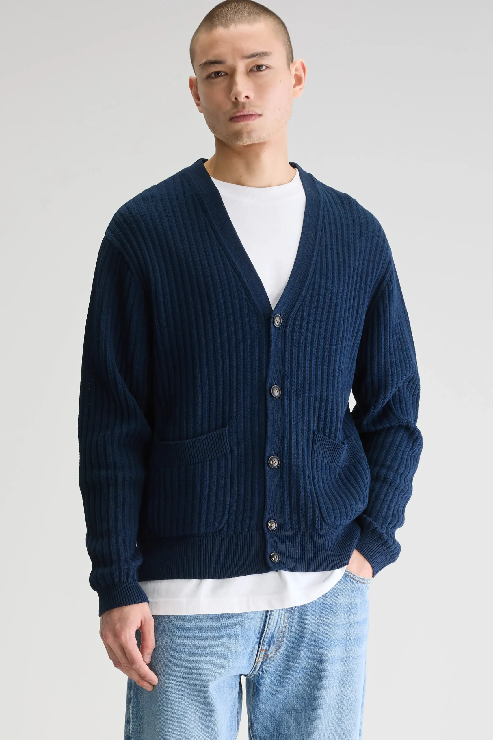 Losse cardigan met v-hals en gepatchte zakken, gemaakt van zachte, marineblauwe katoen.Losse pasvormV-halsLange mouwen Gepatchte zakken Geribde randen Heavy gauge