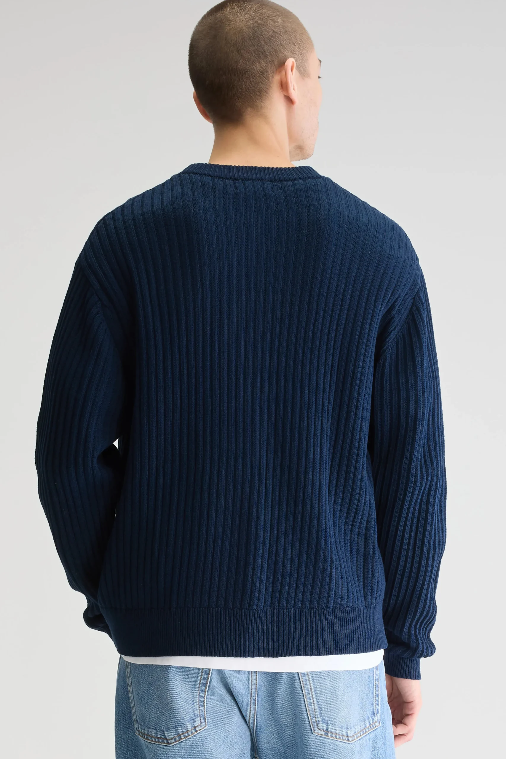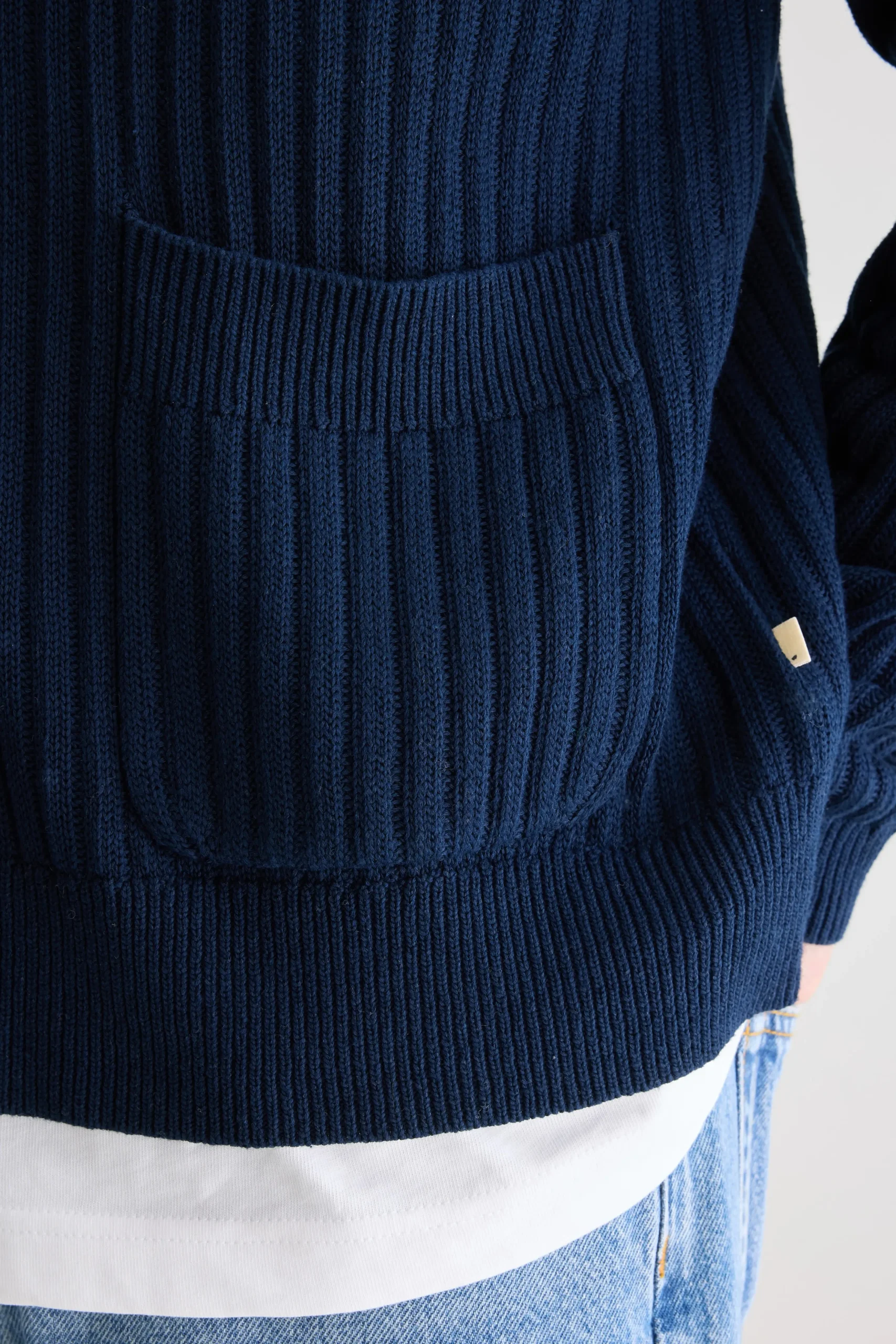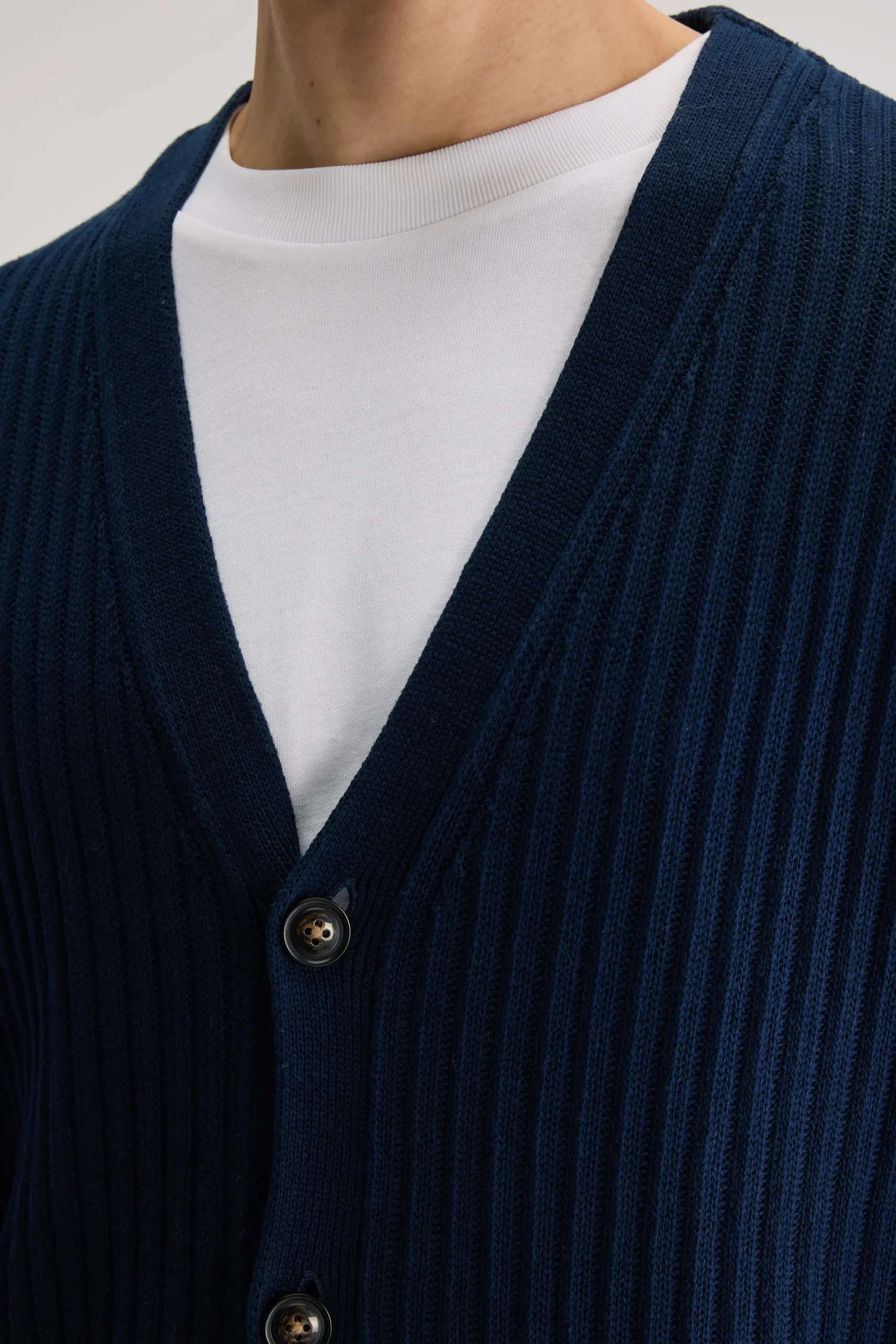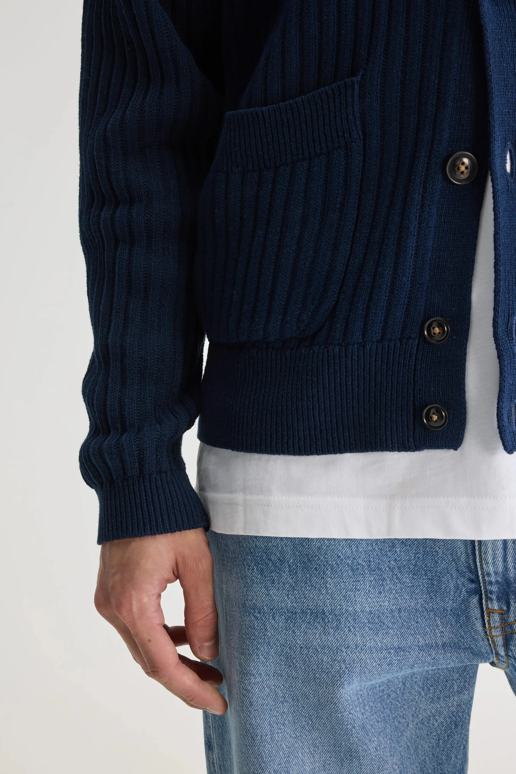 Losse cardigan met v-hals en gepatchte zakken, gemaakt van zachte, marineblauwe katoen.Losse pasvormV-halsLange mouwen Gepatchte zakken Geribde randen Heavy gauge