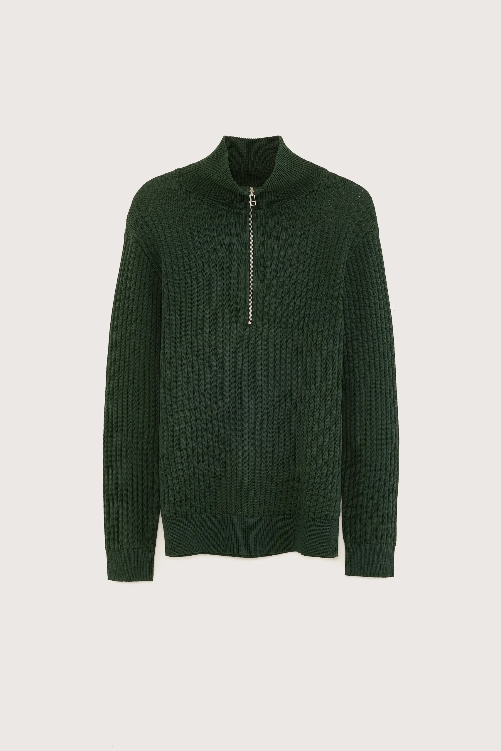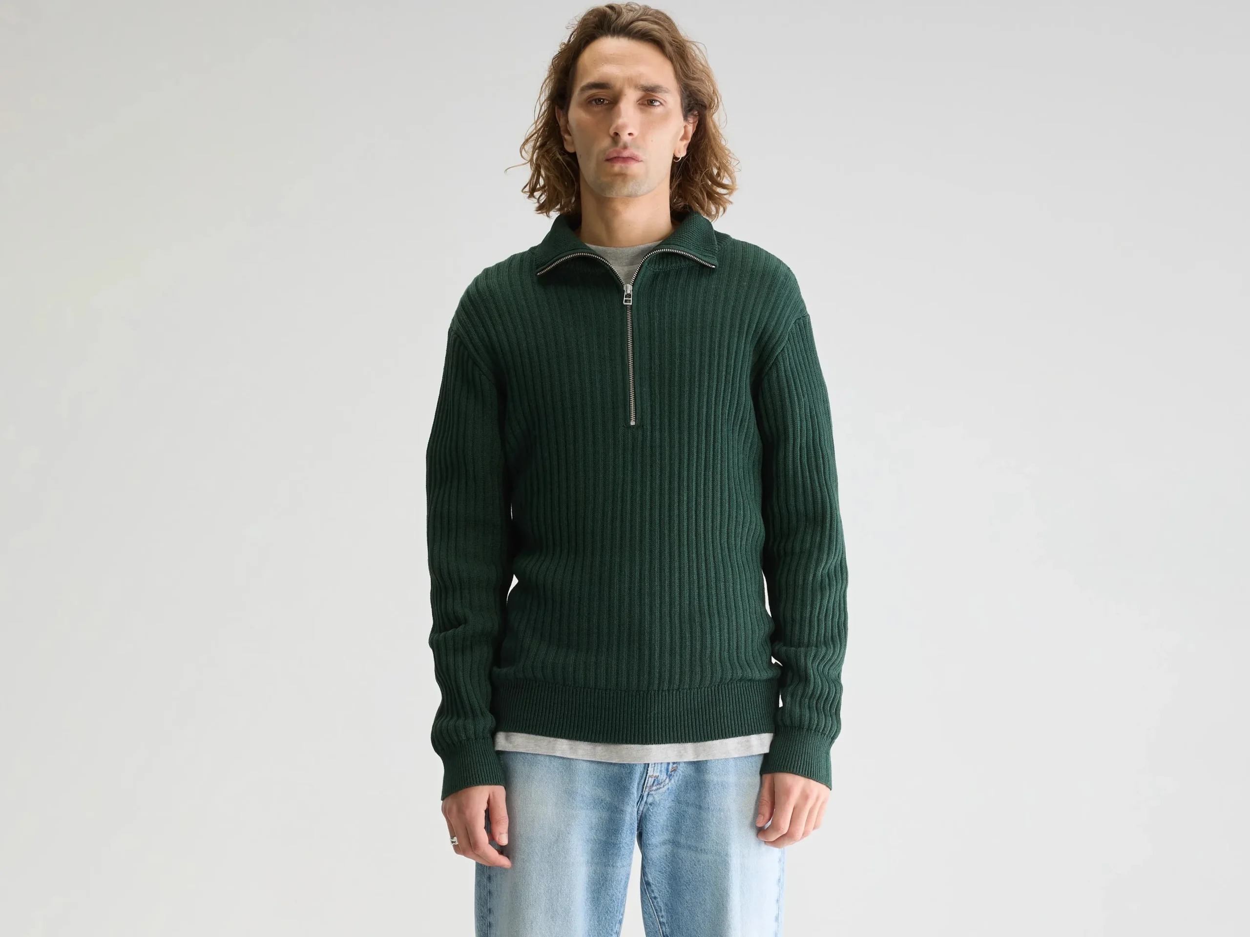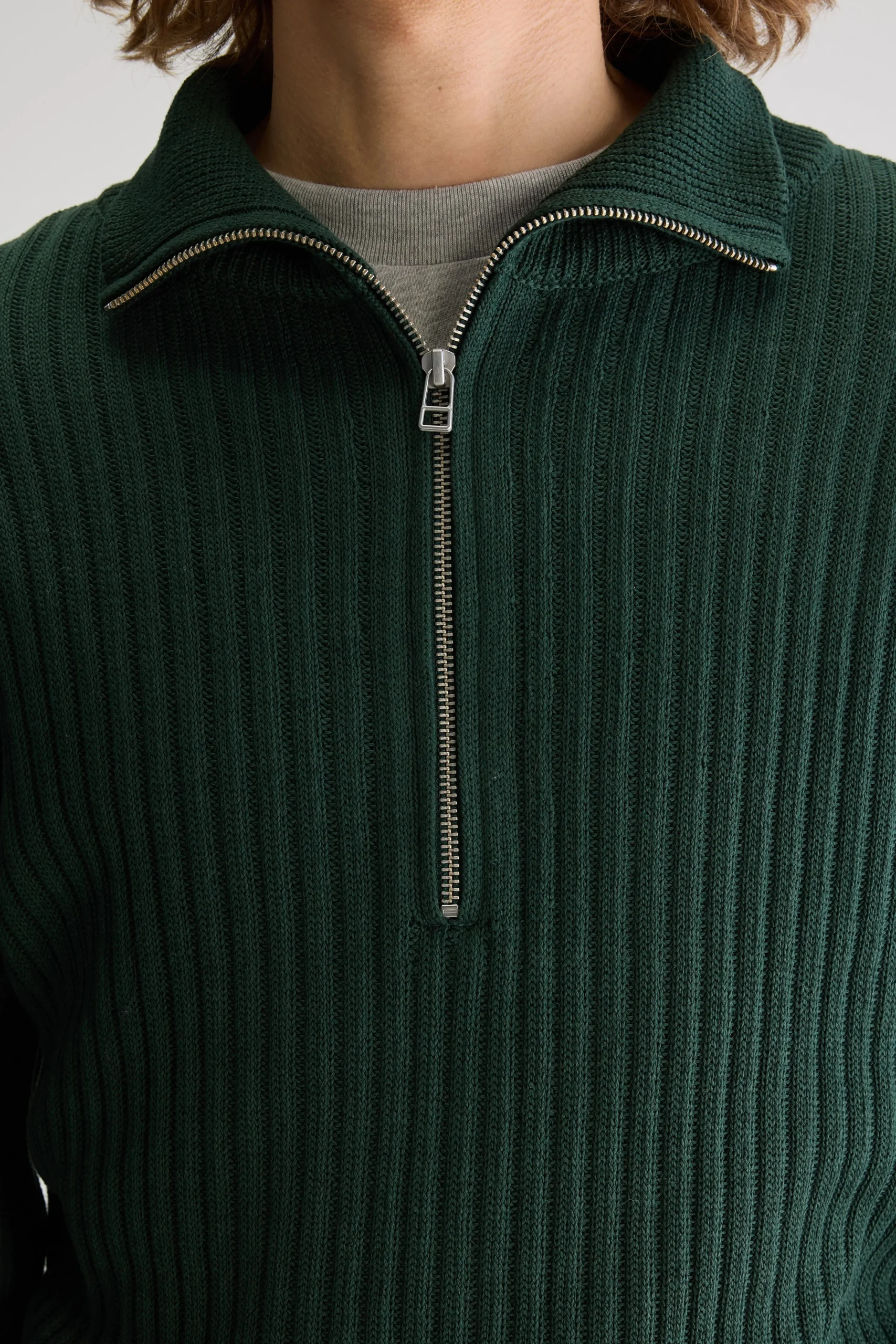 Losse trui met halve ritssluiting van ribgebreid, thijmgroen katoen.Losse pasvorm Opstaande kraag met halve ritssluitingLange mouwen Laaghangende schoudersGebreid ribpatroon Medium gauge