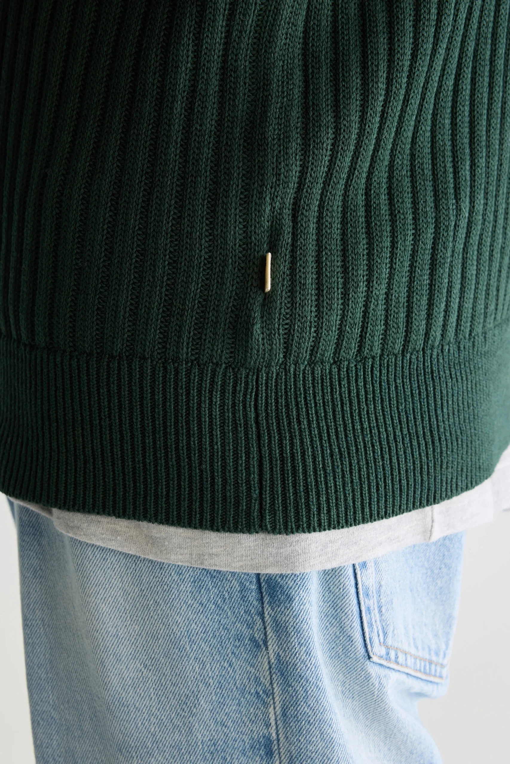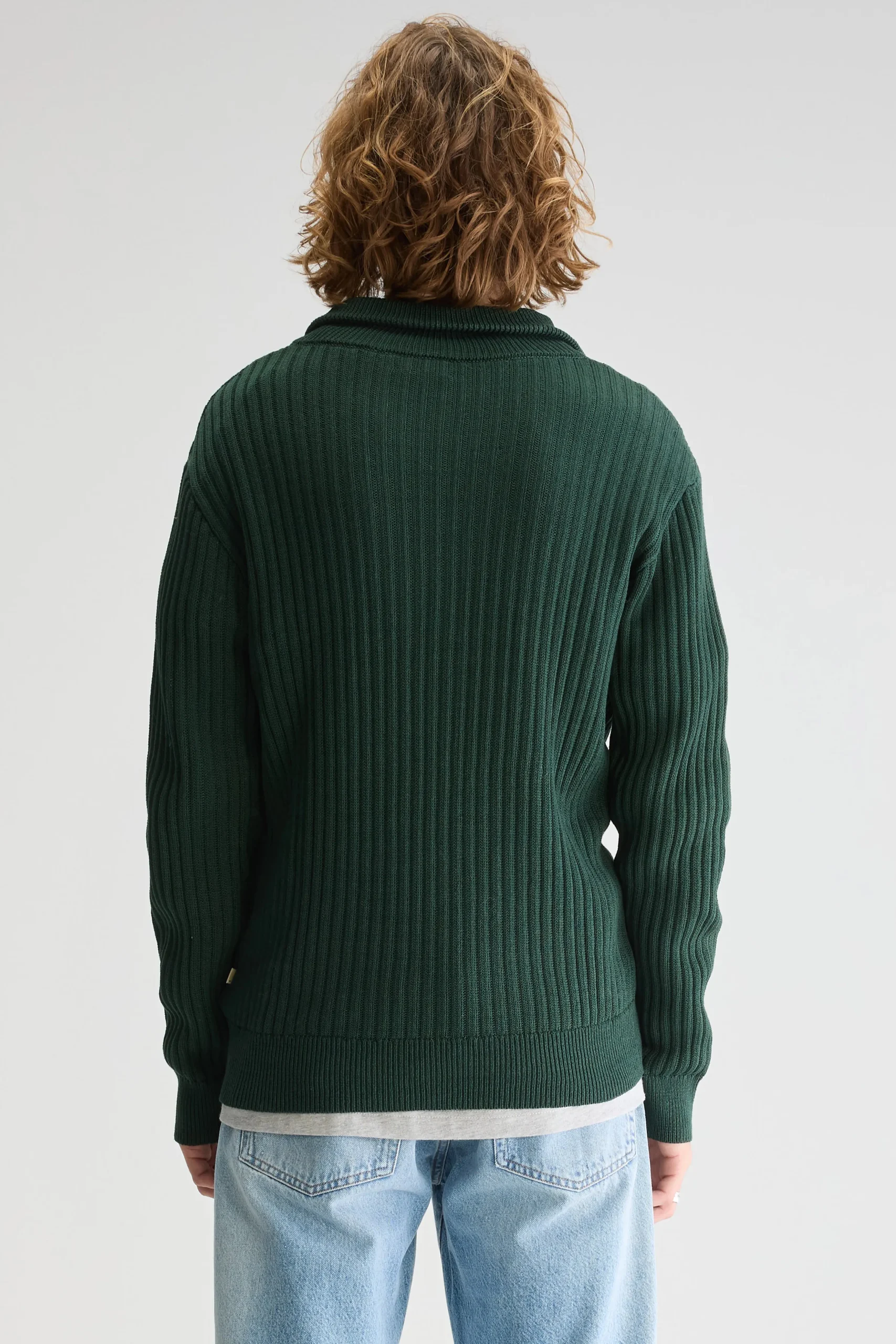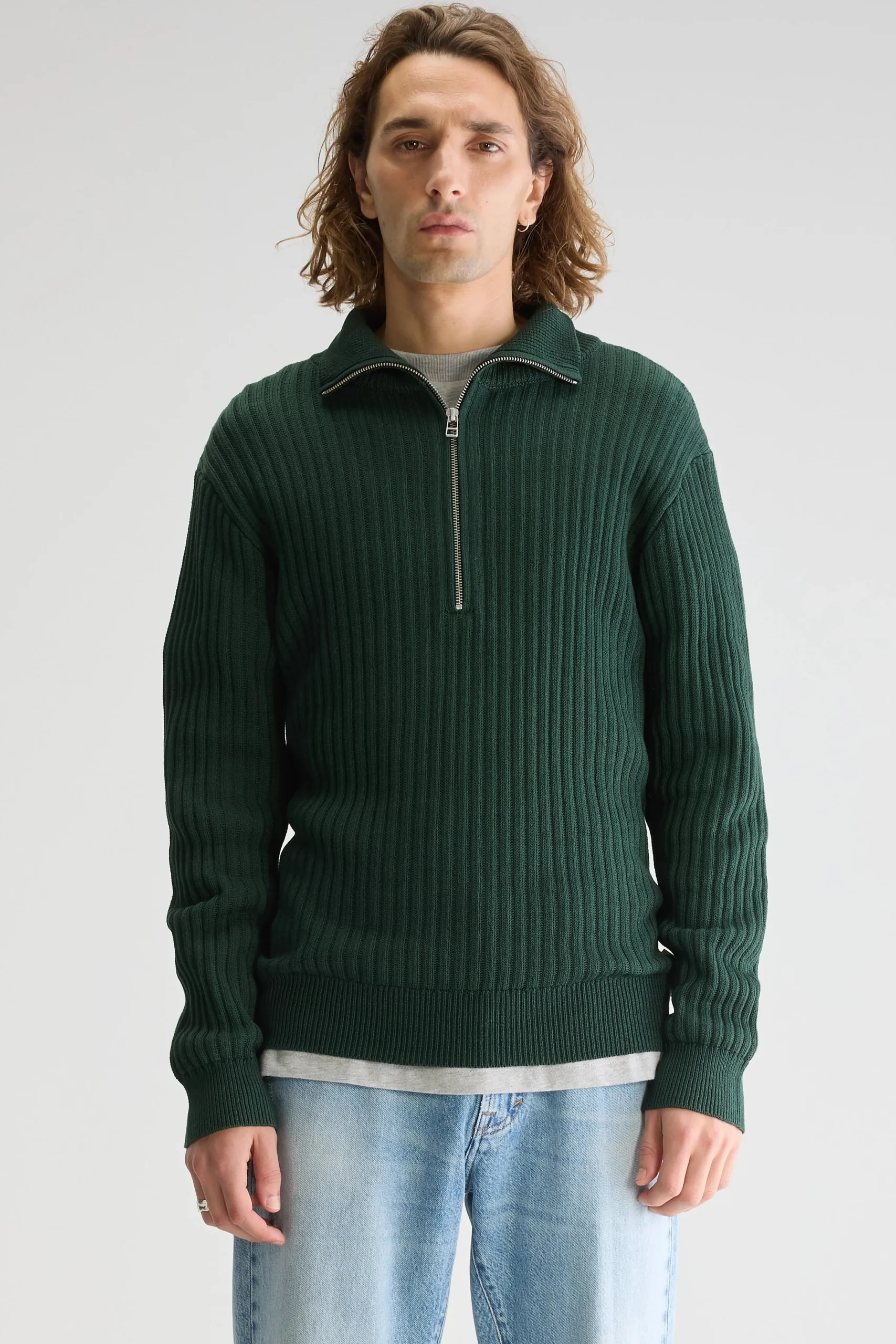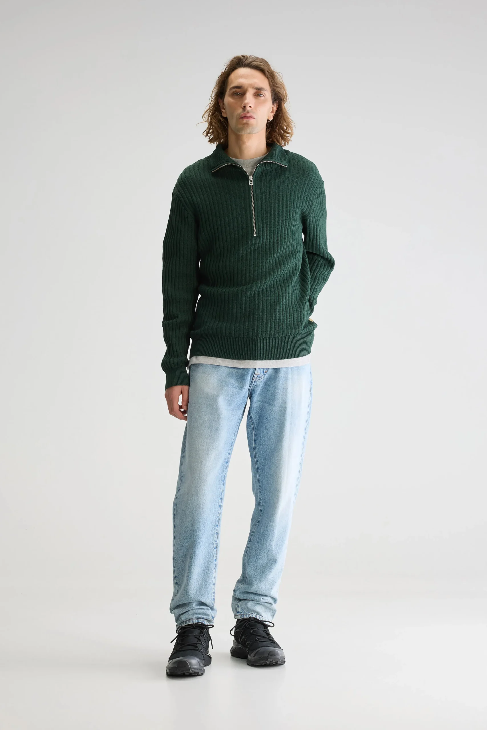 Losse trui met halve ritssluiting van ribgebreid, thijmgroen katoen.Losse pasvorm Opstaande kraag met halve ritssluitingLange mouwen Laaghangende schoudersGebreid ribpatroon Medium gauge