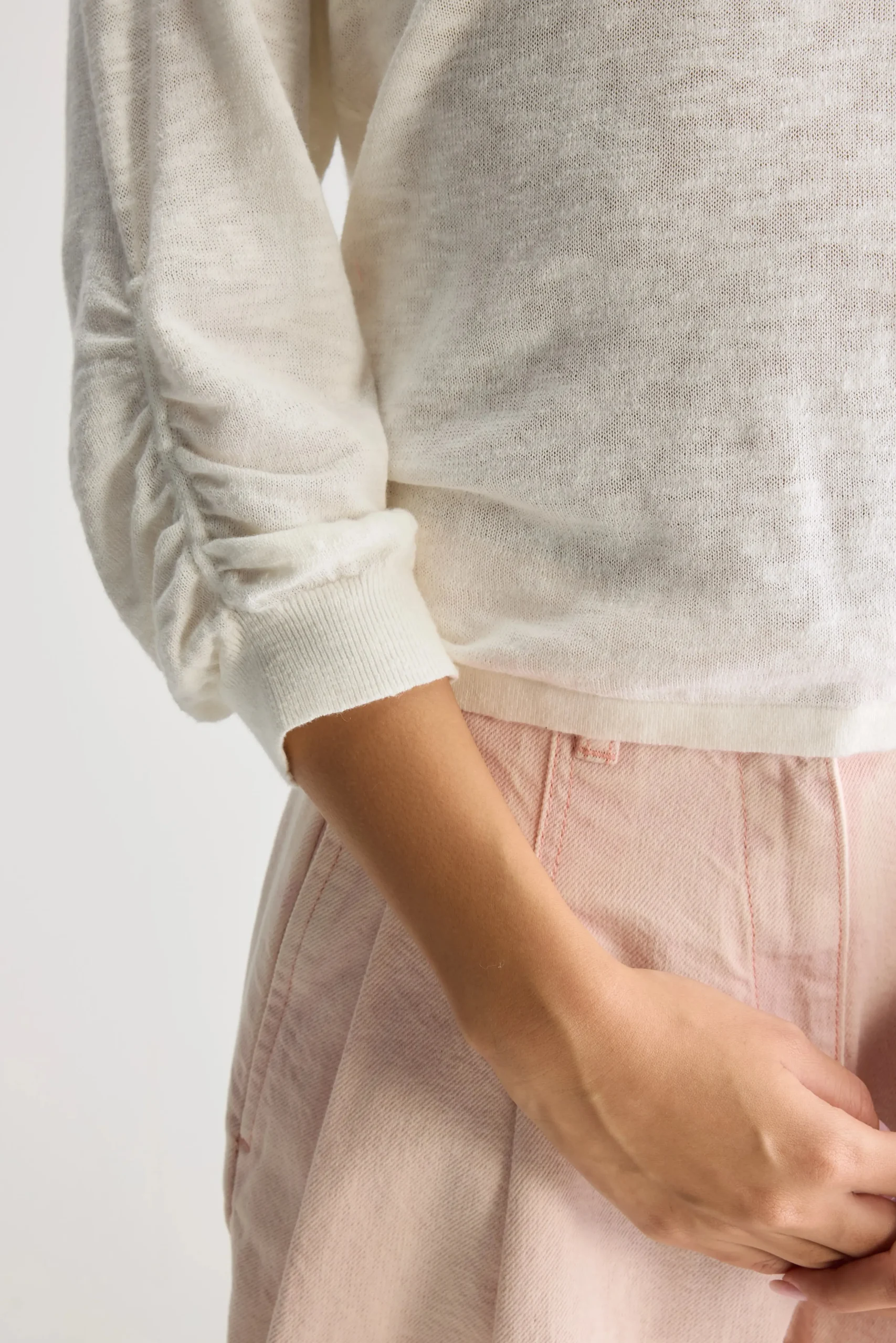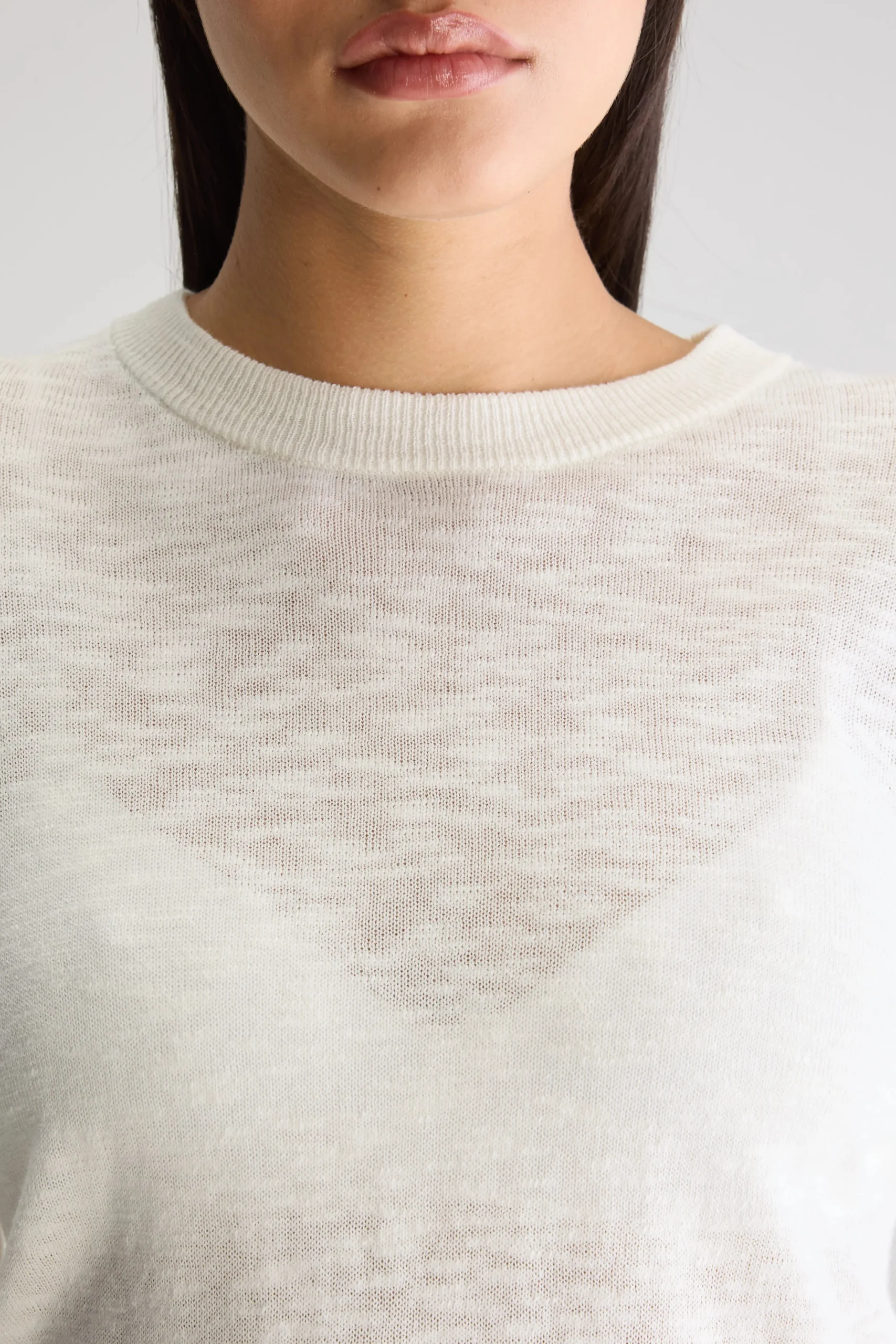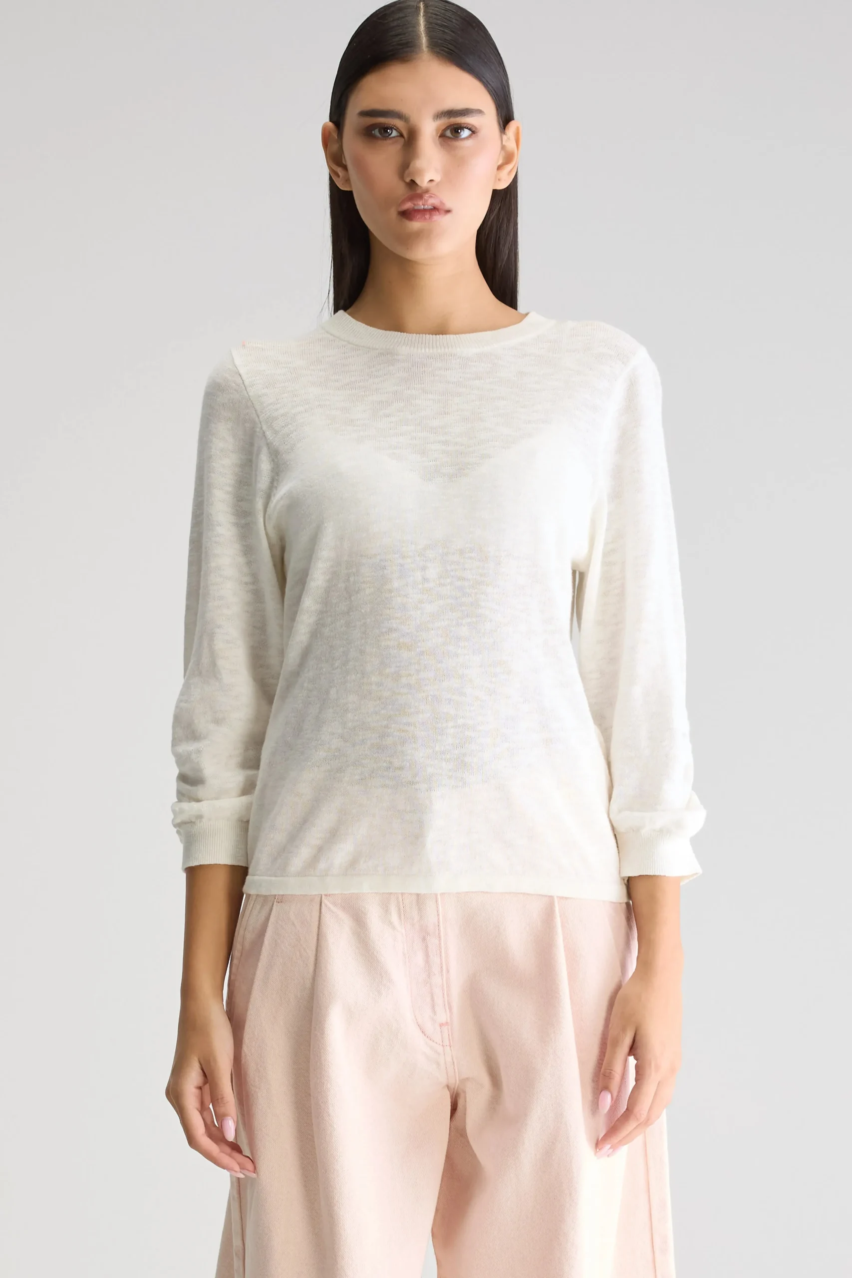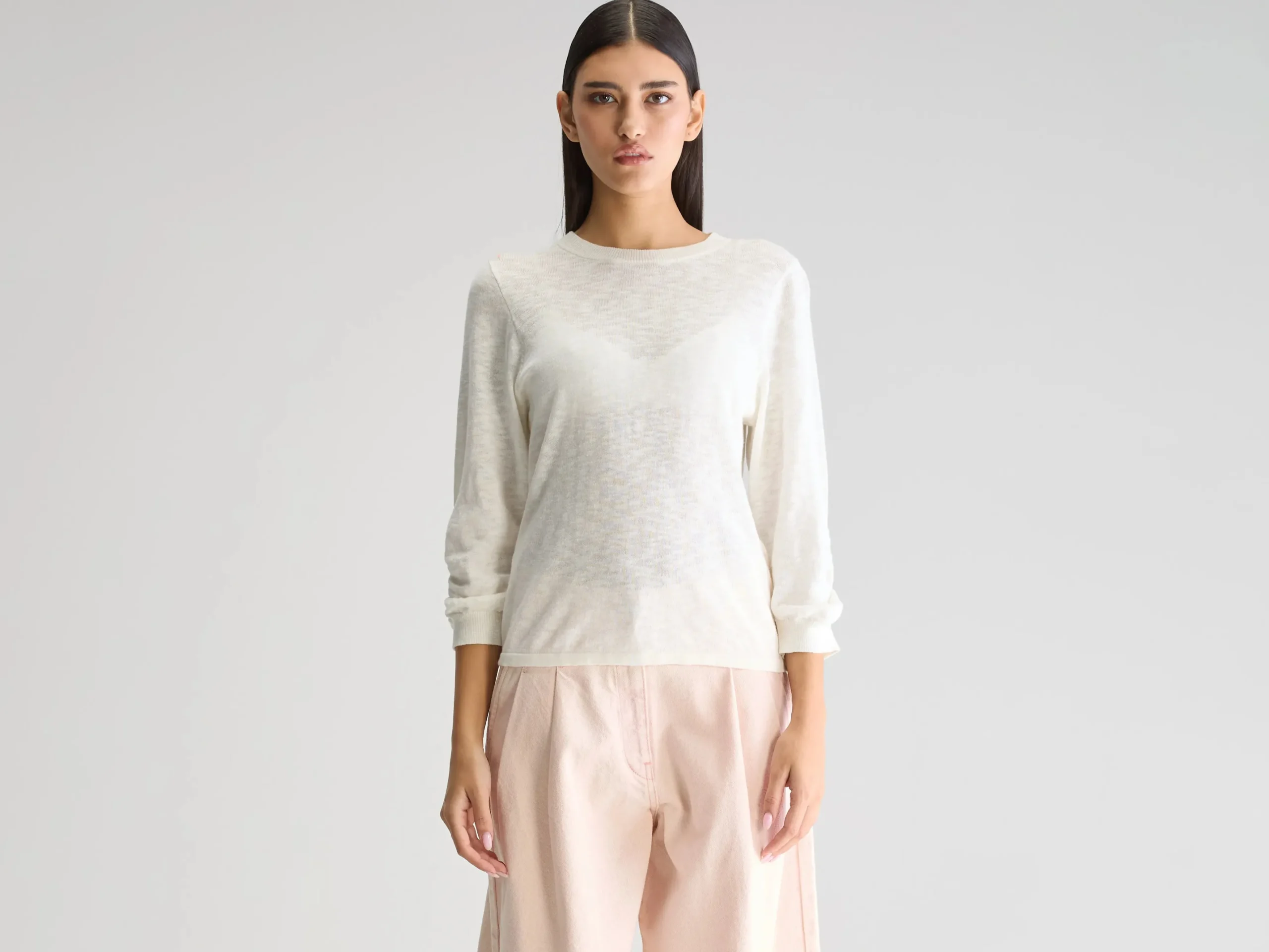 Klassieke, ecru trui met ronde hals en 3/4-mouwen.Klassieke pasvormLange mouwen met geribde boordenRonde halsZachte textuurGeribde zoomKatoen en linnen