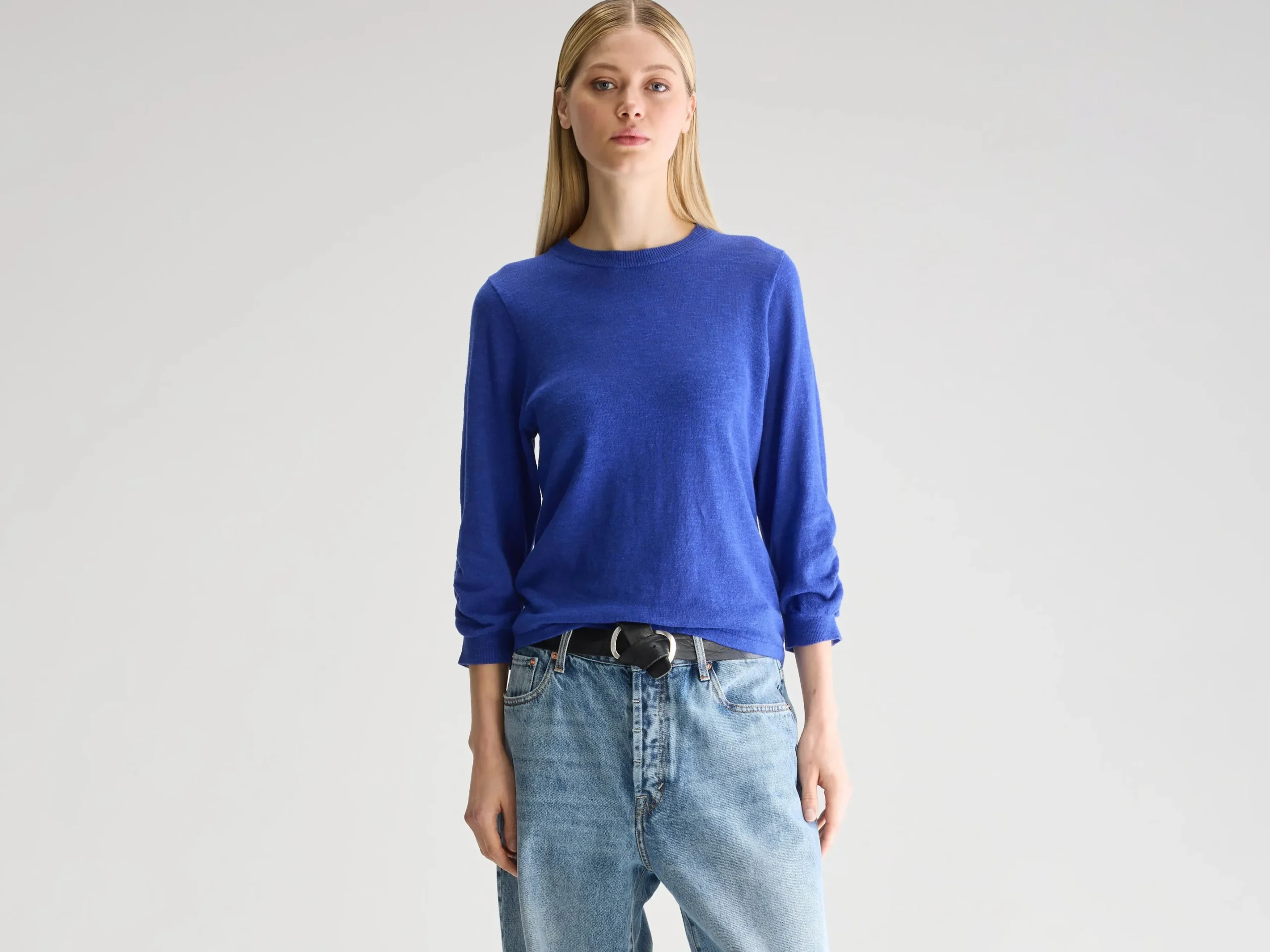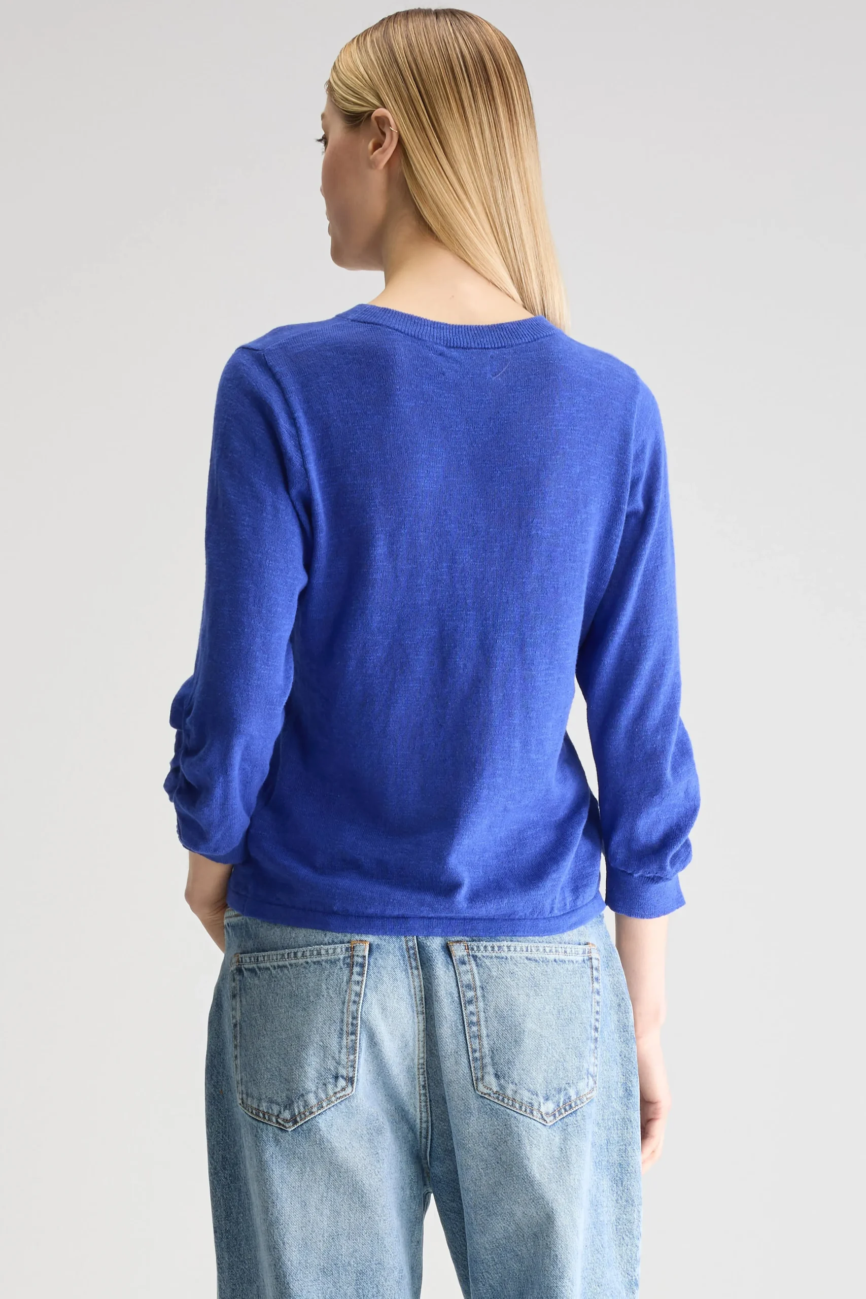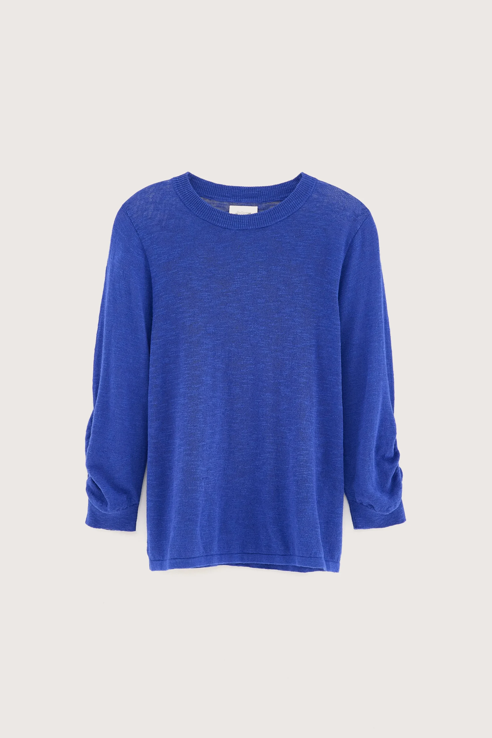 Klassieke, blauwe trui met ronde hals en 3/4-mouwen, in levendige worker-stijl.Klassieke pasvormLange mouwen met geribde boordenRonde halsZachte textuurGeribde zoomKatoen en linnen