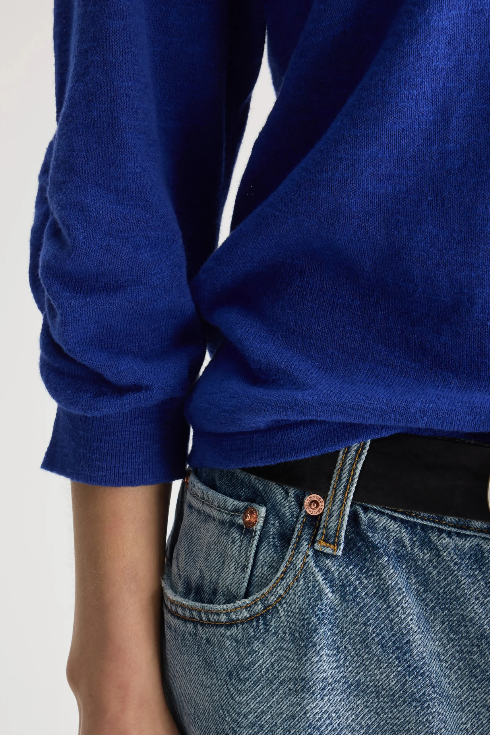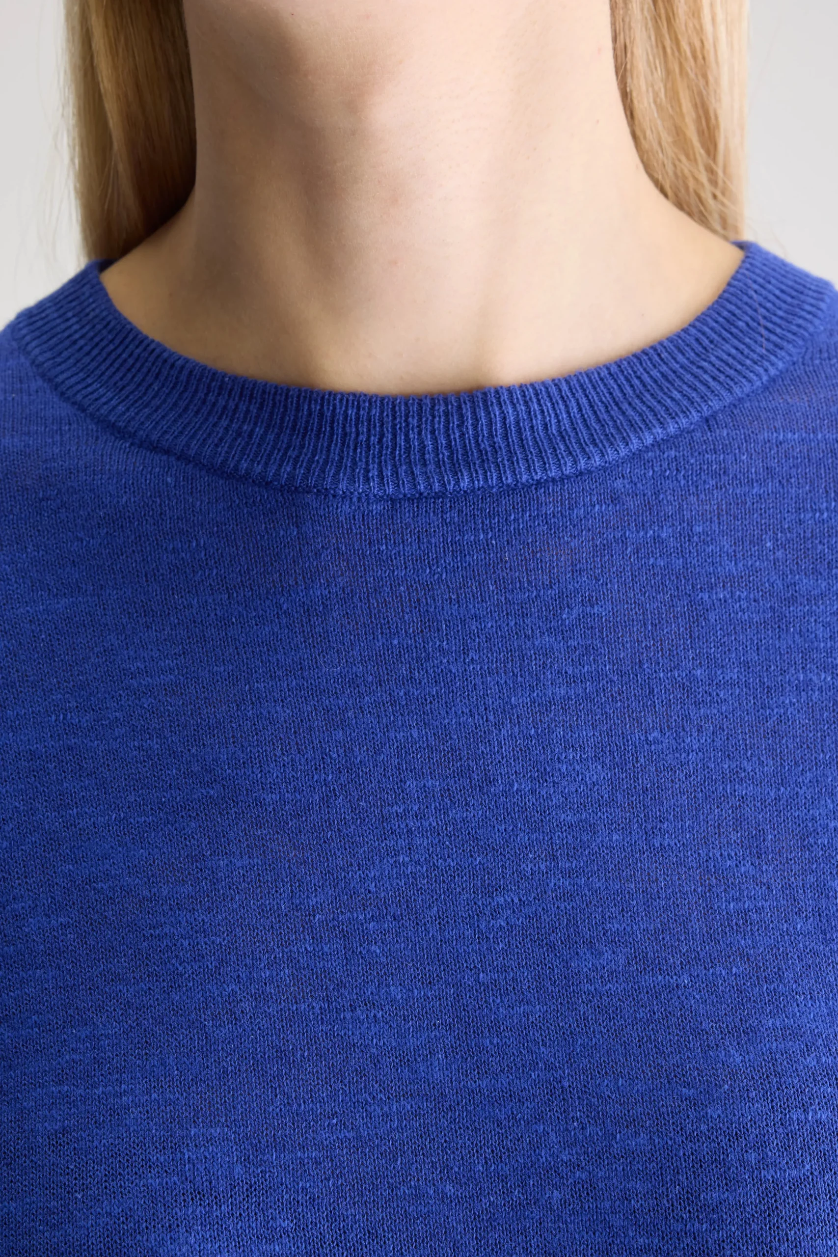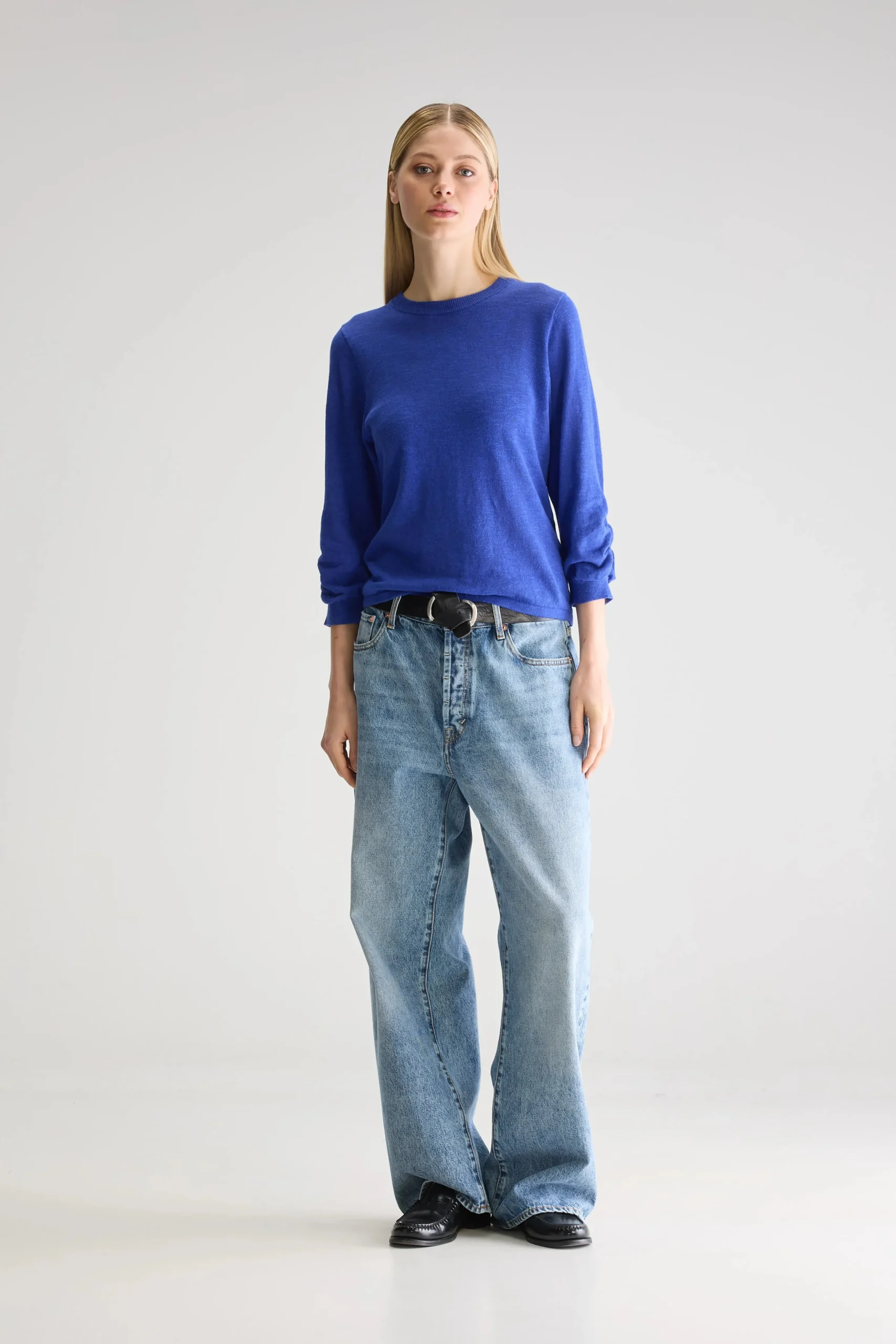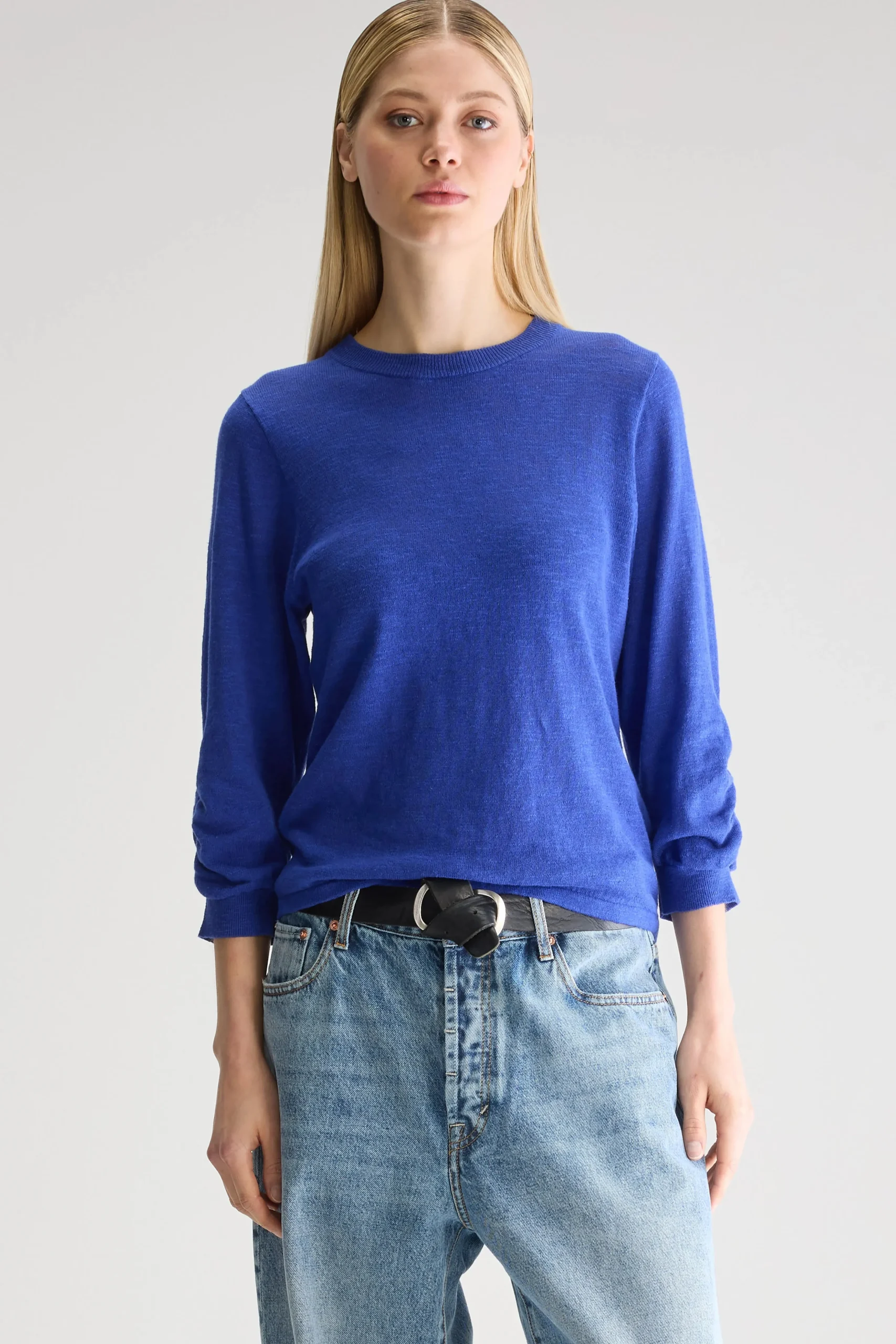 Klassieke, blauwe trui met ronde hals en 3/4-mouwen, in levendige worker-stijl.Klassieke pasvormLange mouwen met geribde boordenRonde halsZachte textuurGeribde zoomKatoen en linnen