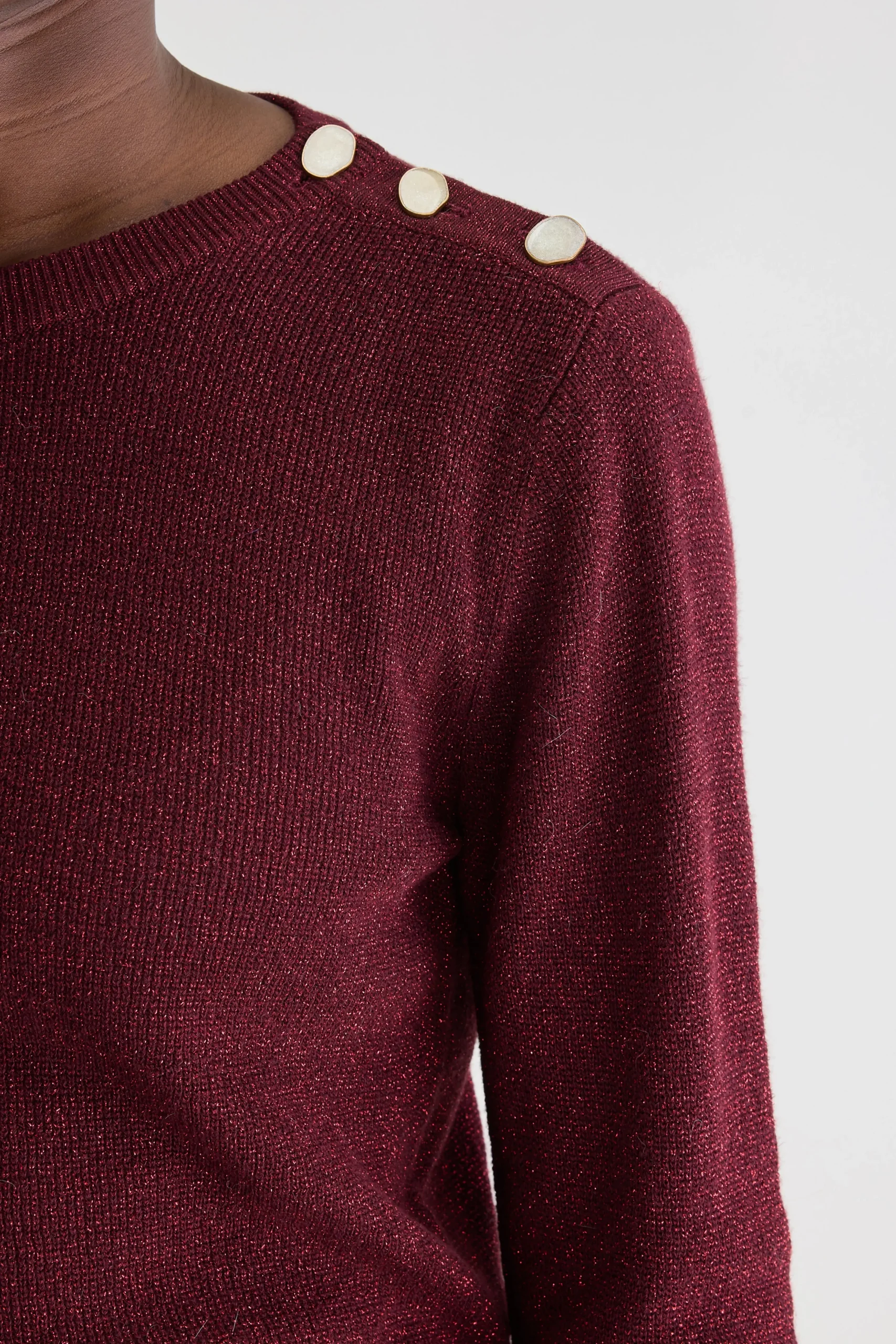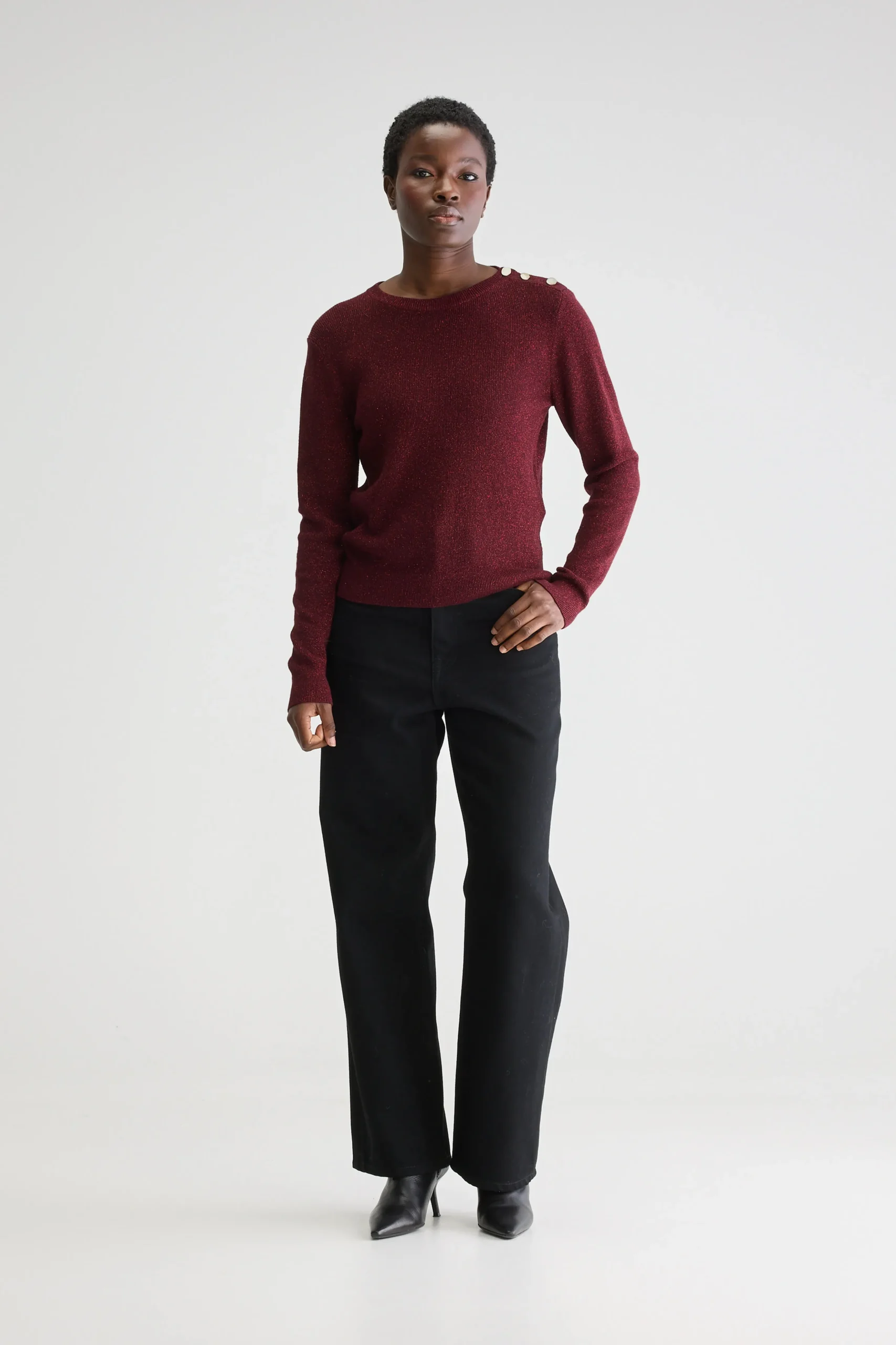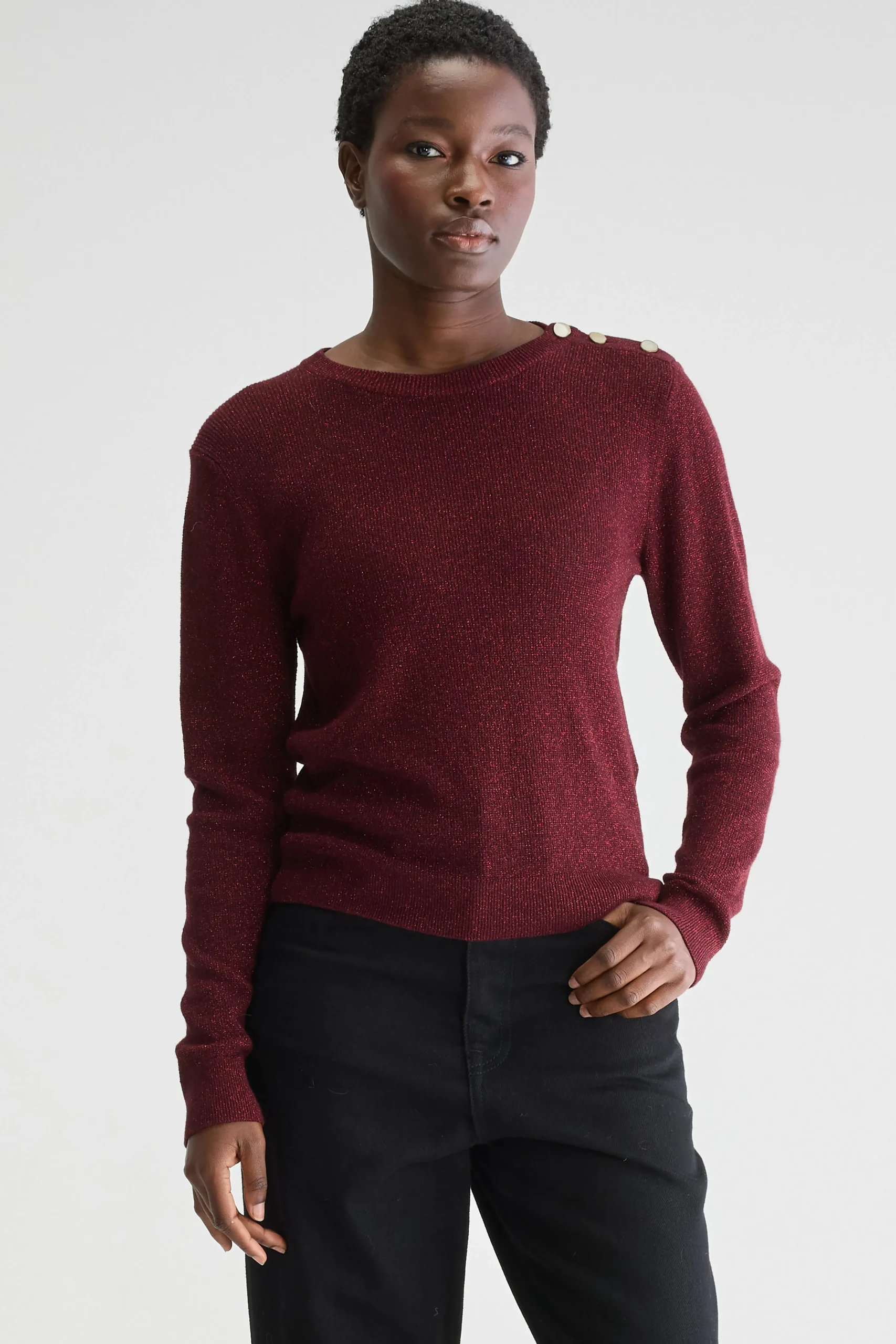 Slim fit trui met ronde hals en knopen op de schouders, gemaakt van wijnrood viscose- en lurexgaren.Slim fit Ronde hals Lange mouwen Geribde randen Knopen op de schouders met ingelegde stenenFijn garen