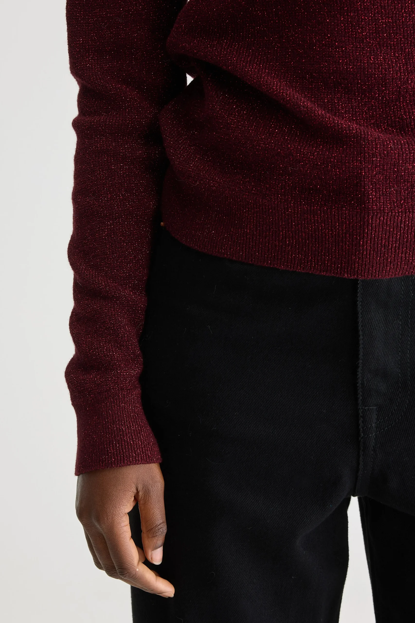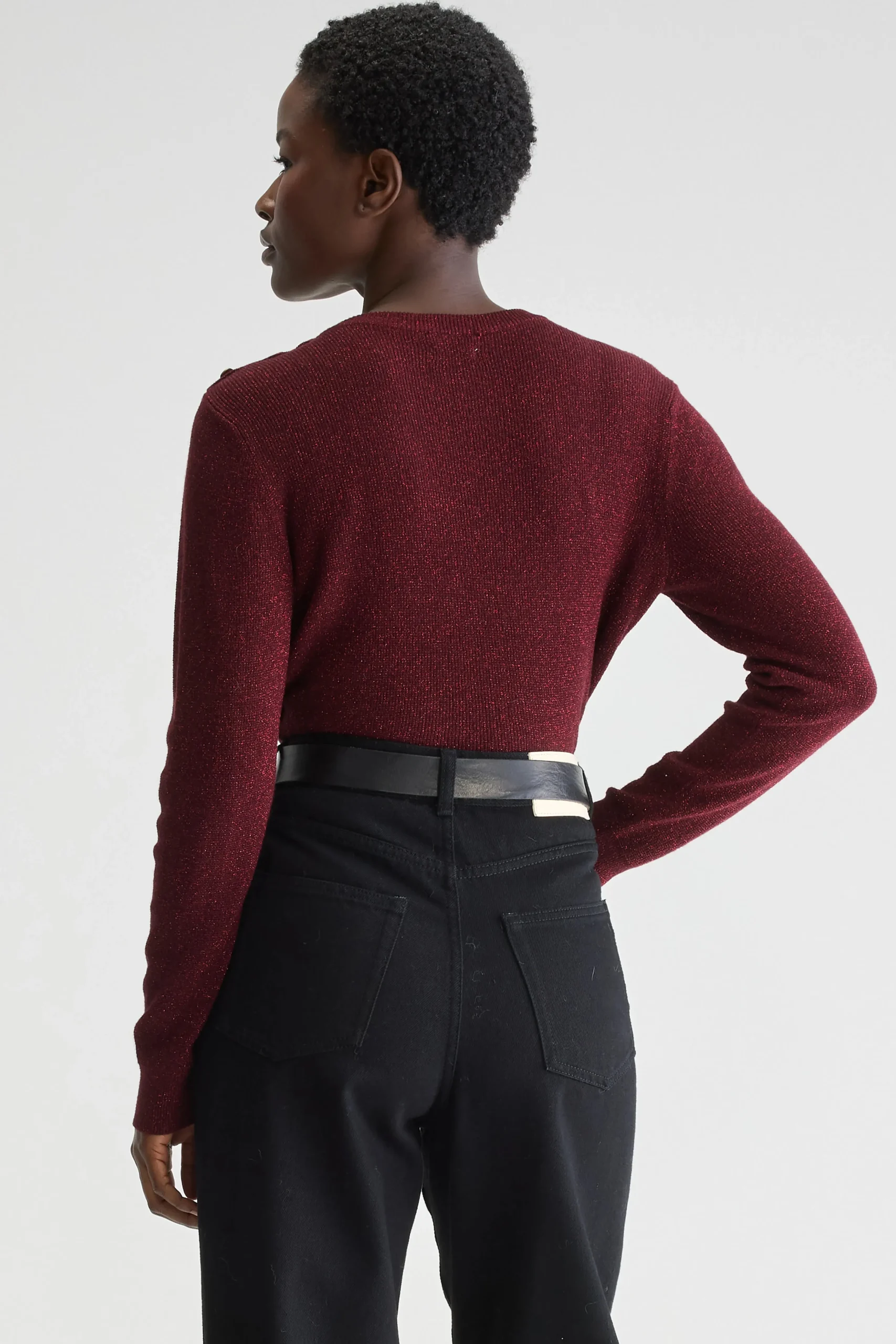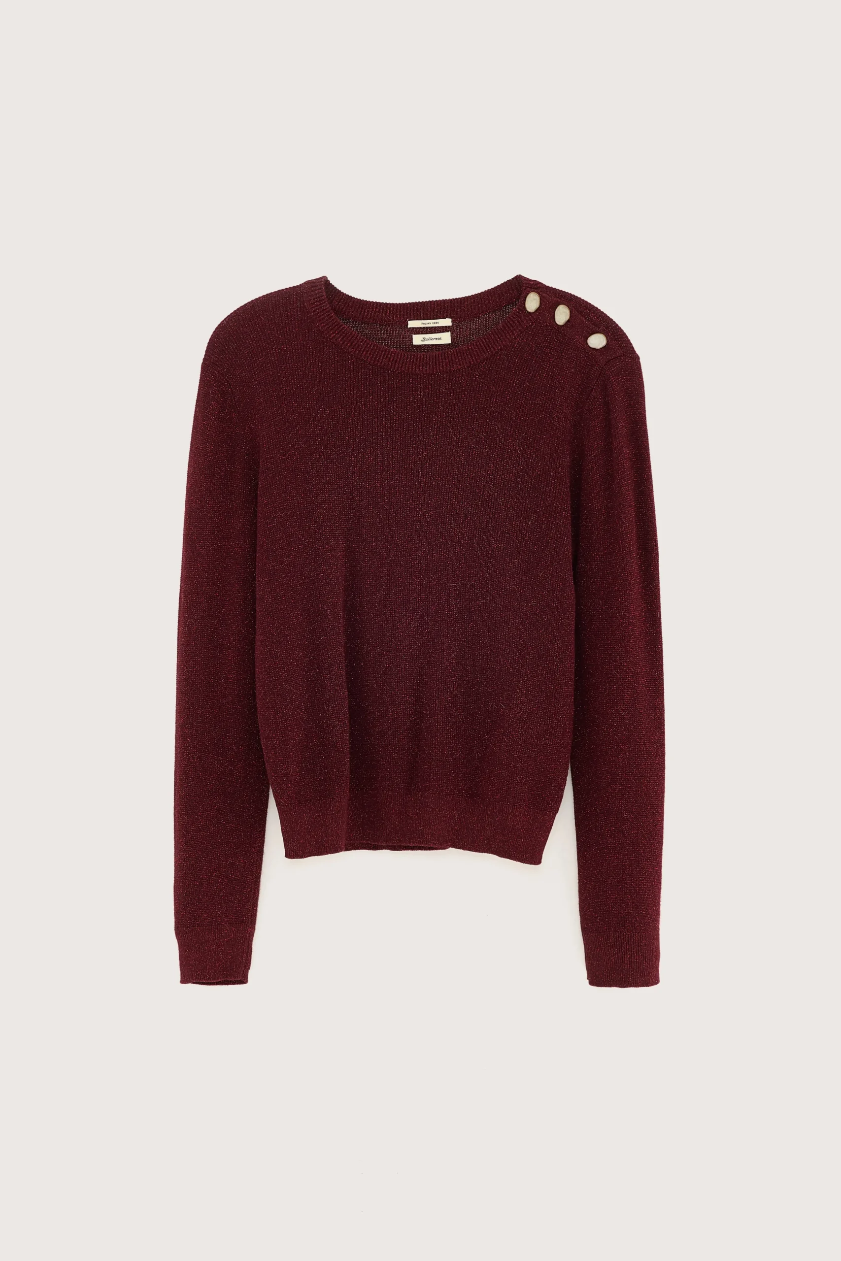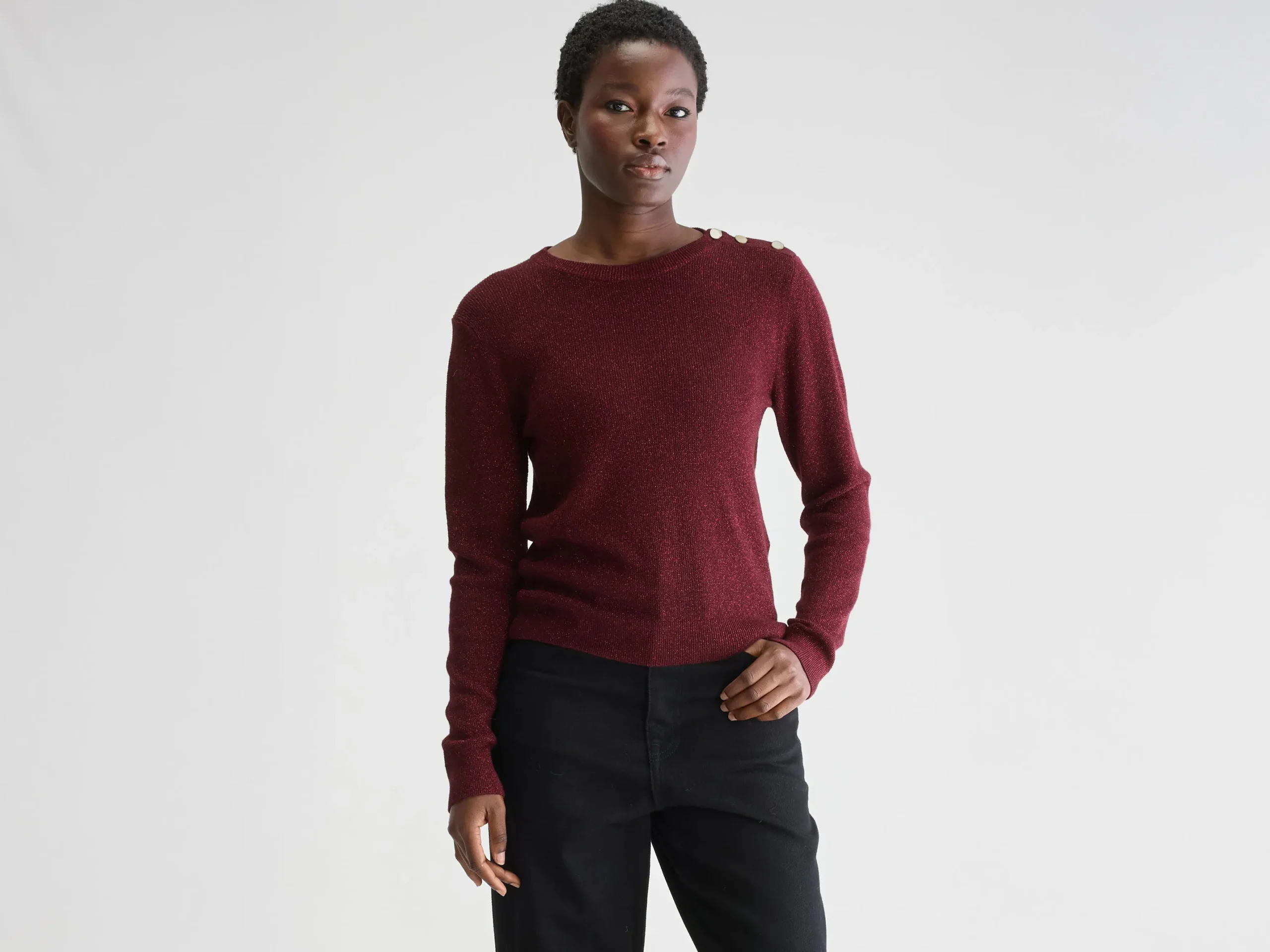 Slim fit trui met ronde hals en knopen op de schouders, gemaakt van wijnrood viscose- en lurexgaren.Slim fit Ronde hals Lange mouwen Geribde randen Knopen op de schouders met ingelegde stenenFijn garen