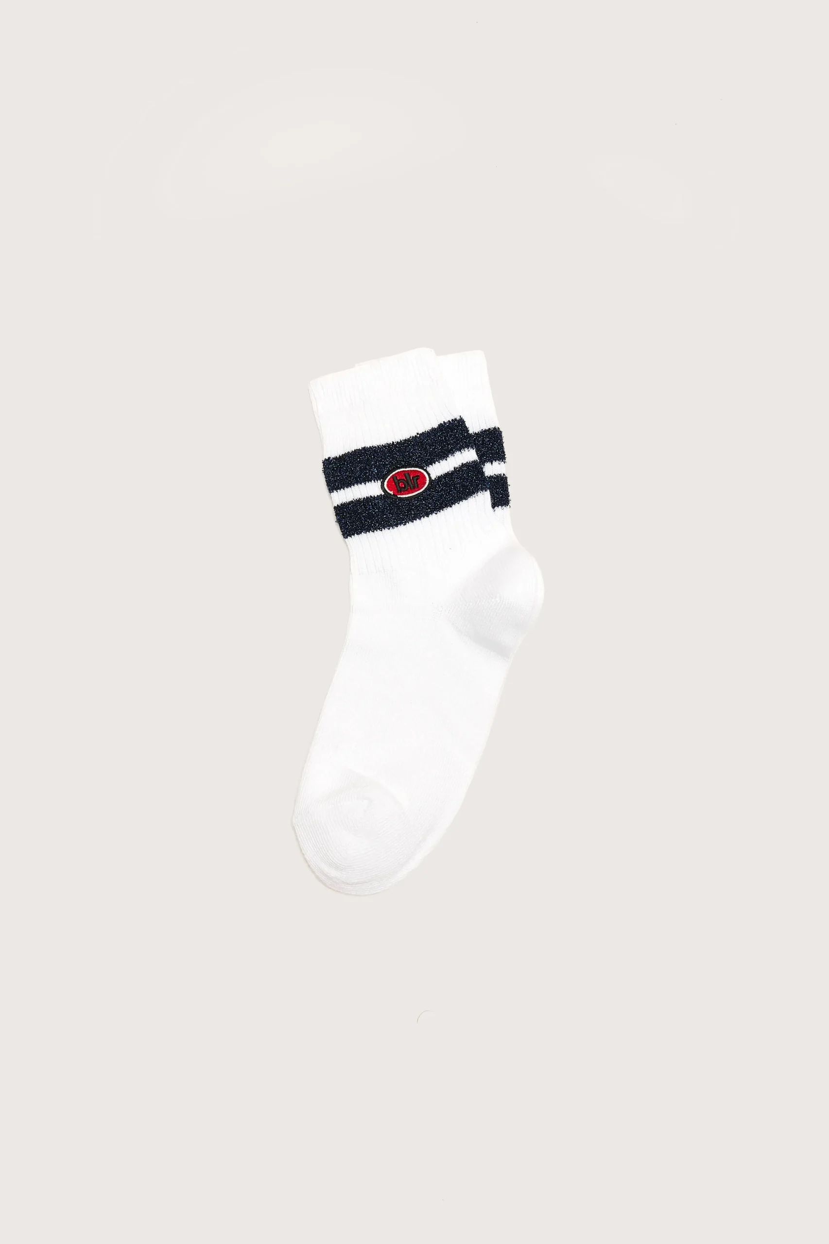 Halflange sokken met frisse witte basis, twee fonkelende marineblauwe strepen op de enkel, een rood “blr”-logo en geri…