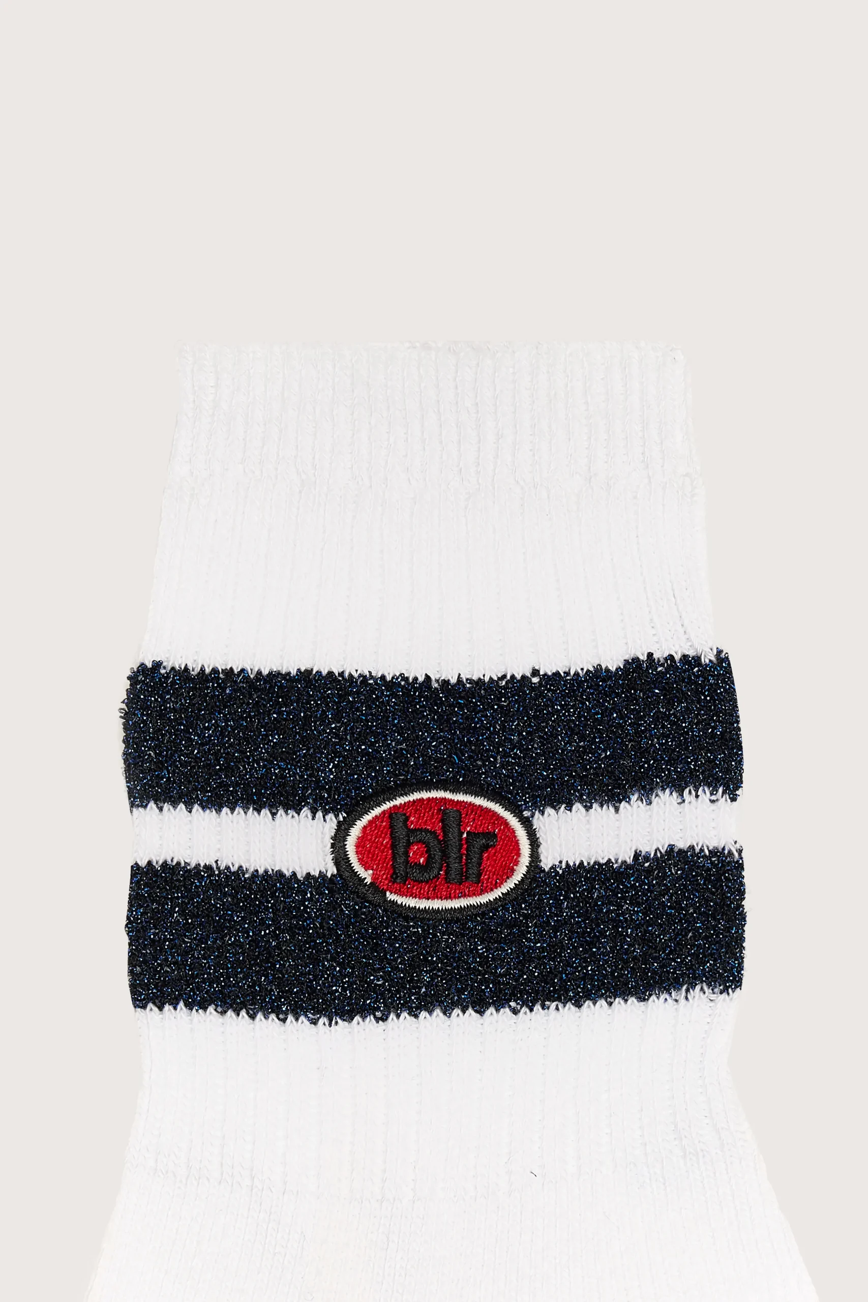 Halflange sokken met frisse witte basis, twee fonkelende marineblauwe strepen op de enkel, een rood “blr”-logo en geribde boord.HalflangGebreid patroonFonkelende marineblauwe strepenKatoen”blr”-logo