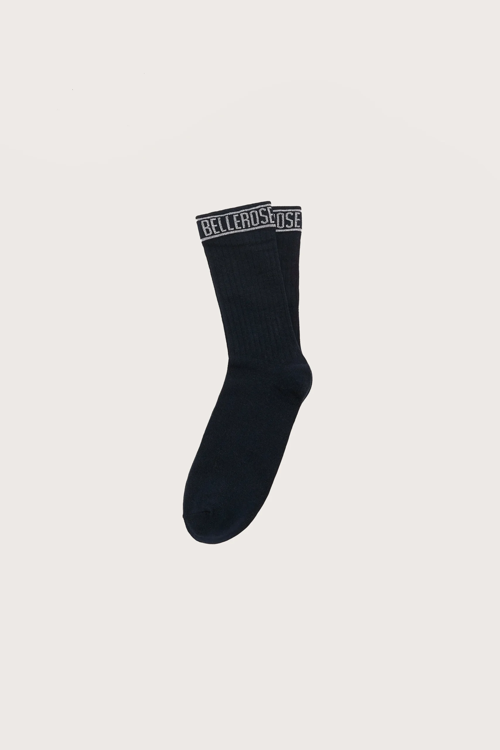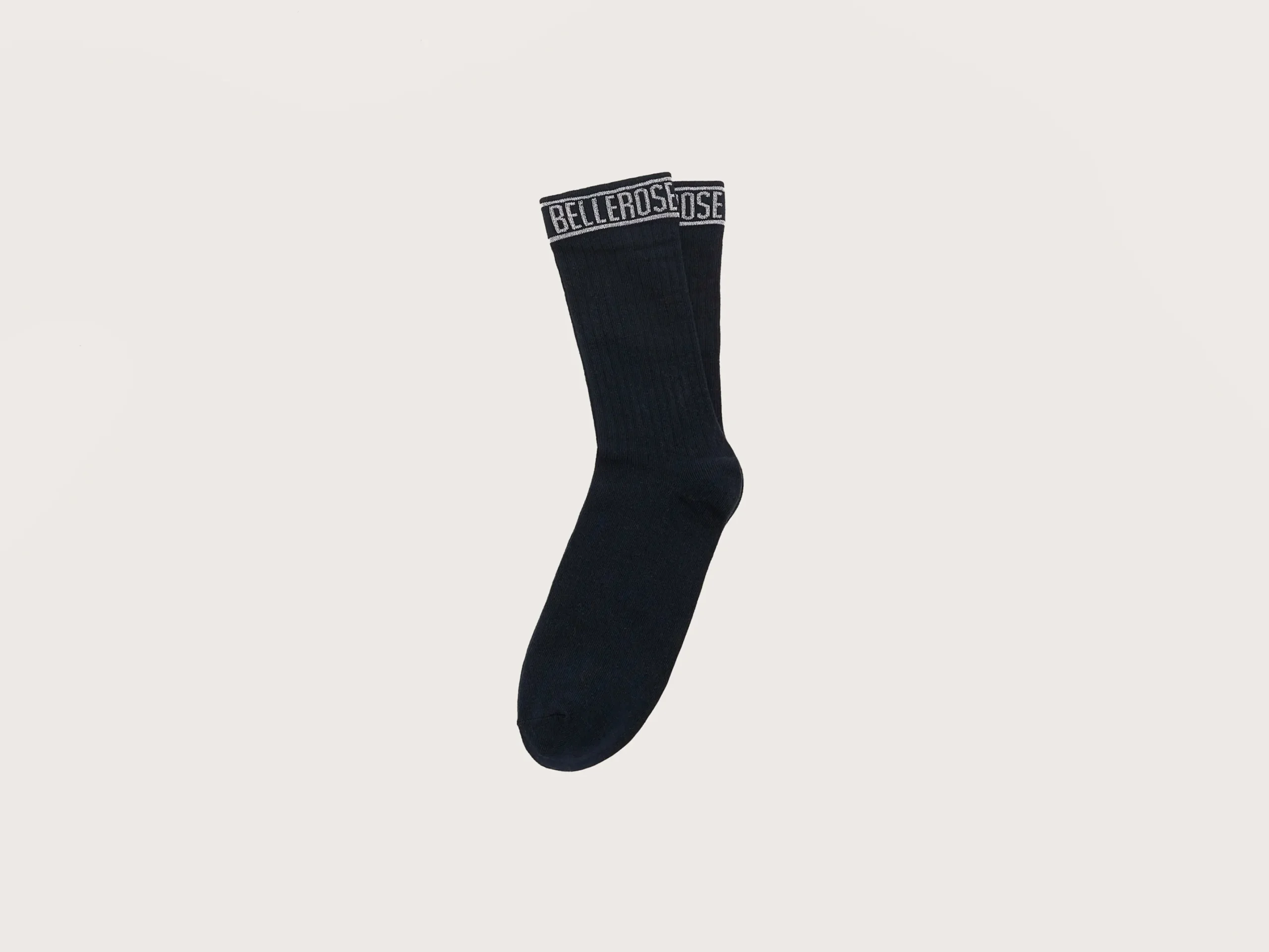 Klassieke halflange sokken, gemaakt van marineblauw katoen met geribde bovenkant en Bellerose-handtekening in reflecterend garen op de enkels.HalflangGebreid ribpatroon Reflecterende Bellerose-handtekening op de enkels