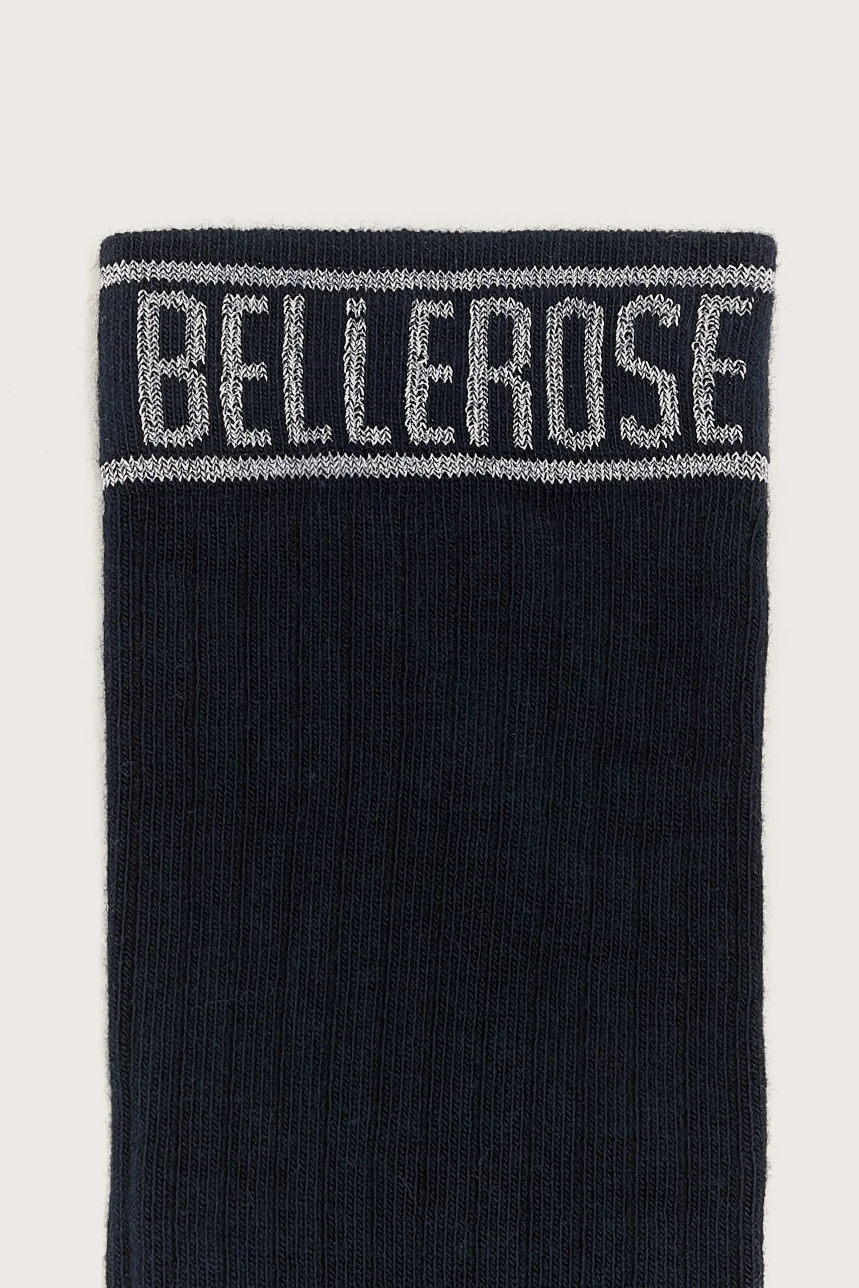 Klassieke halflange sokken, gemaakt van marineblauw katoen met geribde bovenkant en Bellerose-handtekening in reflectere…