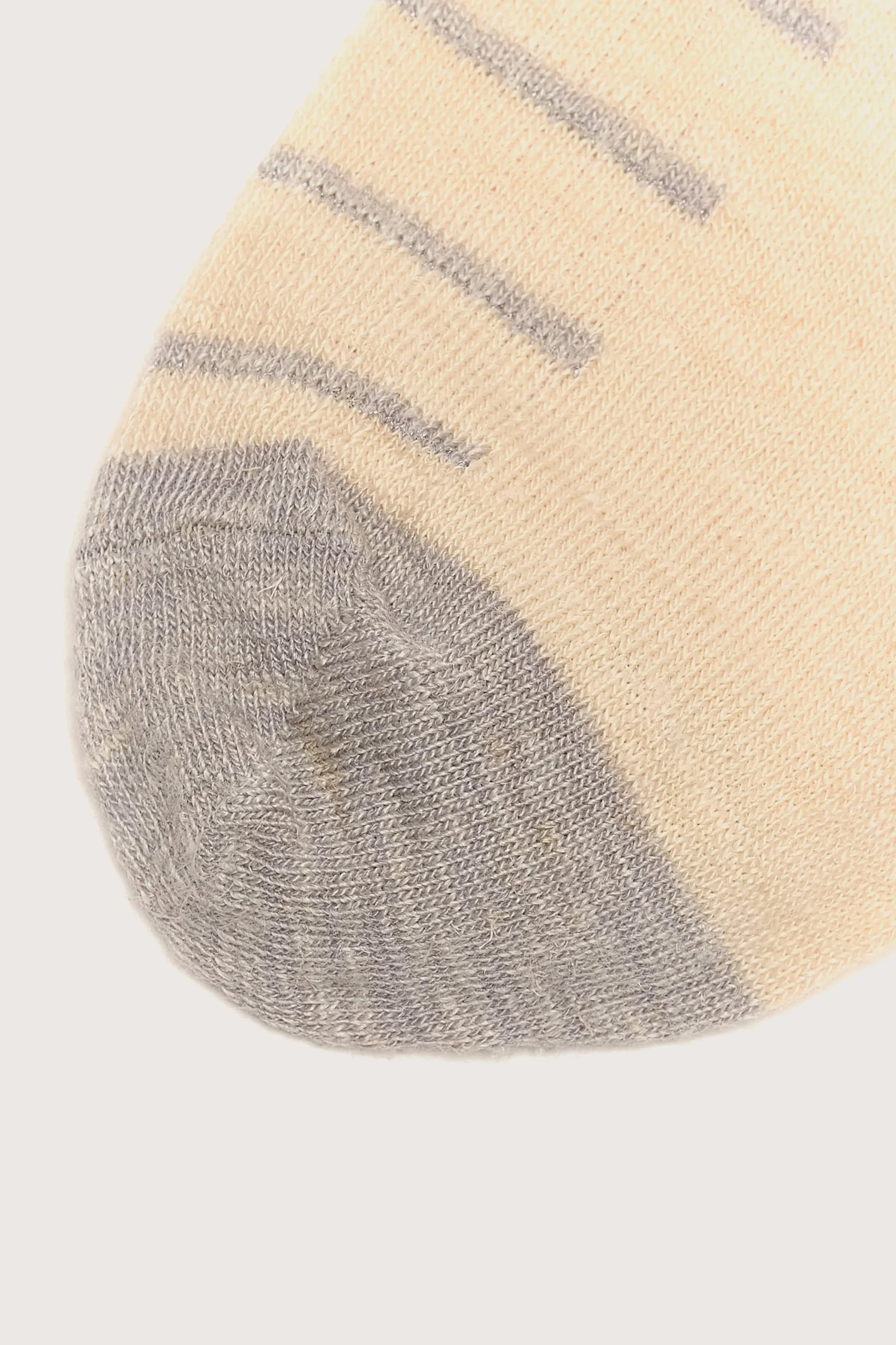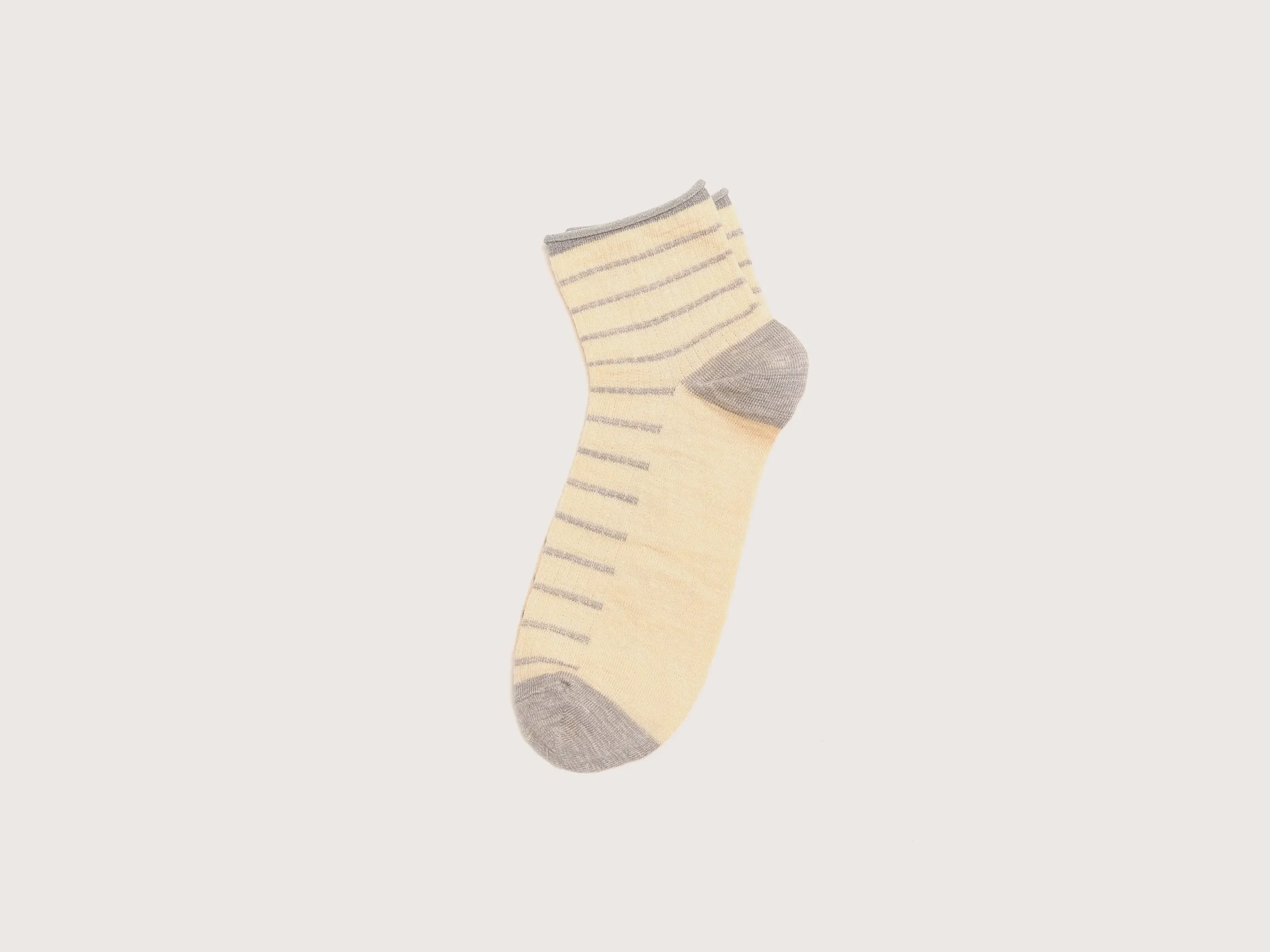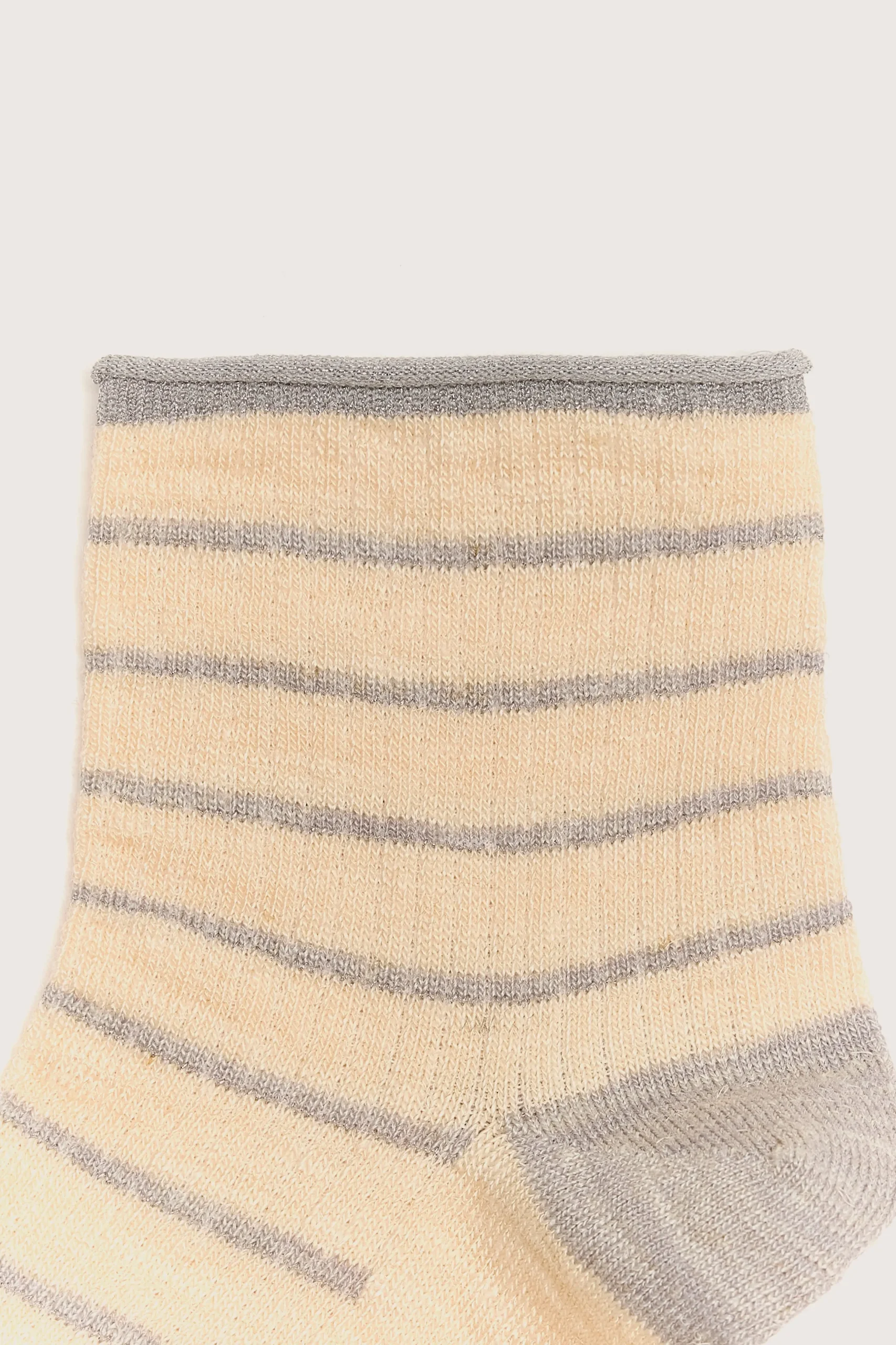 Lichte, zacht crèmekleurige enkelsokken met fonkelende grijze strepen, lichtgrijze teen en hiel en een gerolde boord bo…