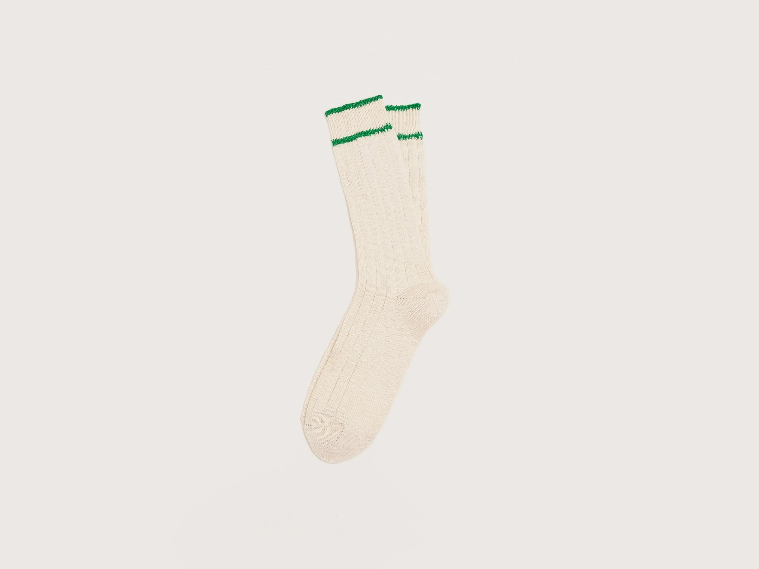 Geribde halflange sokken, gemaakt van ecru katoen met contrasterende groene strepen op de enkels.HalflangGebreid ribpatroon Contrasterende strepen op de enkels