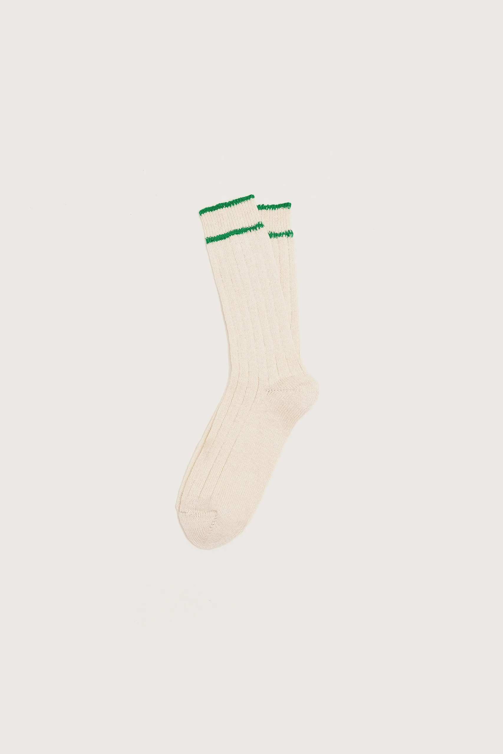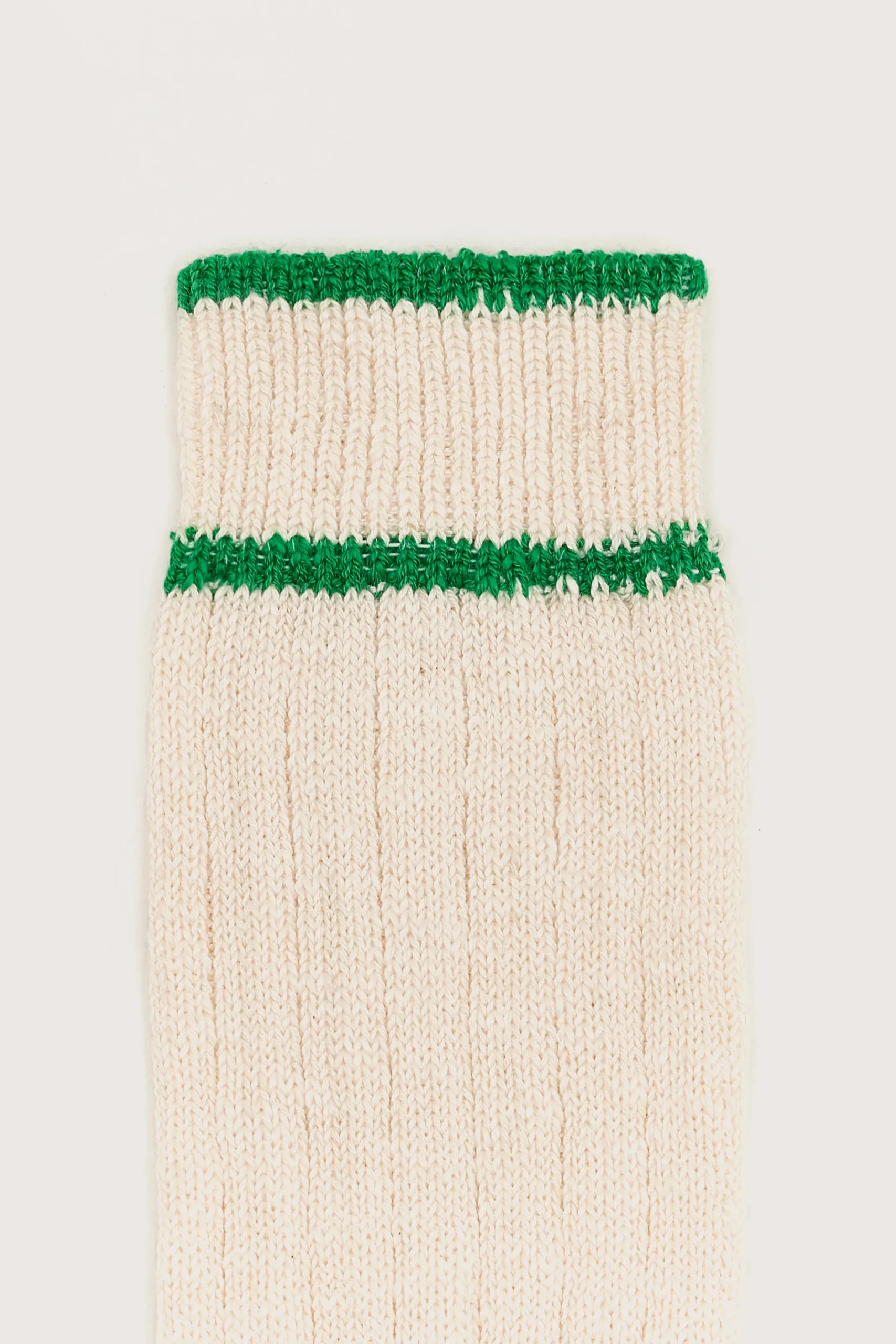 Geribde halflange sokken, gemaakt van ecru katoen met contrasterende groene strepen op de enkels.HalflangGebreid ribpatr…