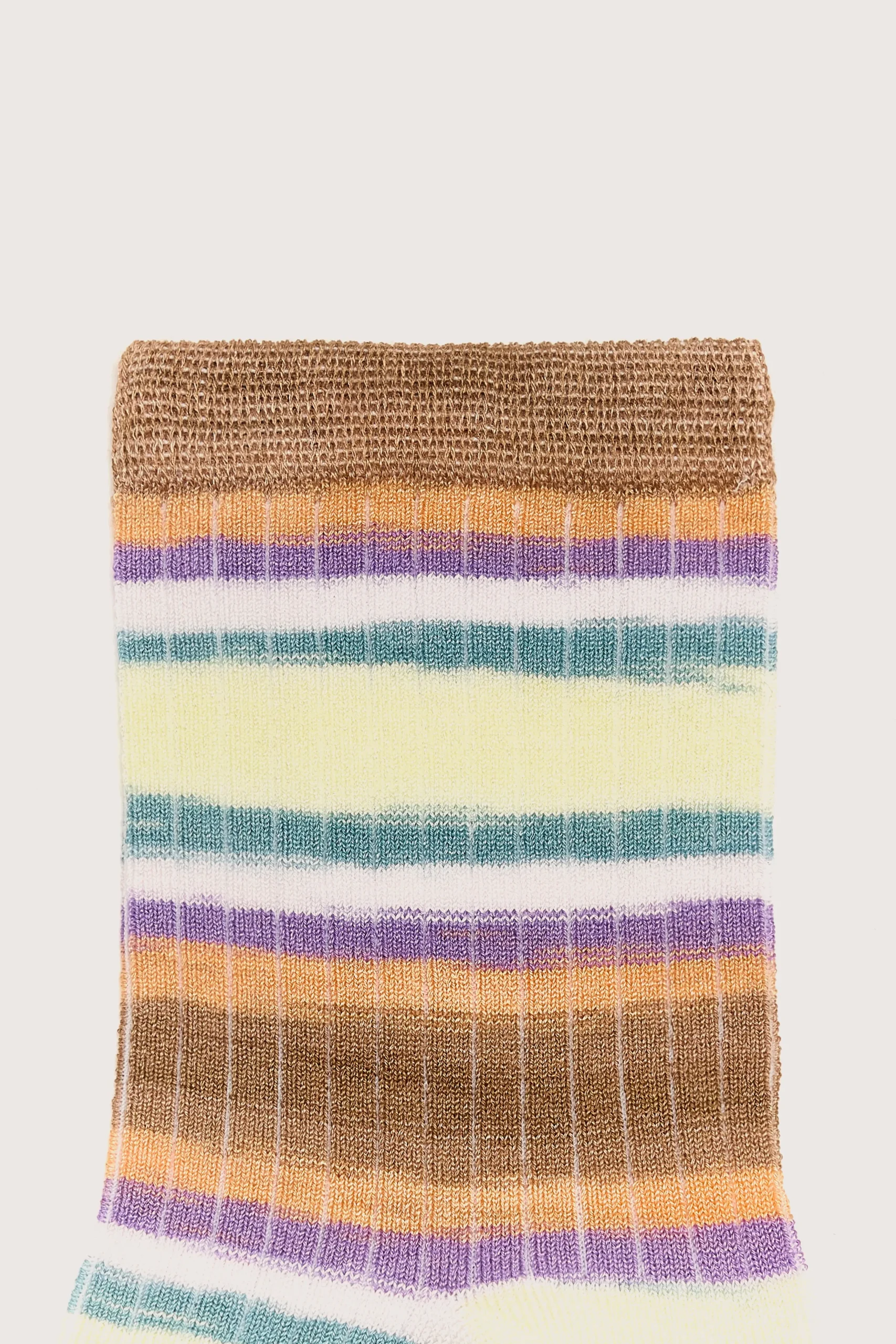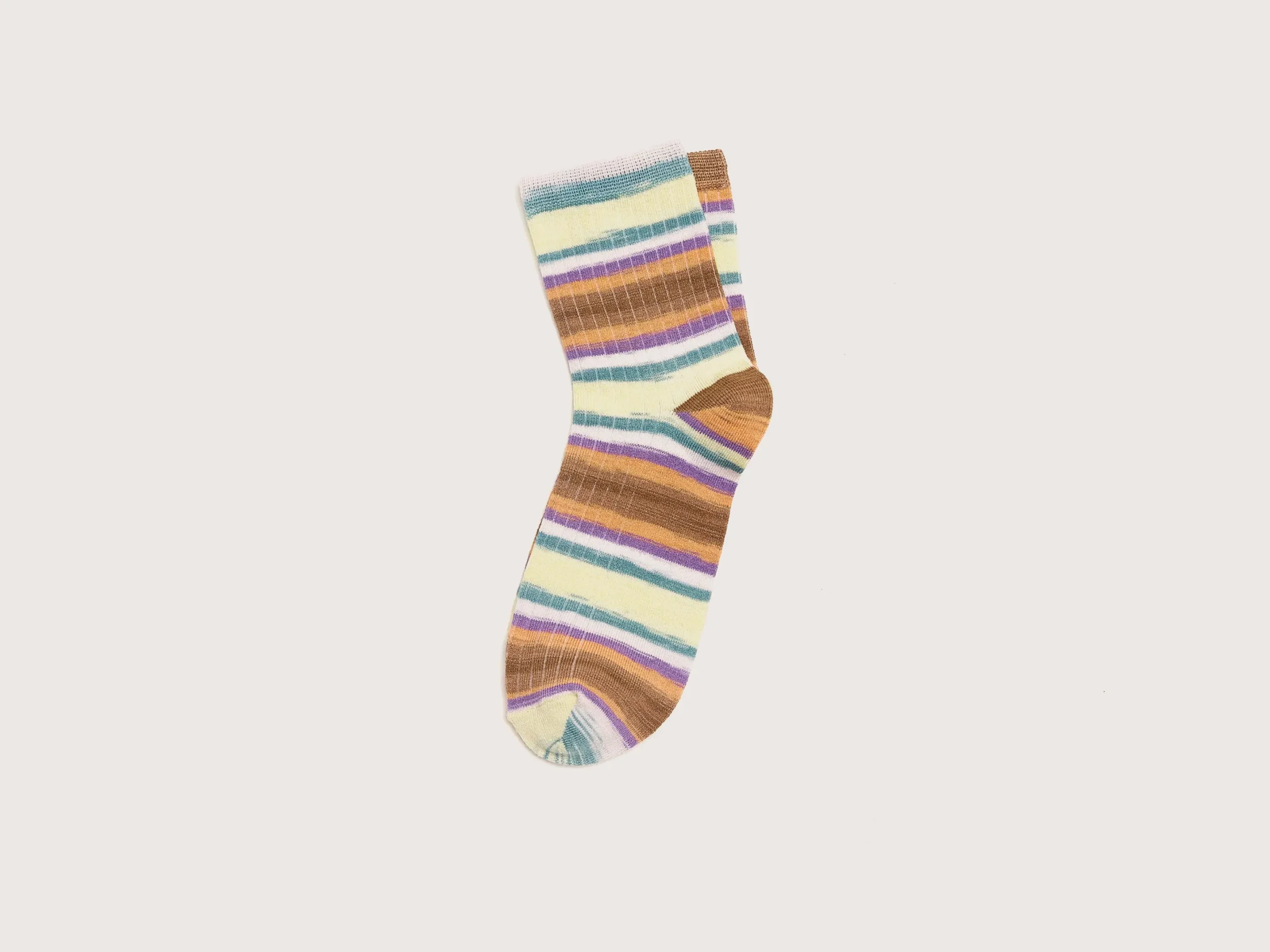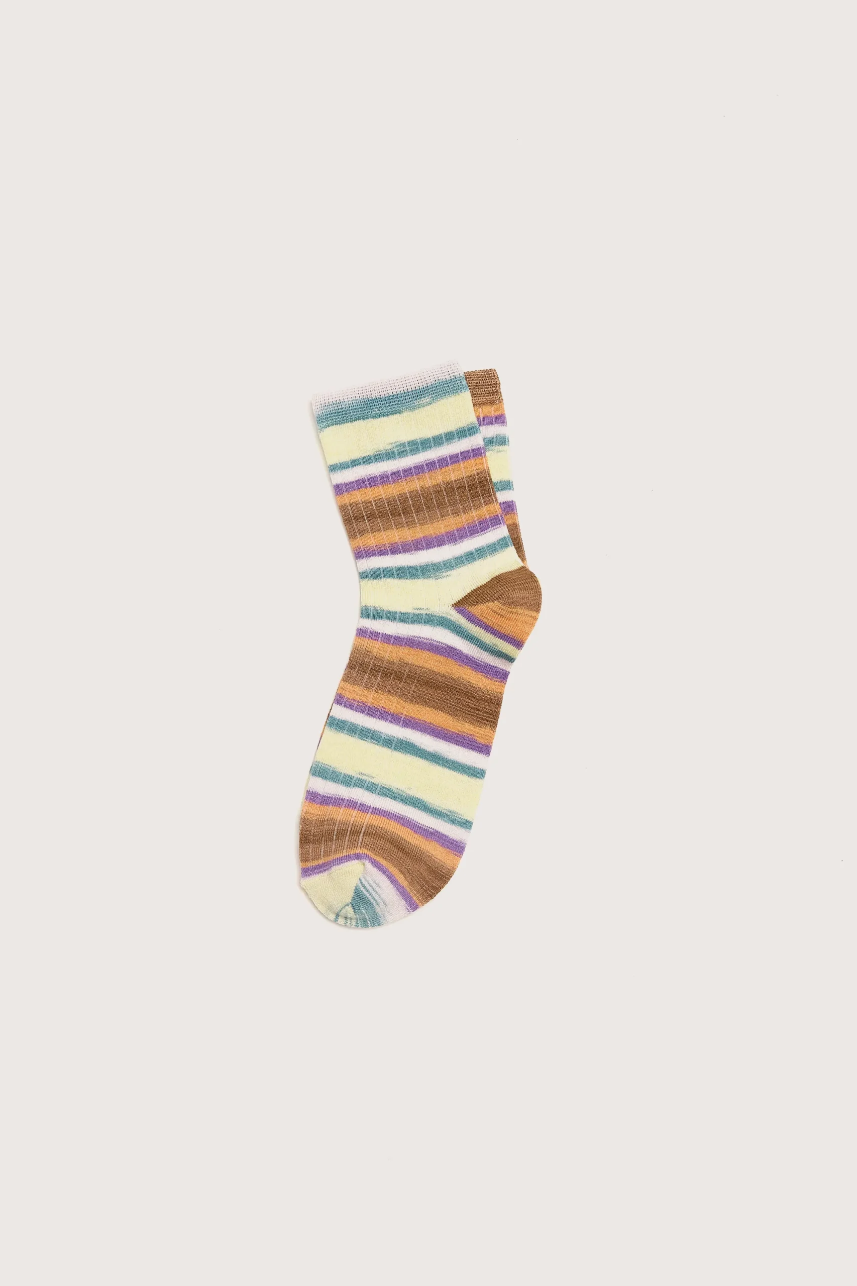 Zachte, halflange sokken met veelkleurig streepdessin en geribde textuur.HalflangeGebreid patroonVeelkleurige strepenBedrukt garen (alle sokken zijn uniek)Zachte stof