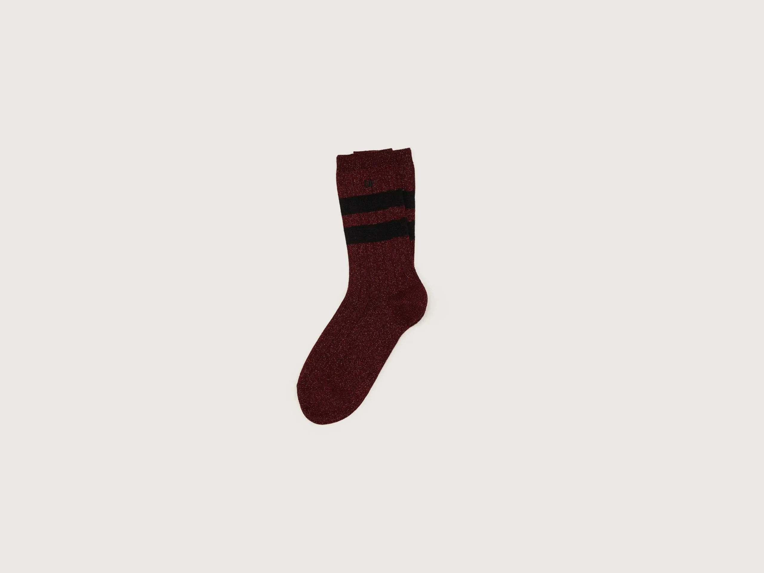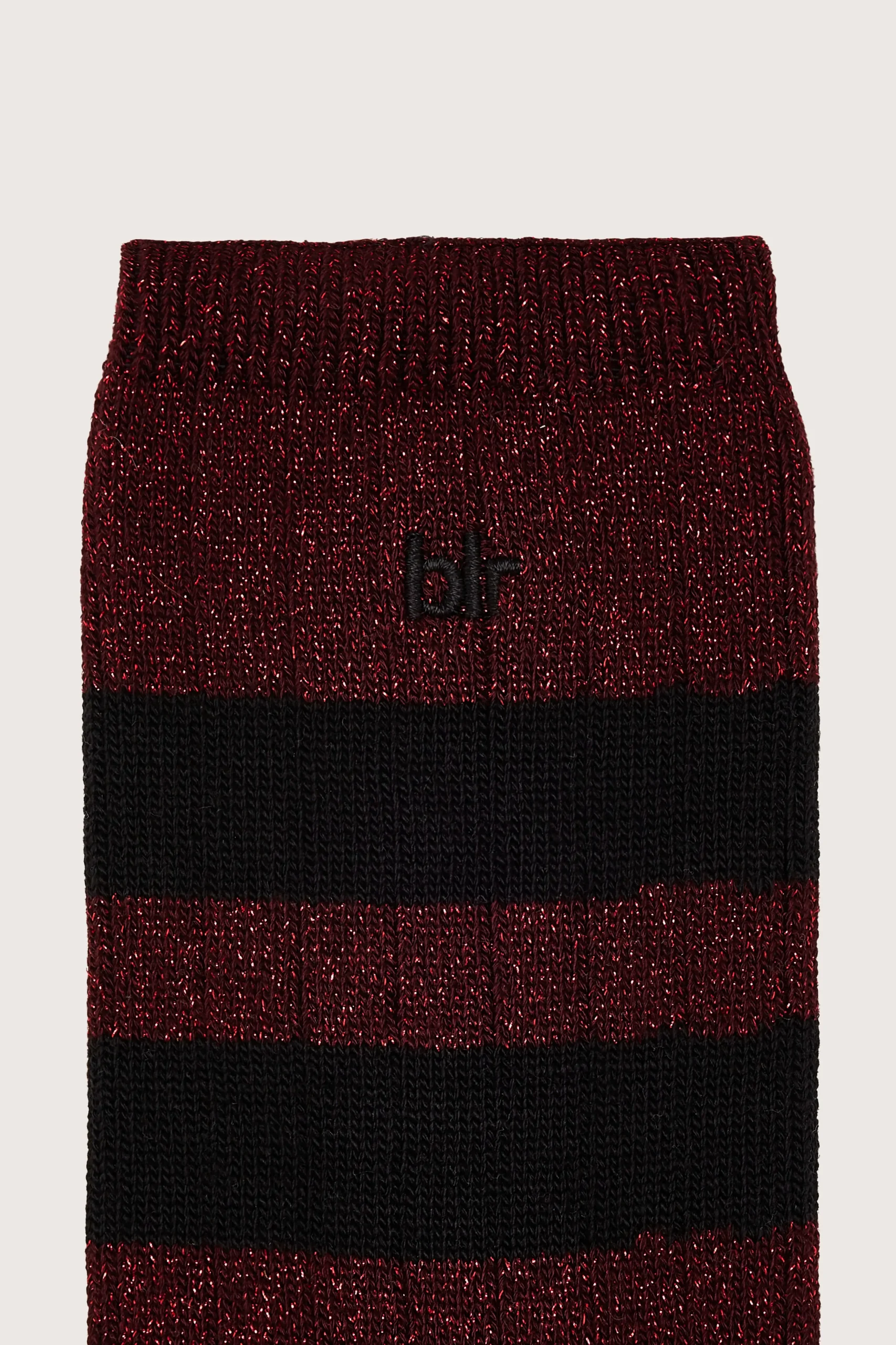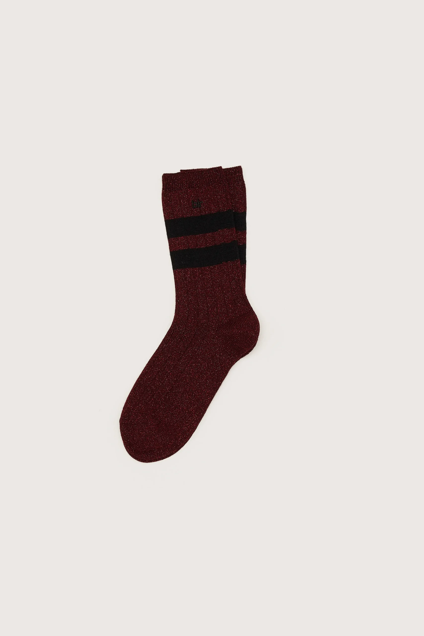 Wijnrode crew sokken van een ribgebreide viscose en lurex mix met contrasterende strepen op de enkels en een “blr” bor…