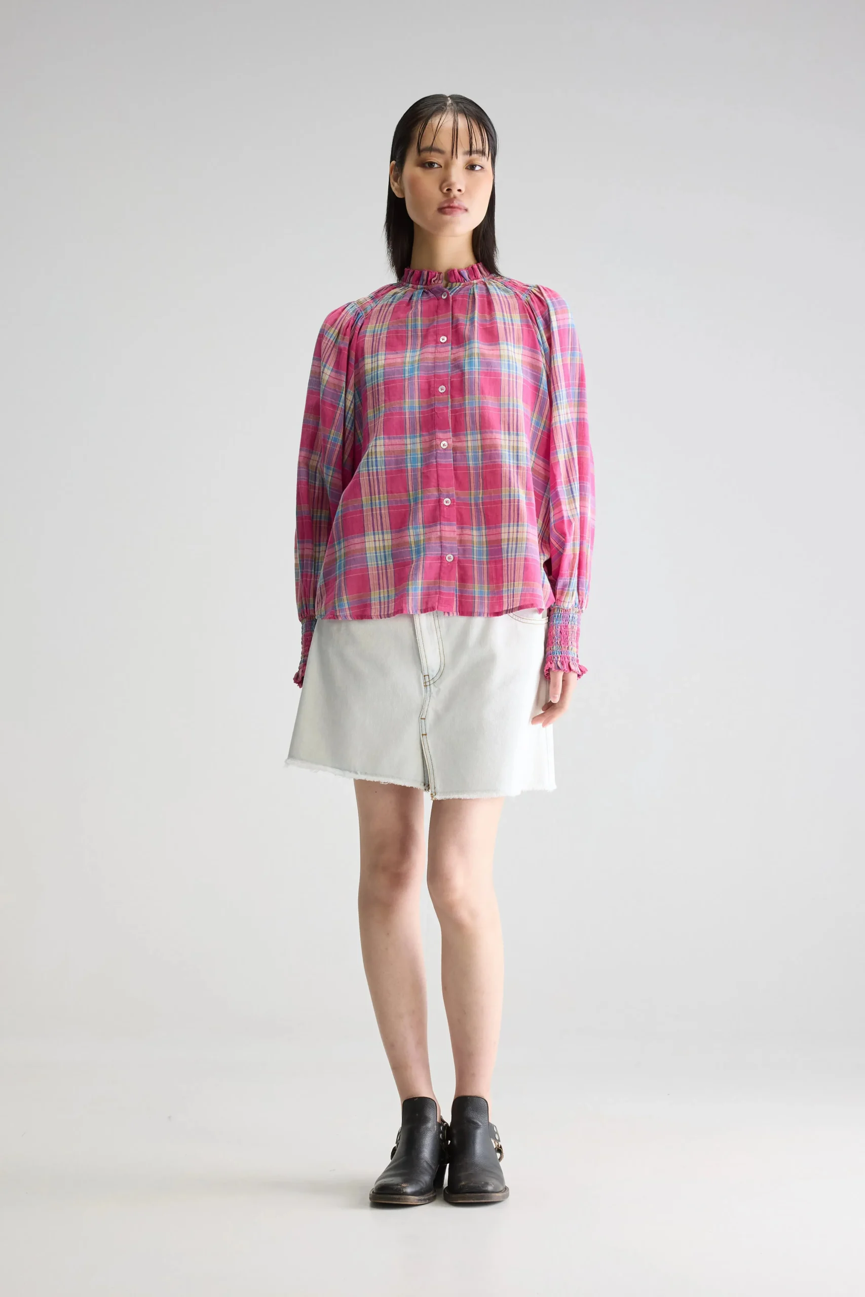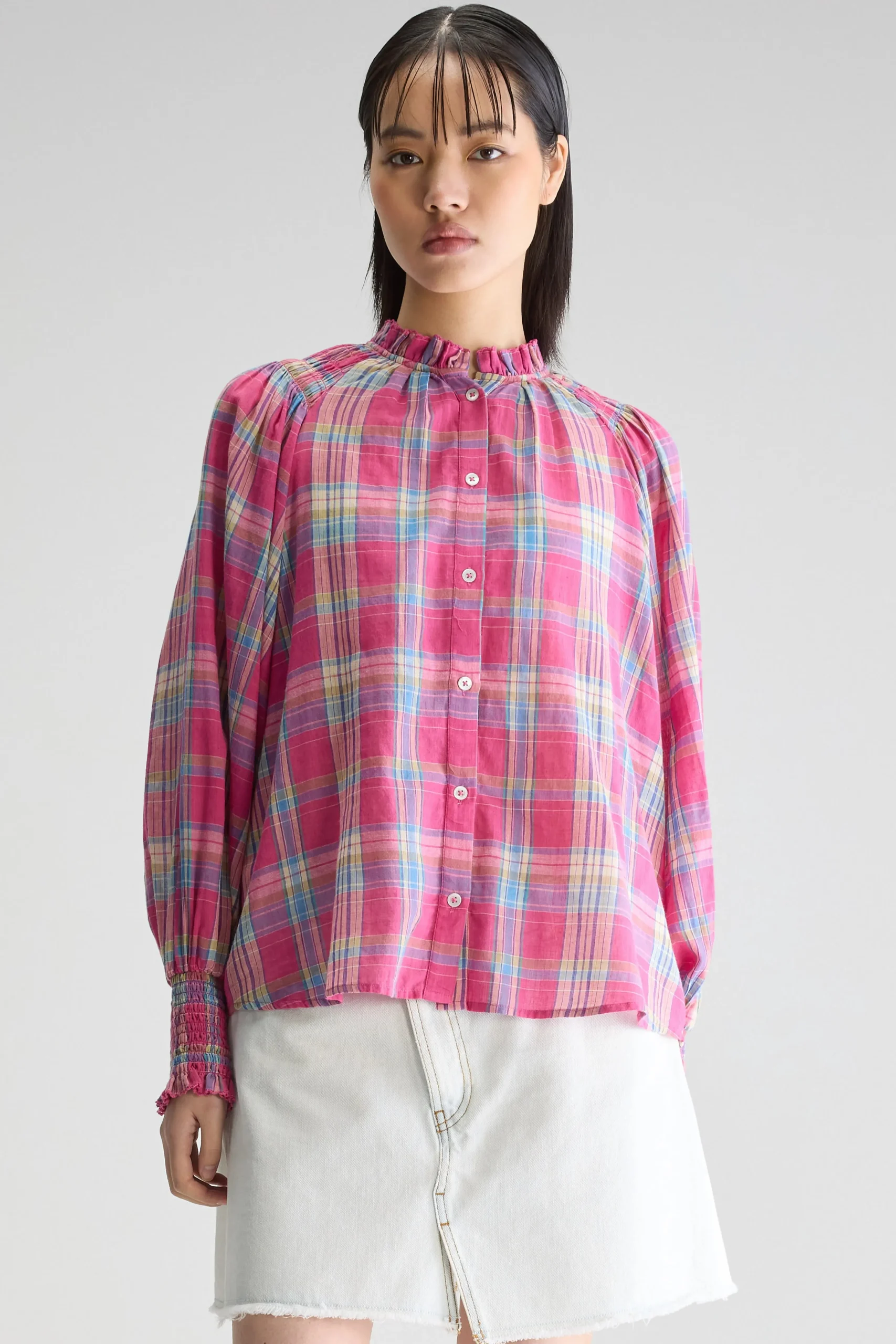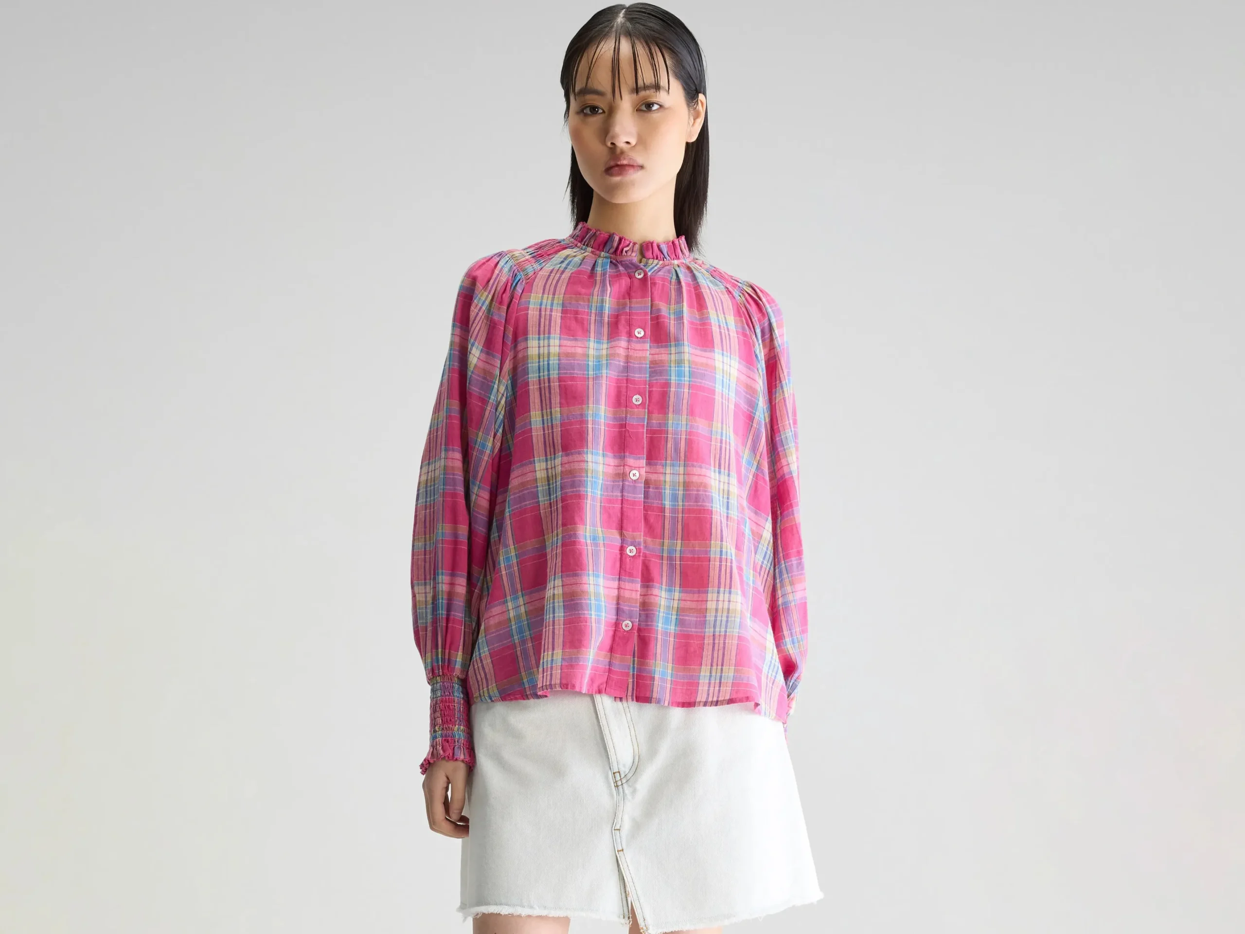 Klassieke blouse met lange raglanmouwen, gesmokte details en een opstaande geruite kraag, gemaakt van katoen met een kleurrijke ruit.Regular pasvorm Opstaande kraag met ruches Lange mouwen met gesmokte manchetten Knoopsluiting Geruite sluier van katoen Gesmokte details op de schouders Hoog-laag gebogen zoom