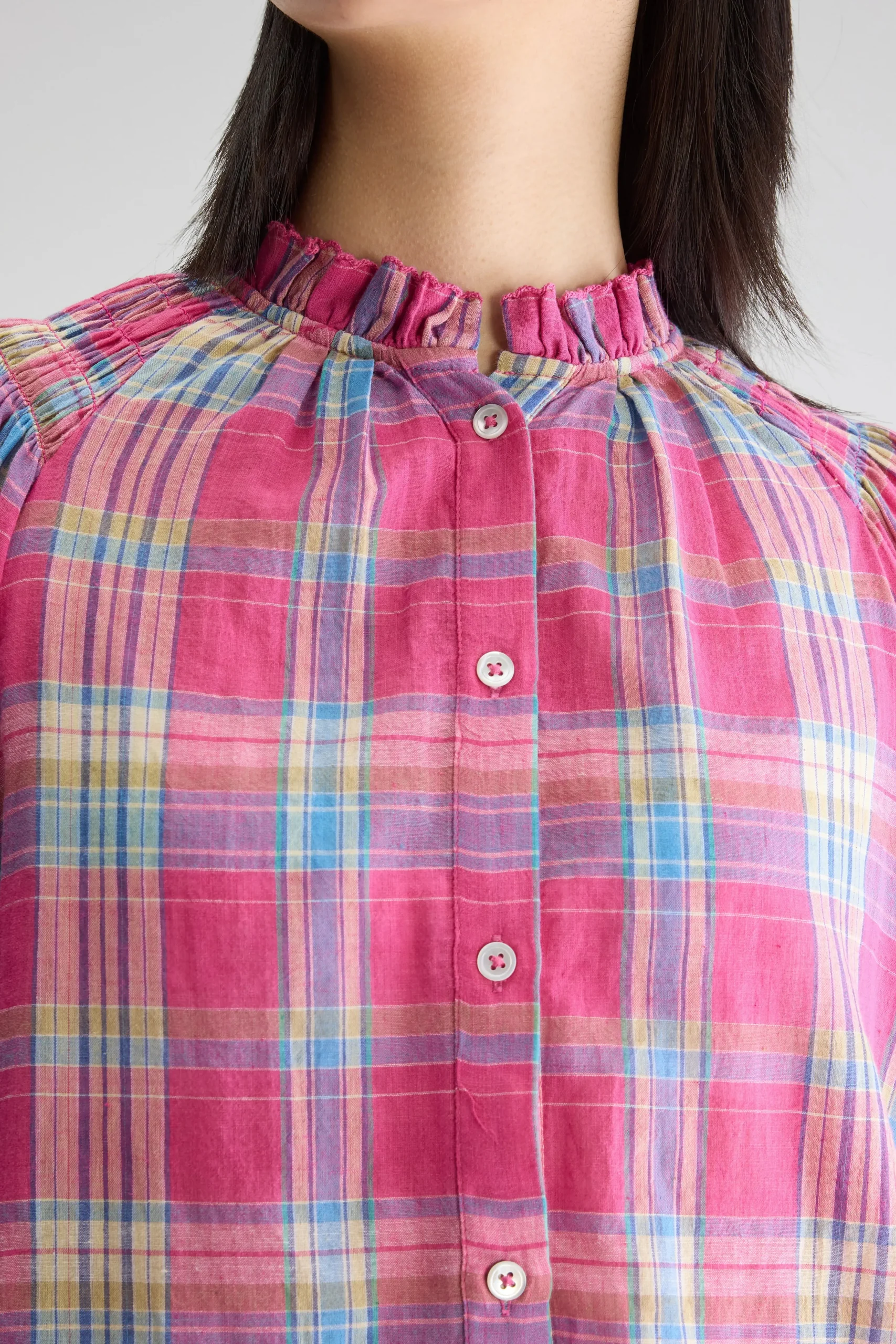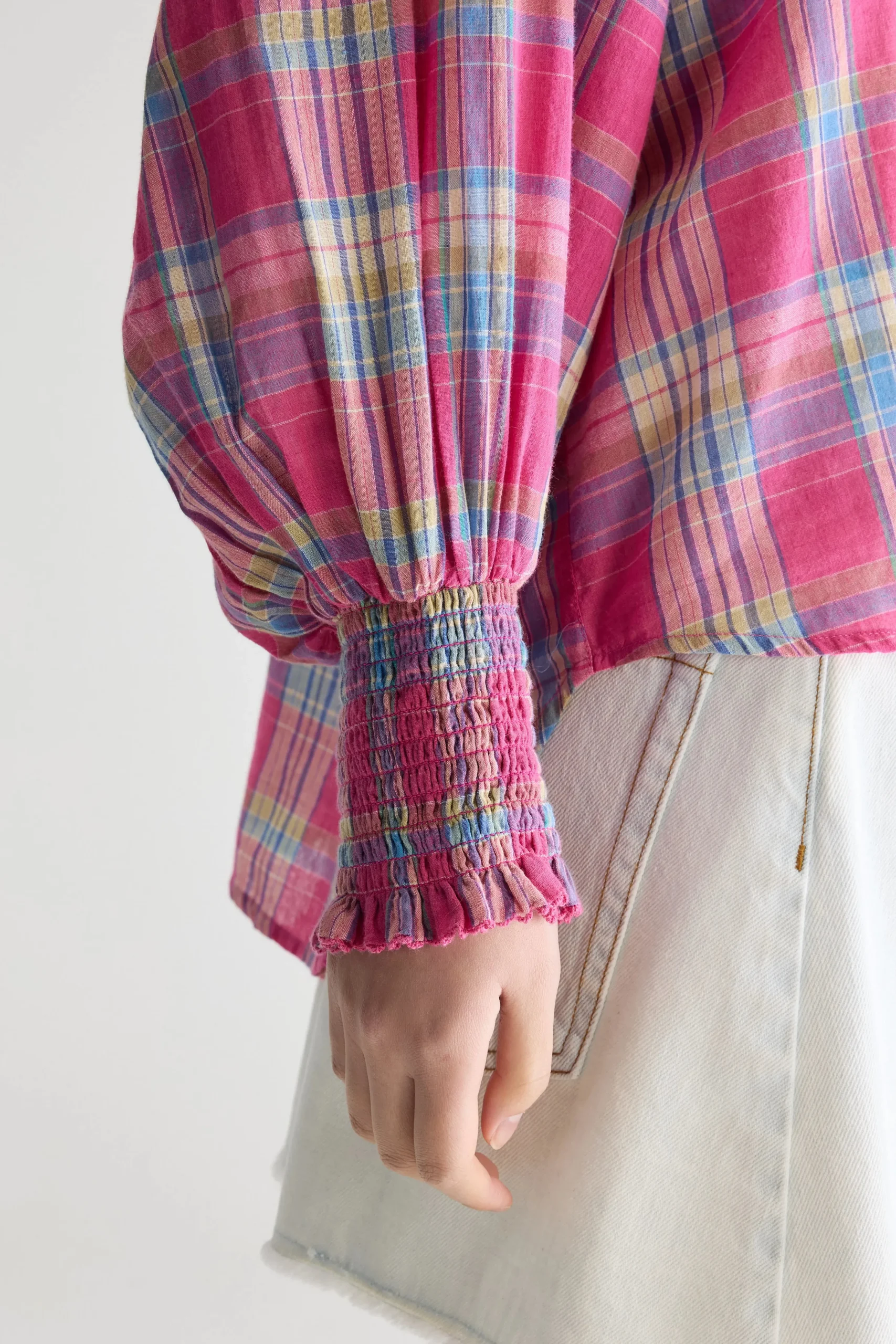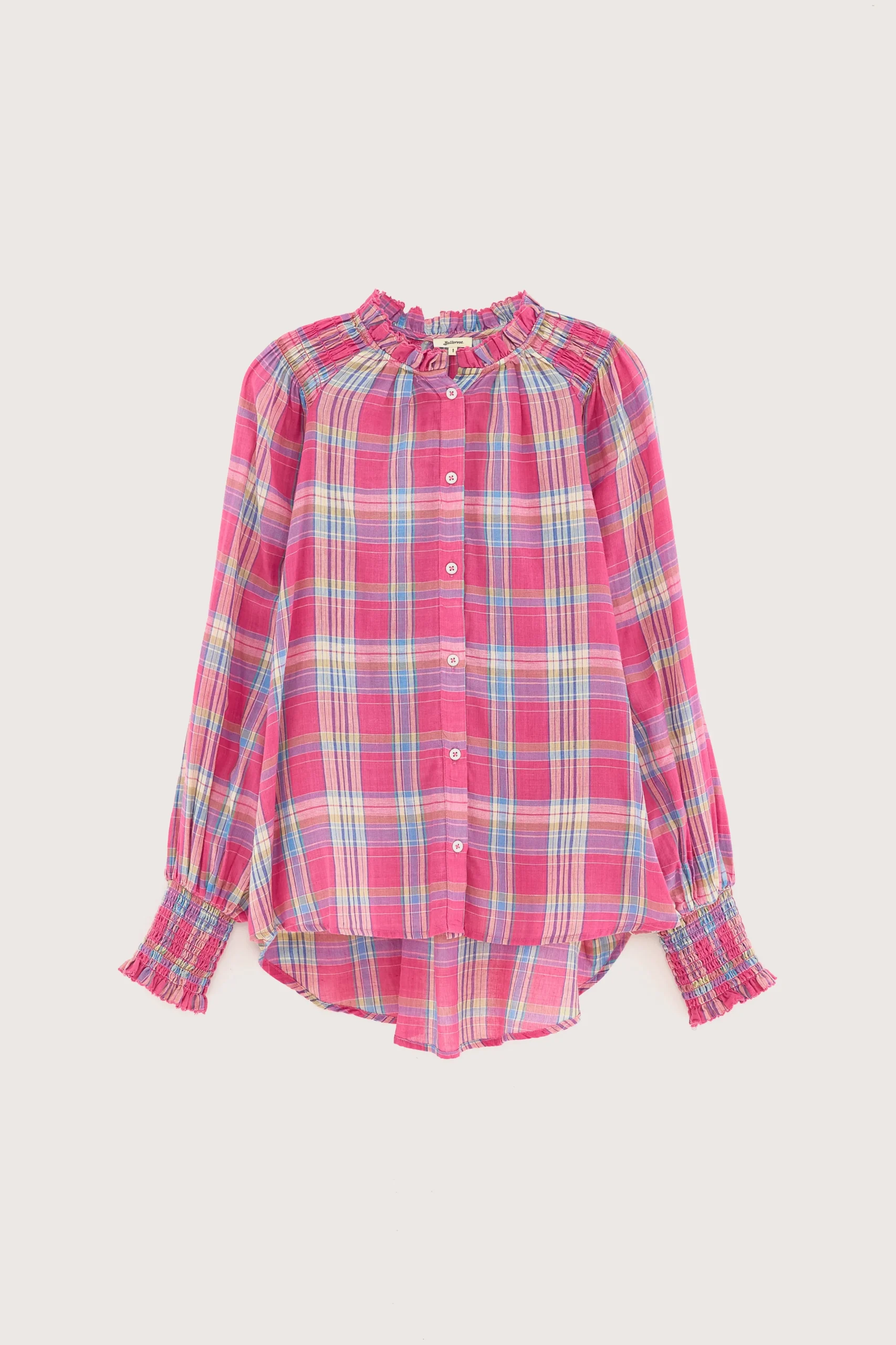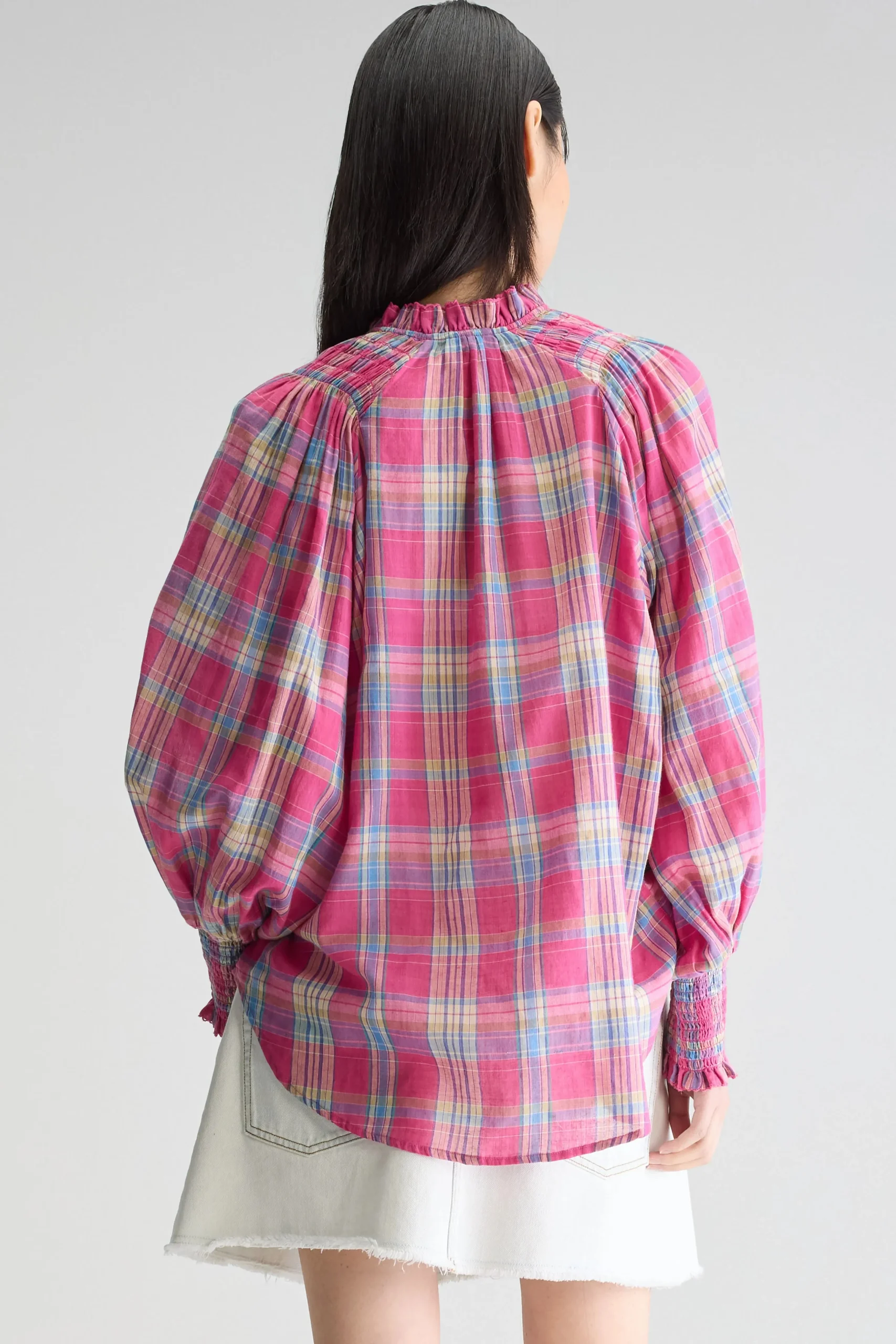 Klassieke blouse met lange raglanmouwen, gesmokte details en een opstaande geruite kraag, gemaakt van katoen met een kle…