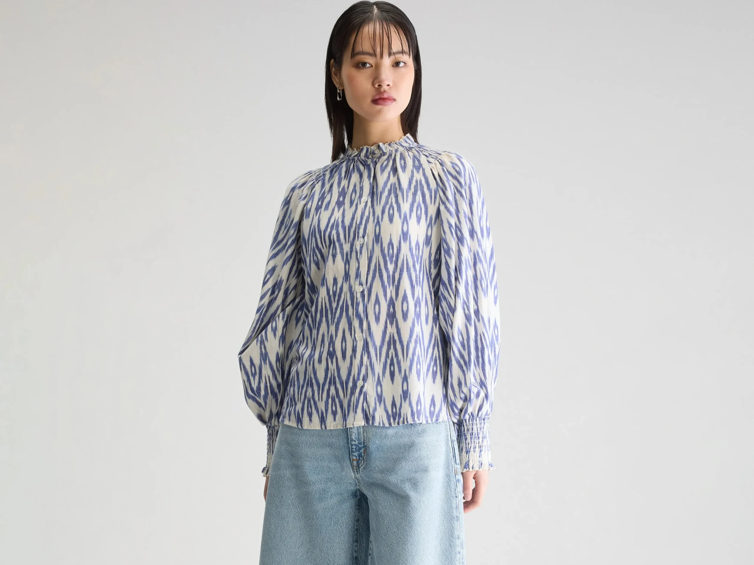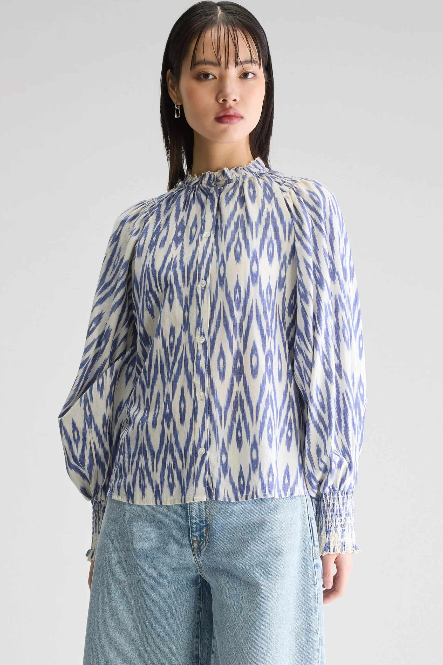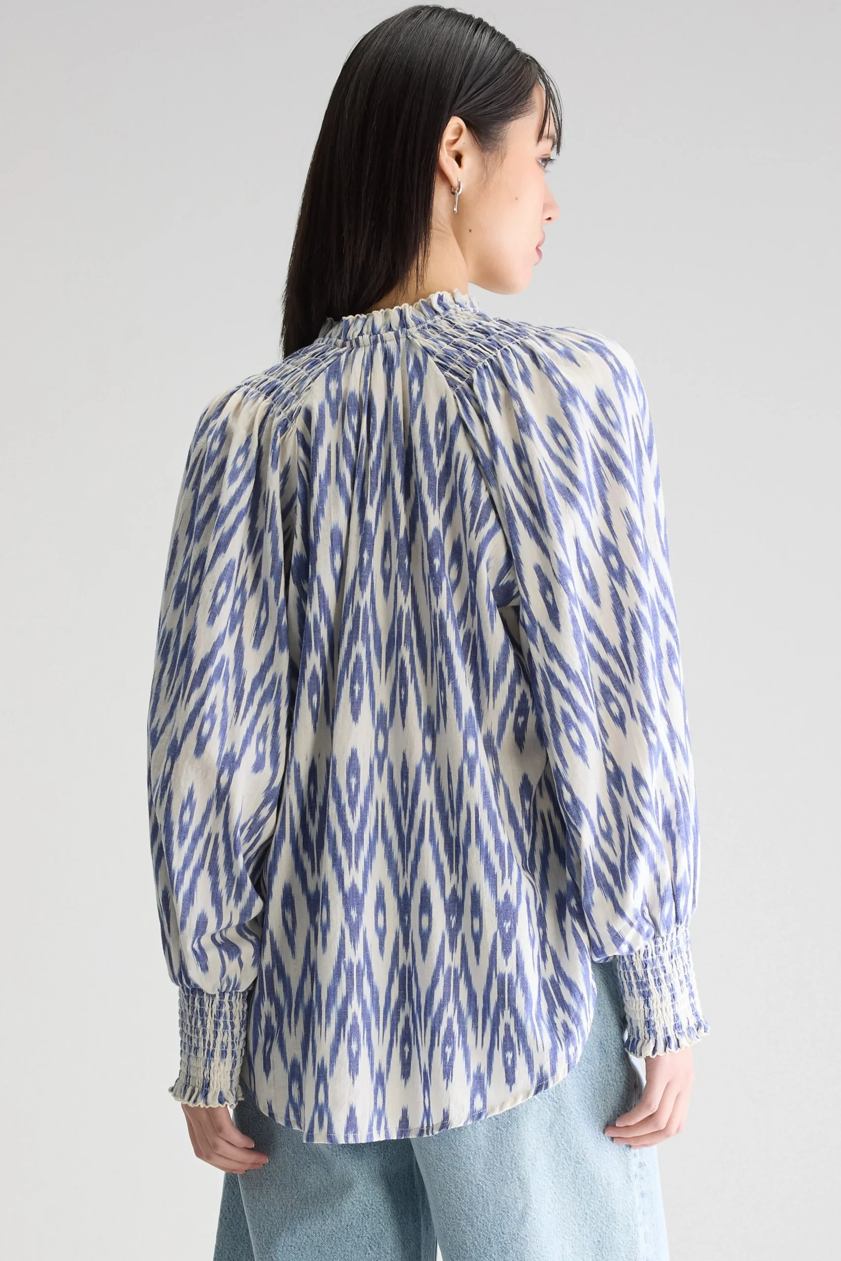 Klassieke blouse met lange raglanmouwen, gesmokte details en een opstaande kraag met franje, gemaakt van ikat katoen.Reg…