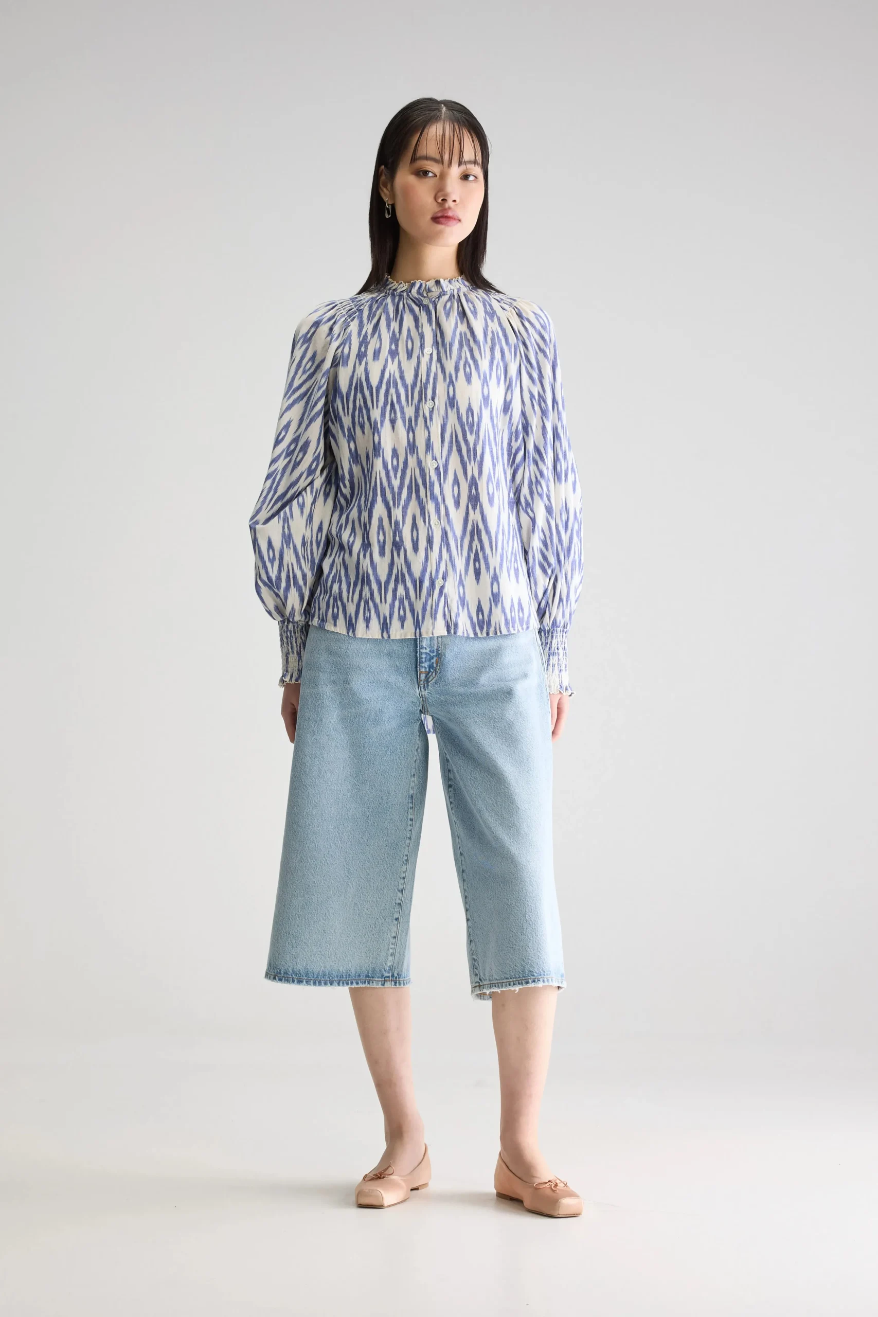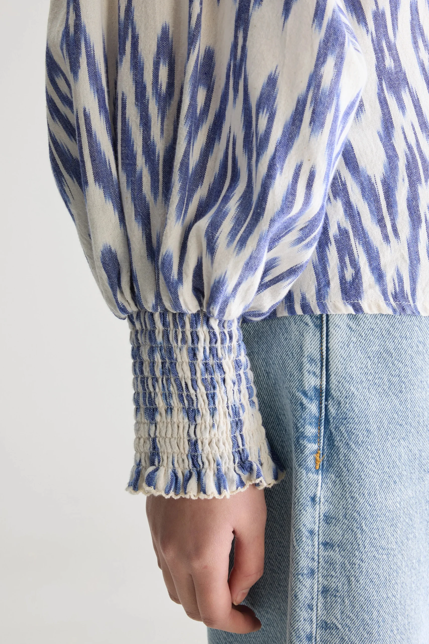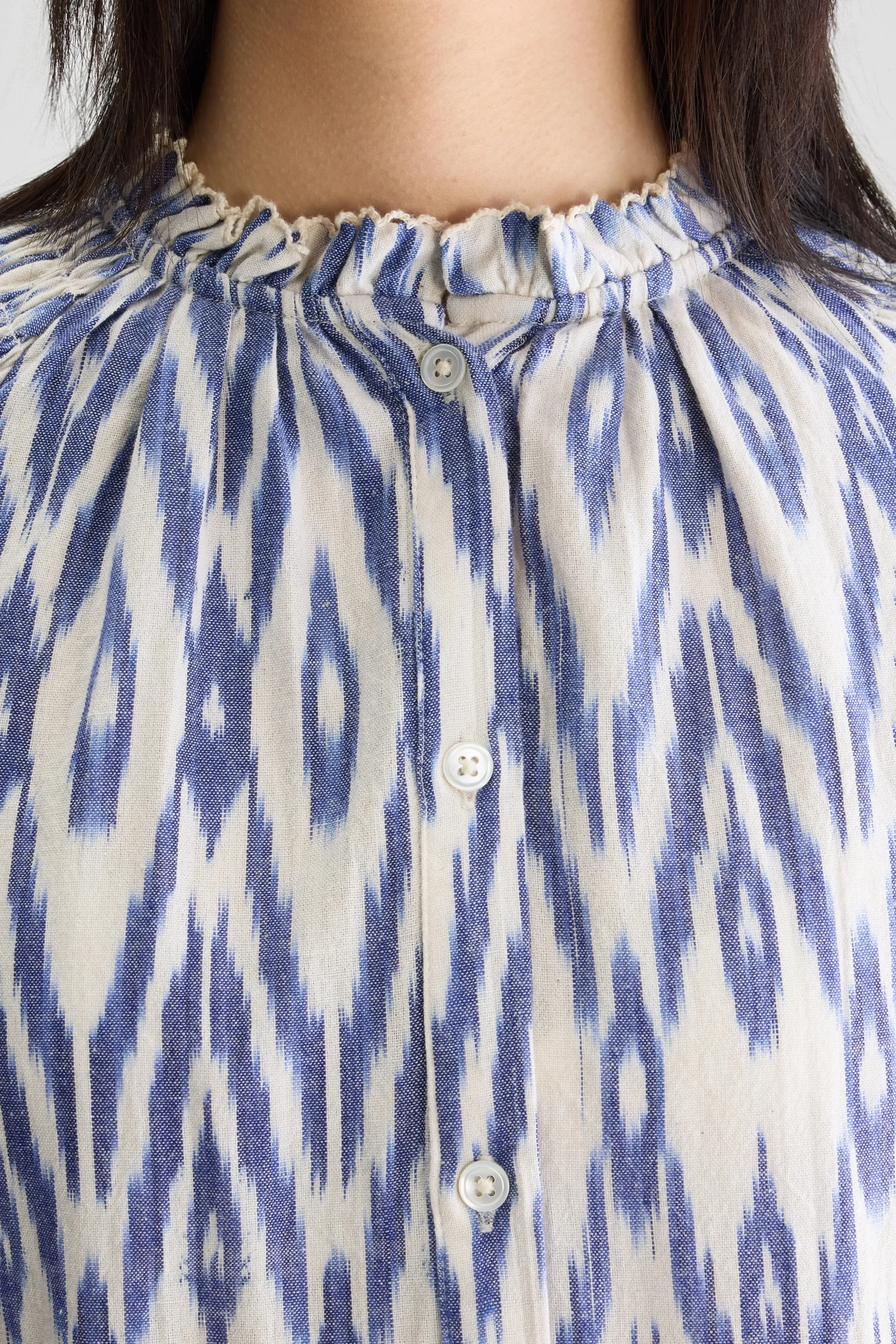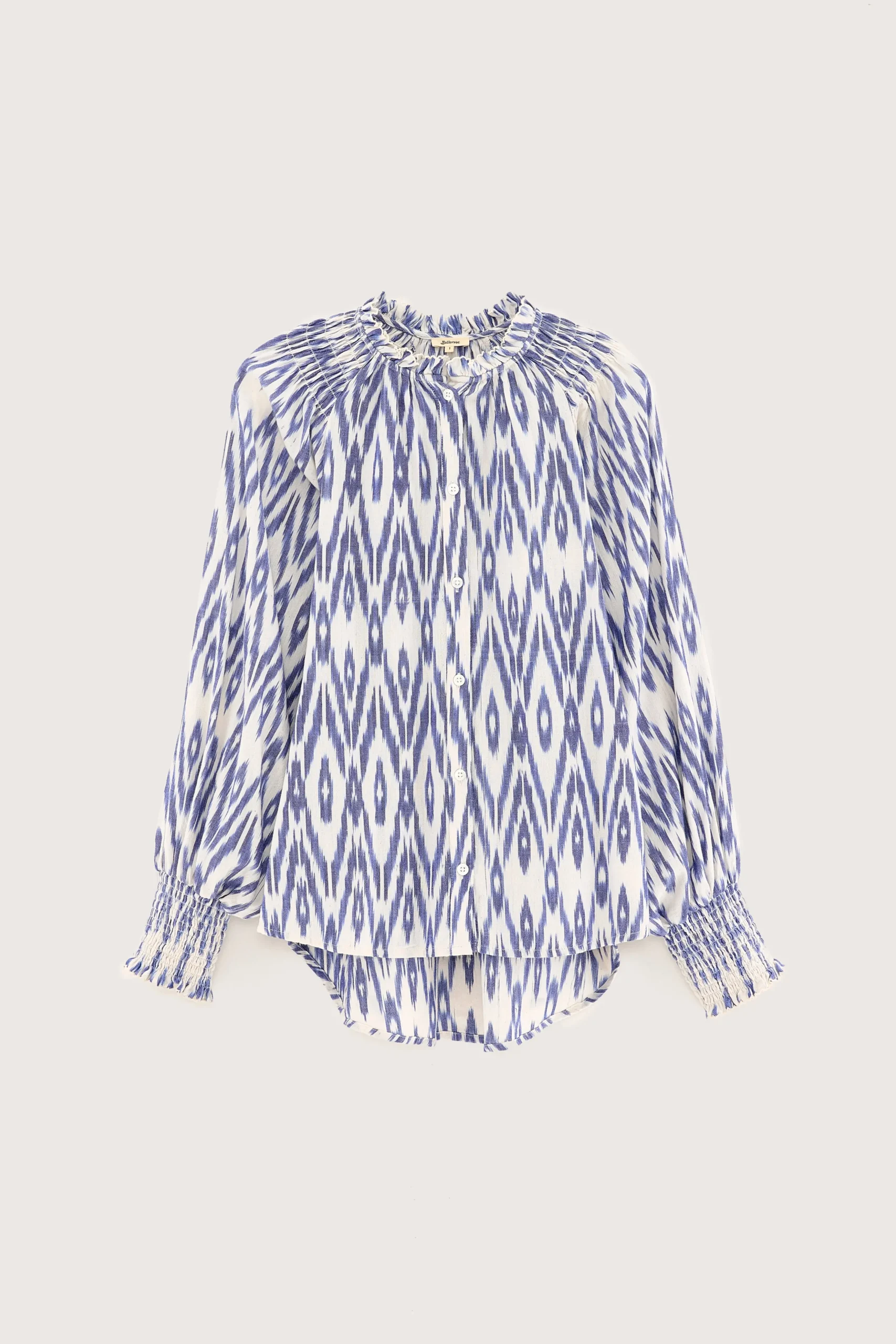Klassieke blouse met lange raglanmouwen, gesmokte details en een opstaande kraag met franje, gemaakt van ikat katoen.Reg…