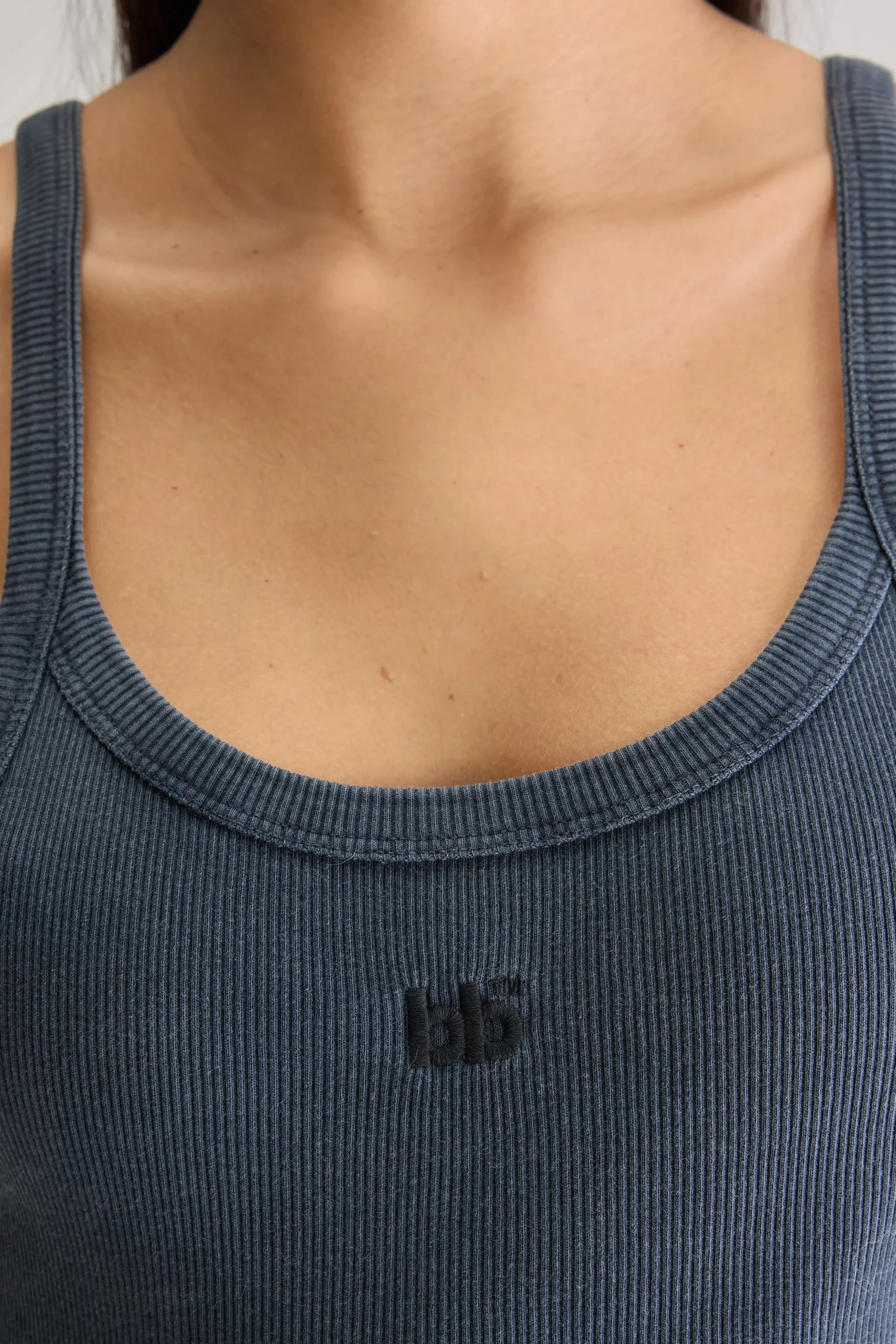 Slim fit tanktop met “bb”-borduursel op de voorkant, gemaakt van geribd, navy katoenjersey.Slim fitRacer-rug “bb”-borduursel op de voorkantMiddelzwaar, geribd katoenjersey