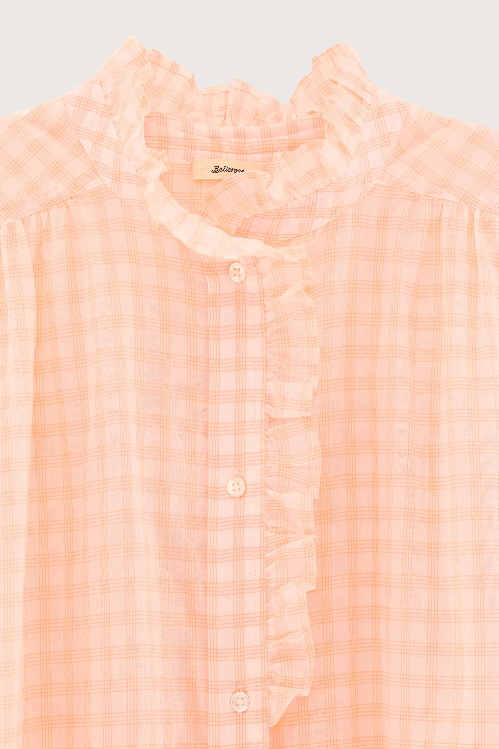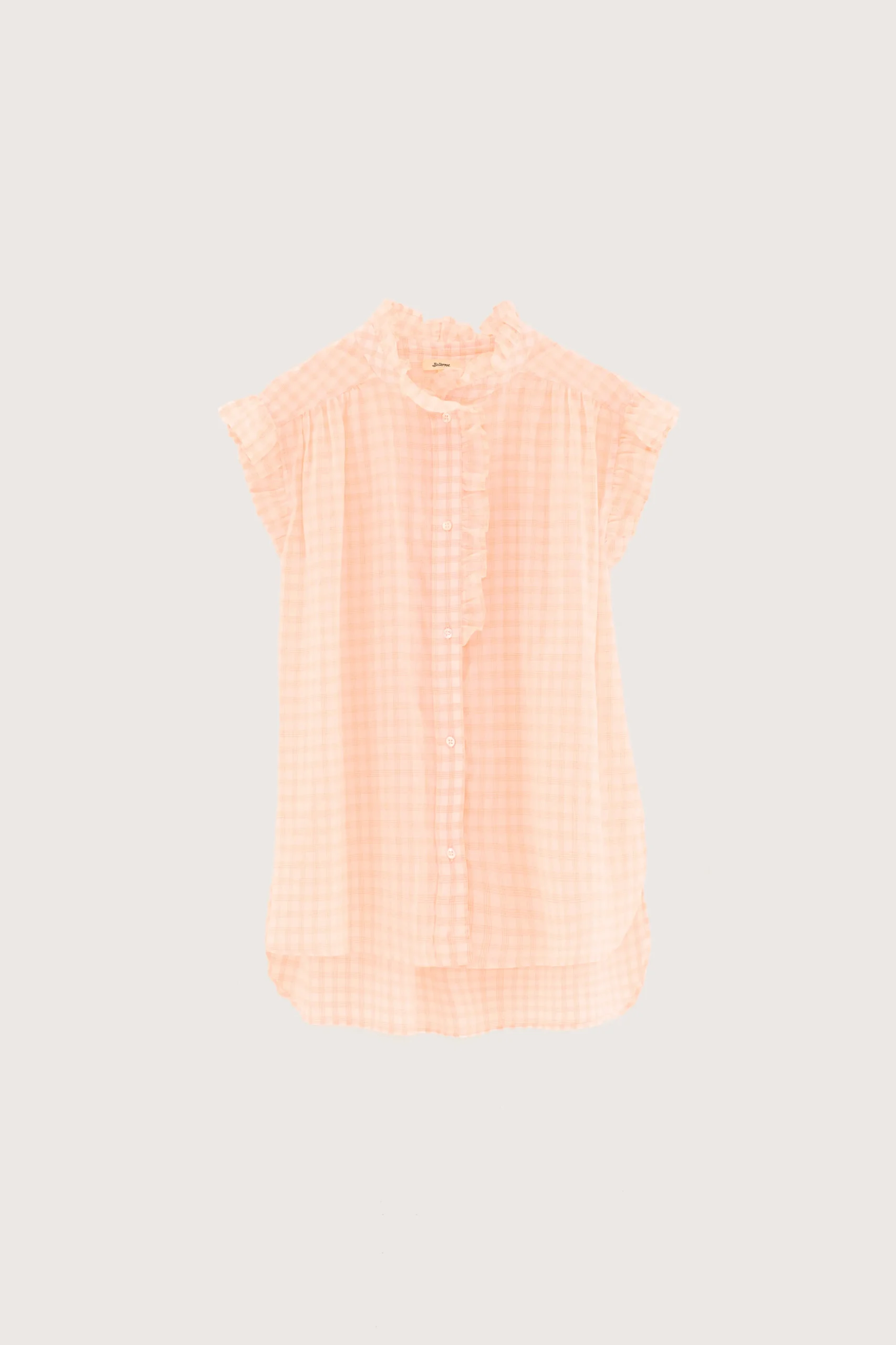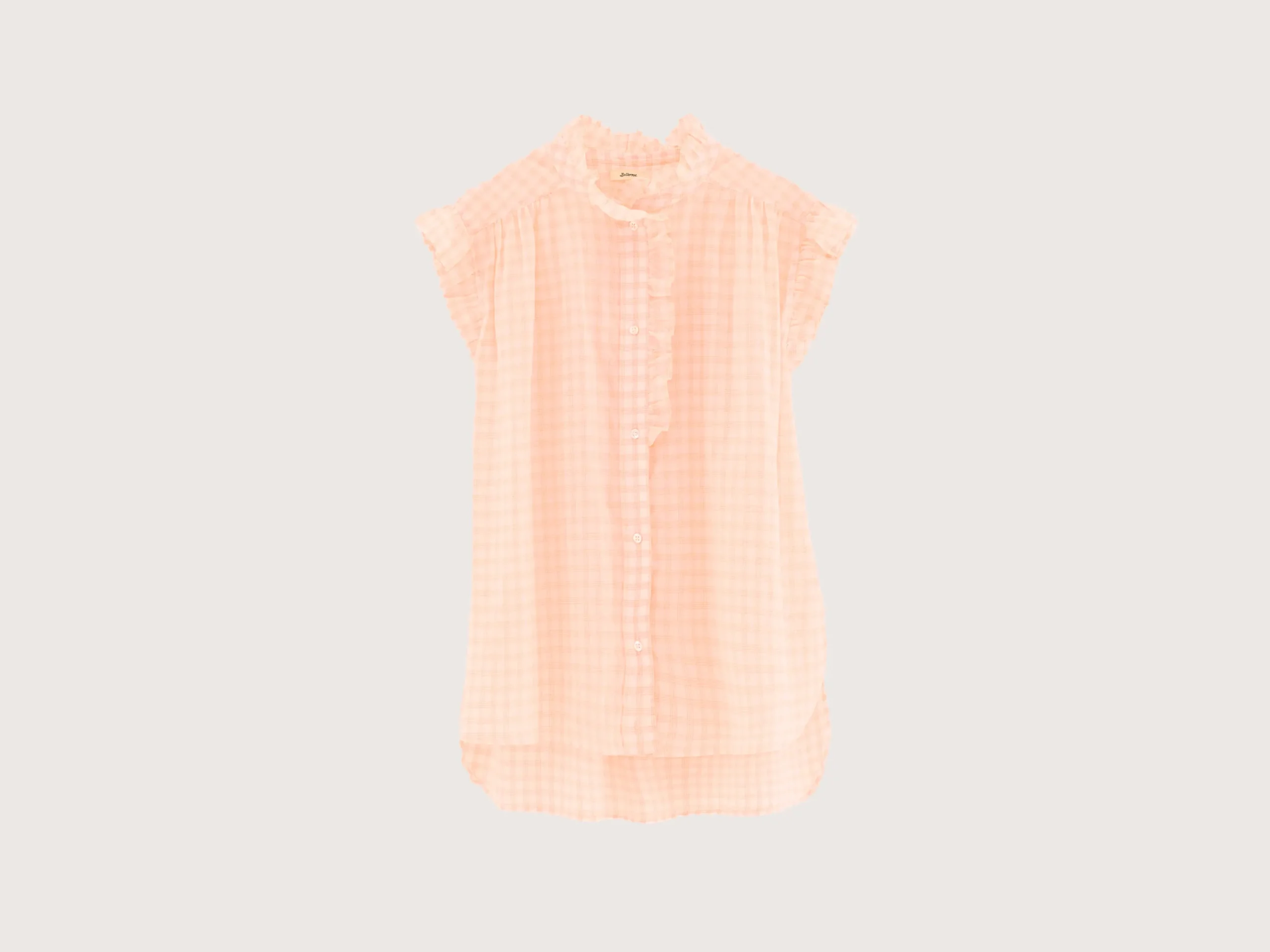 Mouwloze blouse met ruches, knoopsluiting aan de voorkant en gerimpelde rug, gemaakt van delicate roze en witte ruitjes….