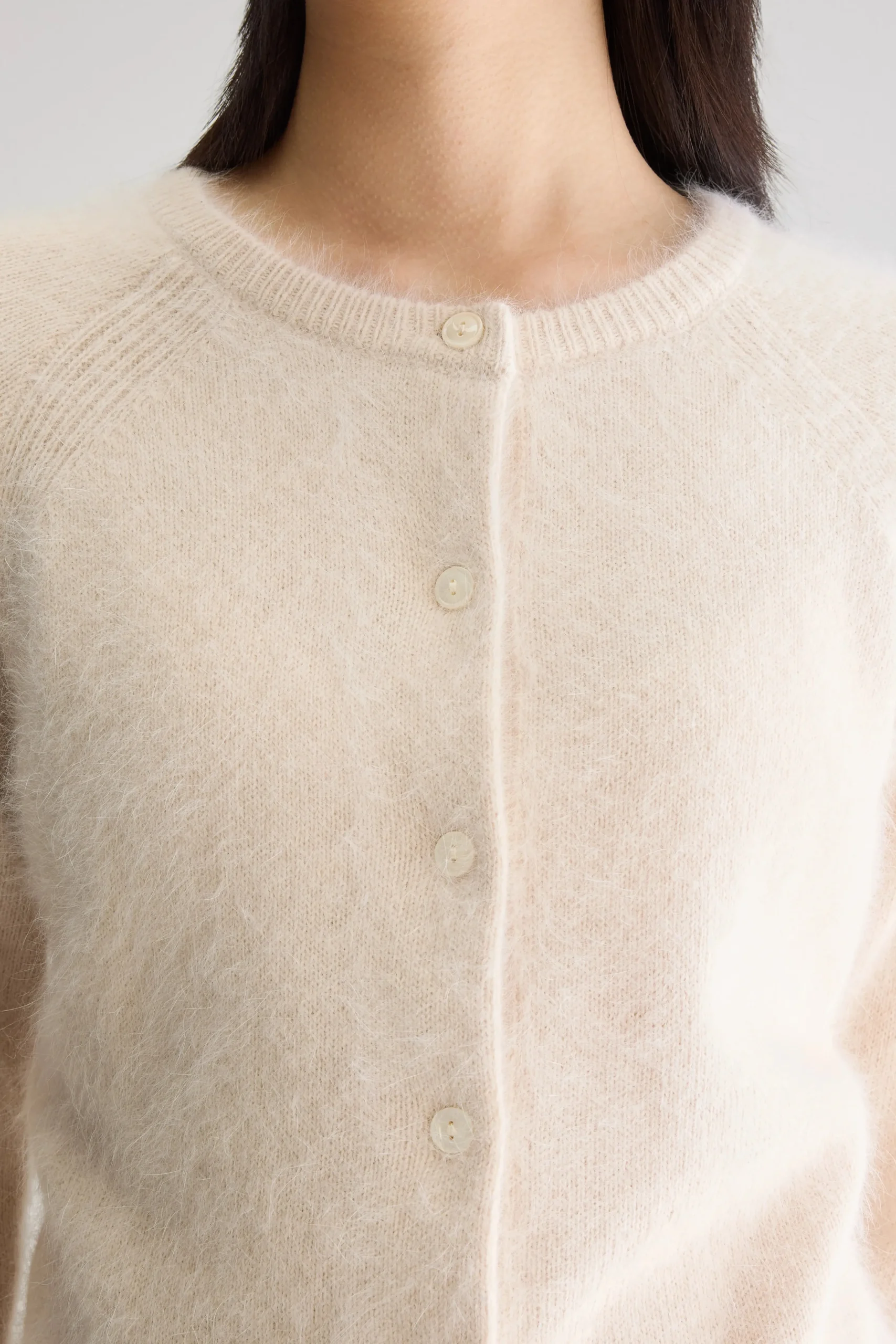 Klassieke cardigan met ronde hals en raglanmouwen, gemaakt van een zachte angoramix in ecru.Regular pasvormRonde hals Lange mouwen Geribde boordenMedium dikte