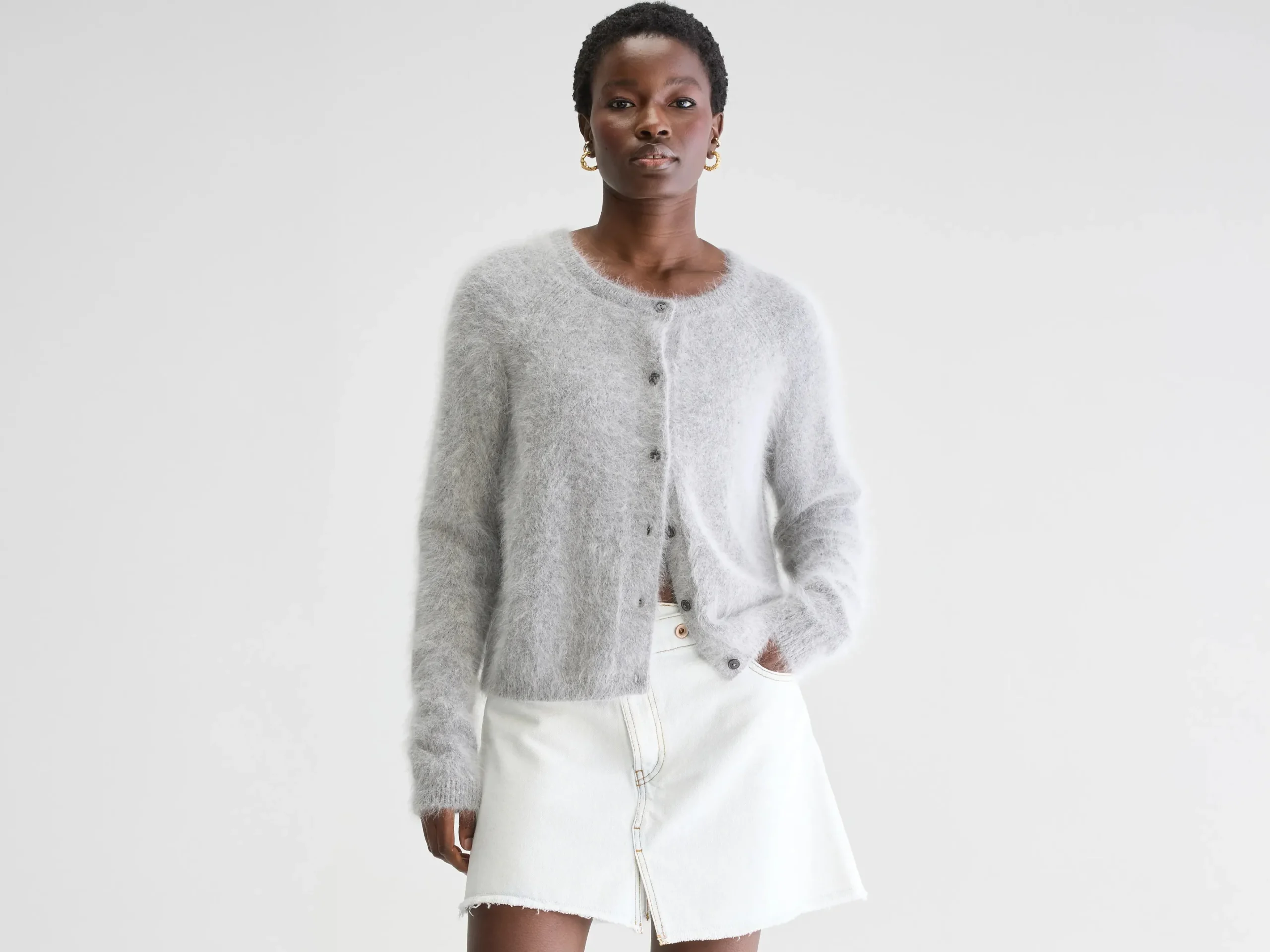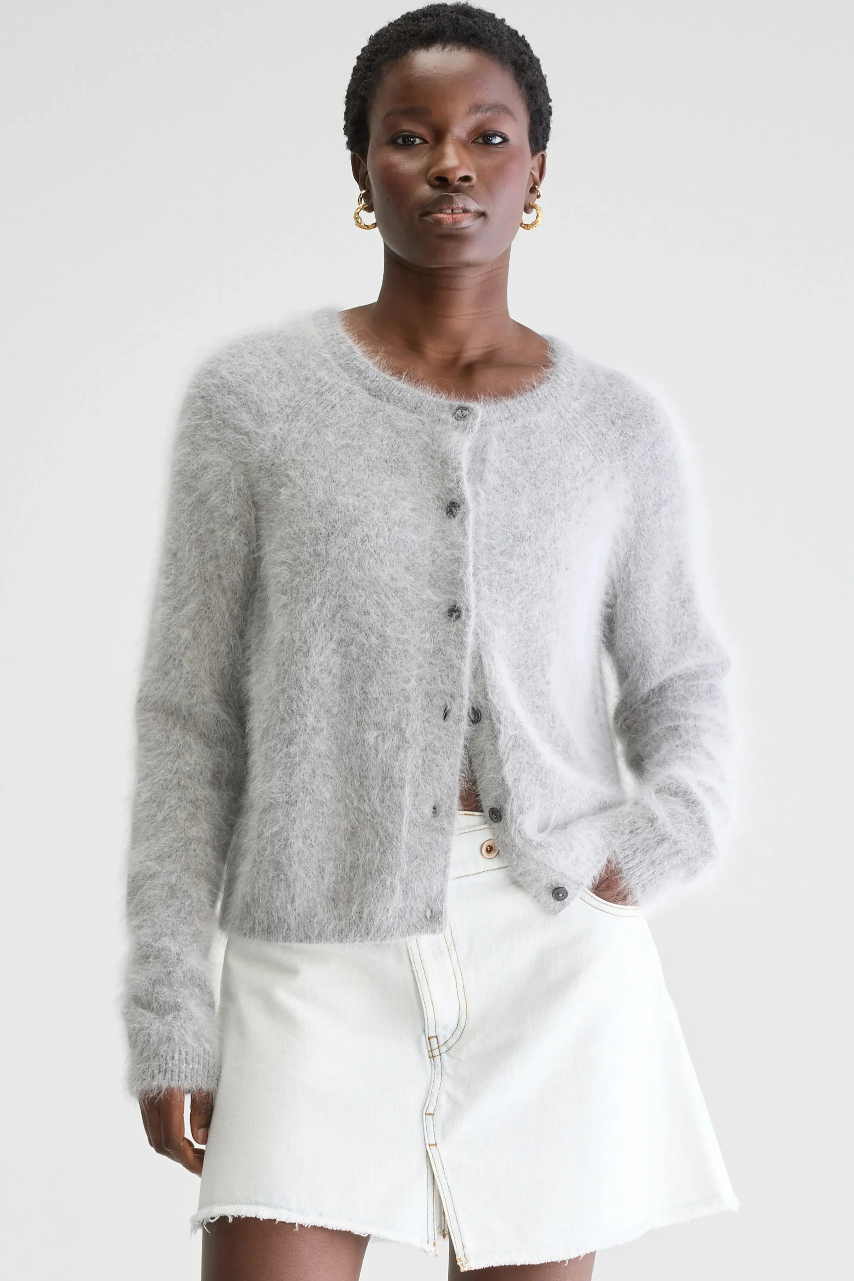 Klassieke cardigan met ronde hals en raglanmouwen, gemaakt van een zachte angoramix in heidegrijs.Regular pasvormRonde hals Lange mouwen Geribde boordenMedium dikte