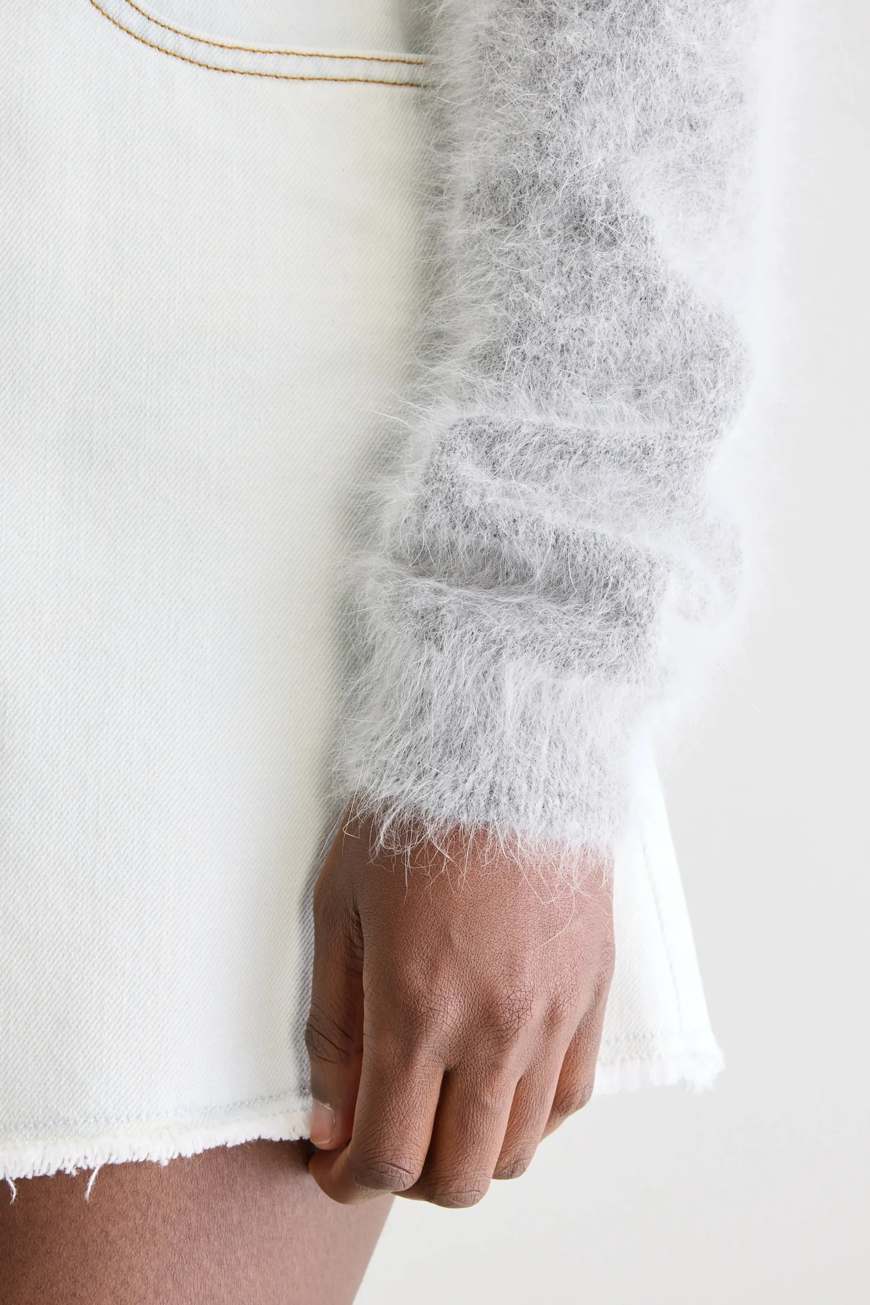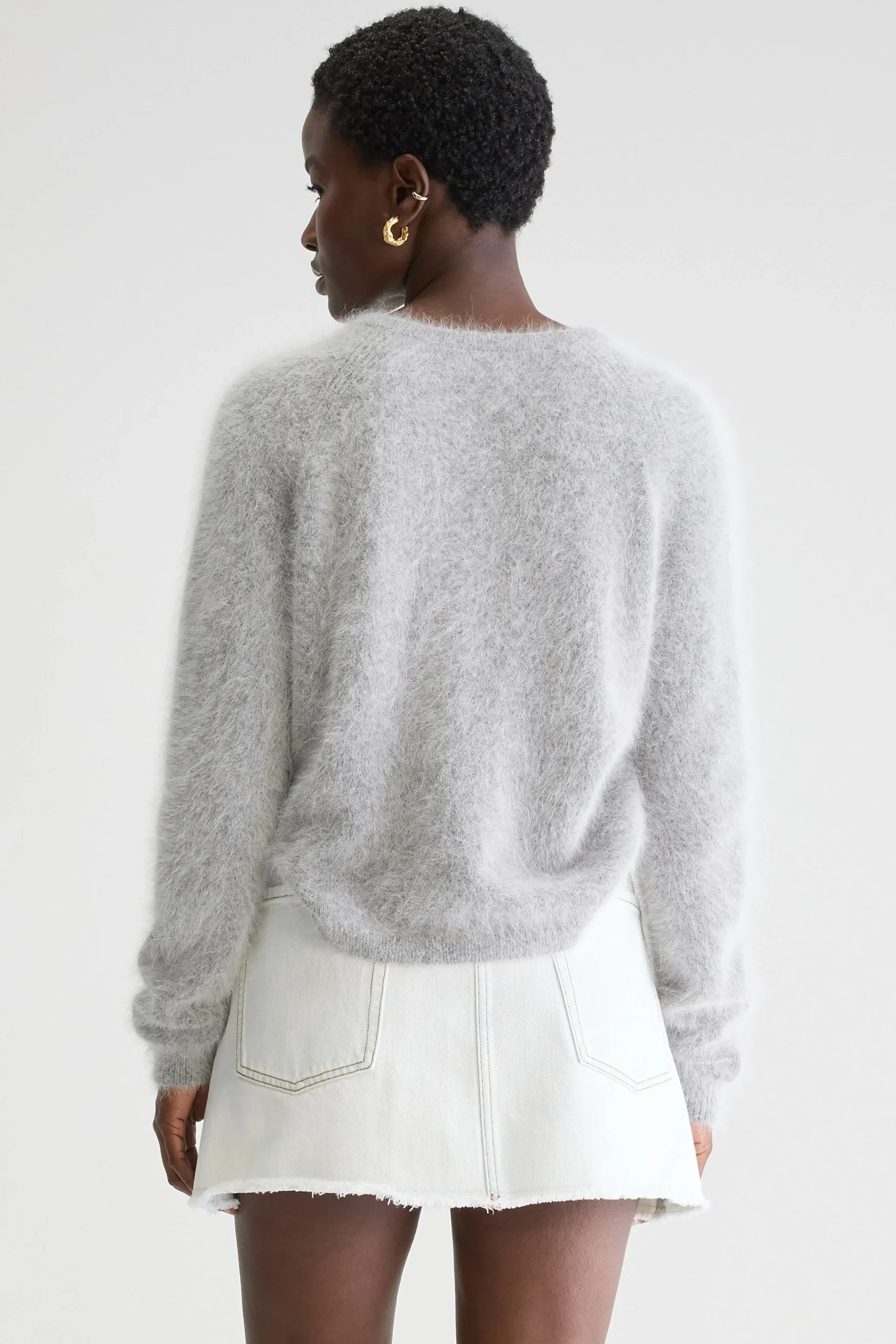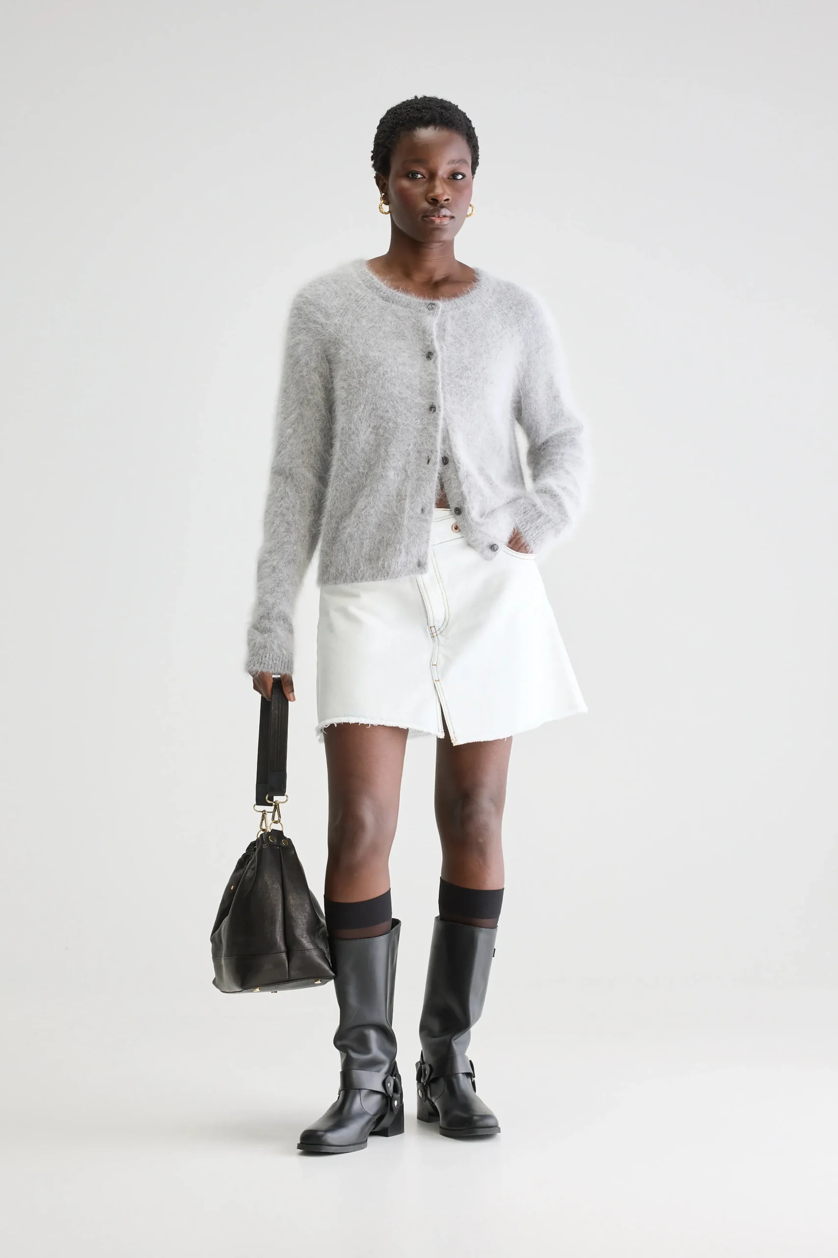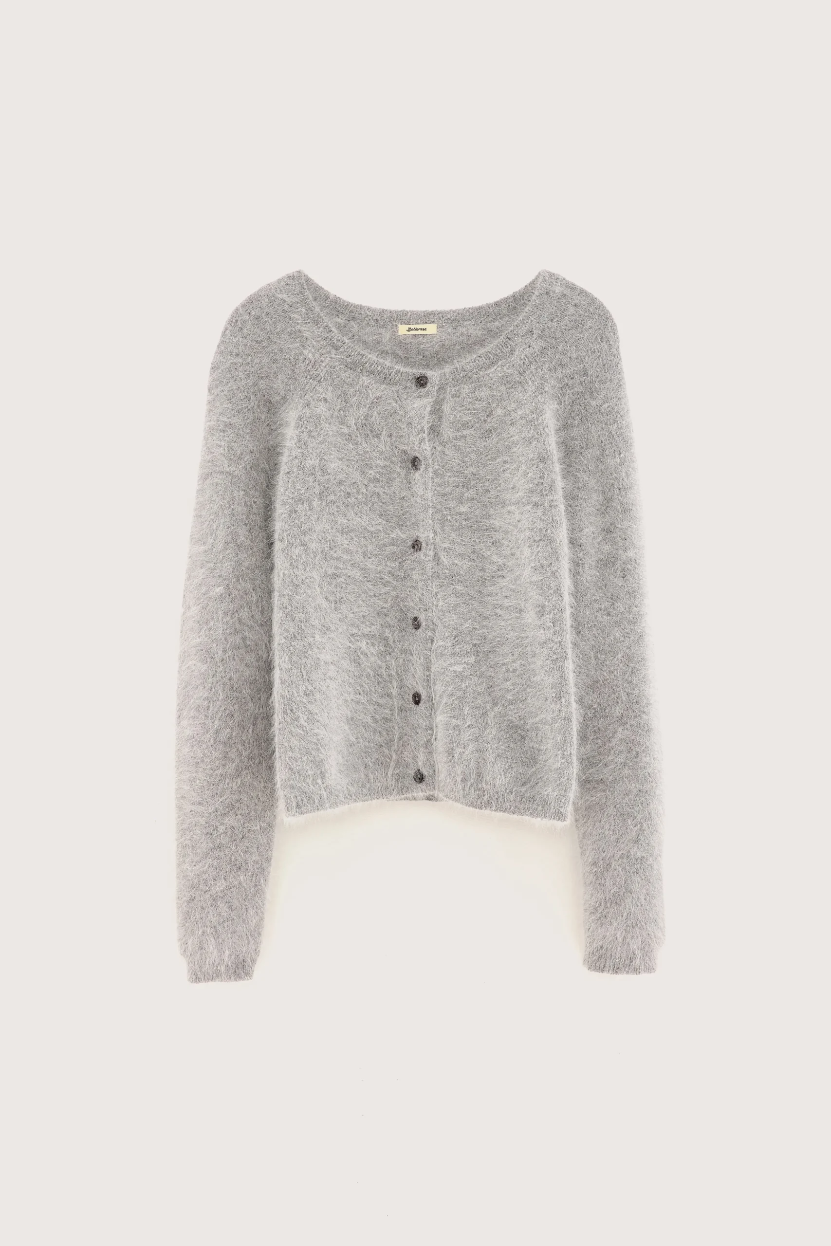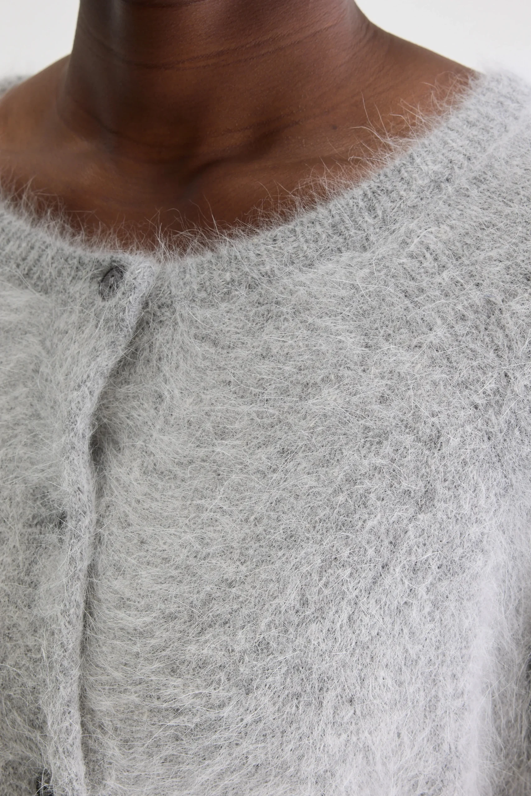 Klassieke cardigan met ronde hals en raglanmouwen, gemaakt van een zachte angoramix in heidegrijs.Regular pasvormRonde h…