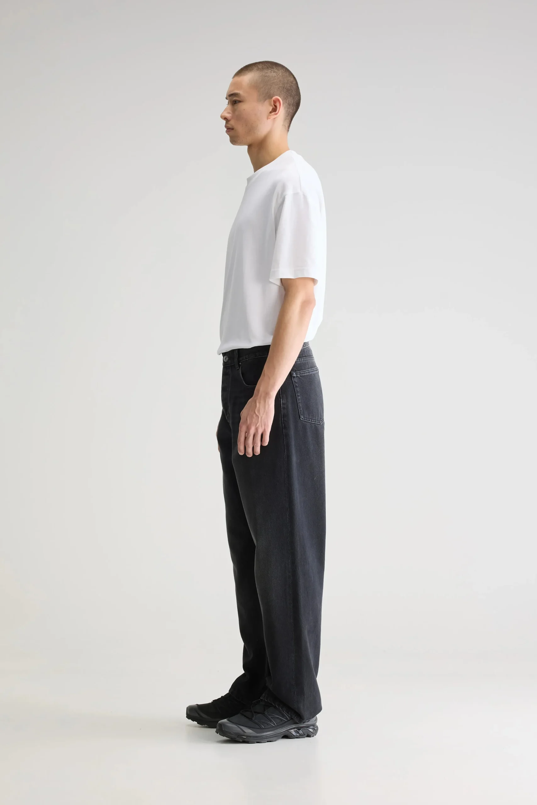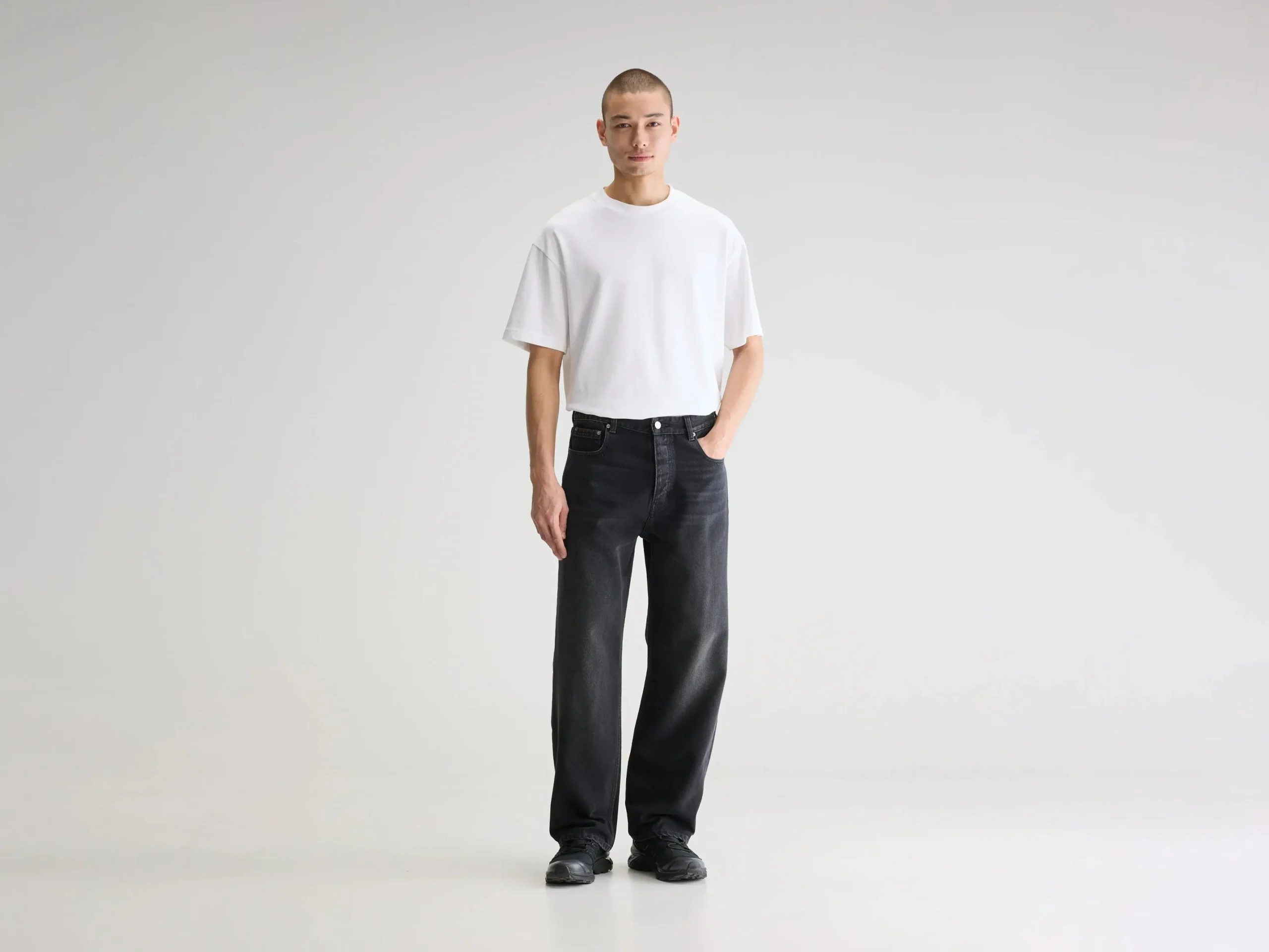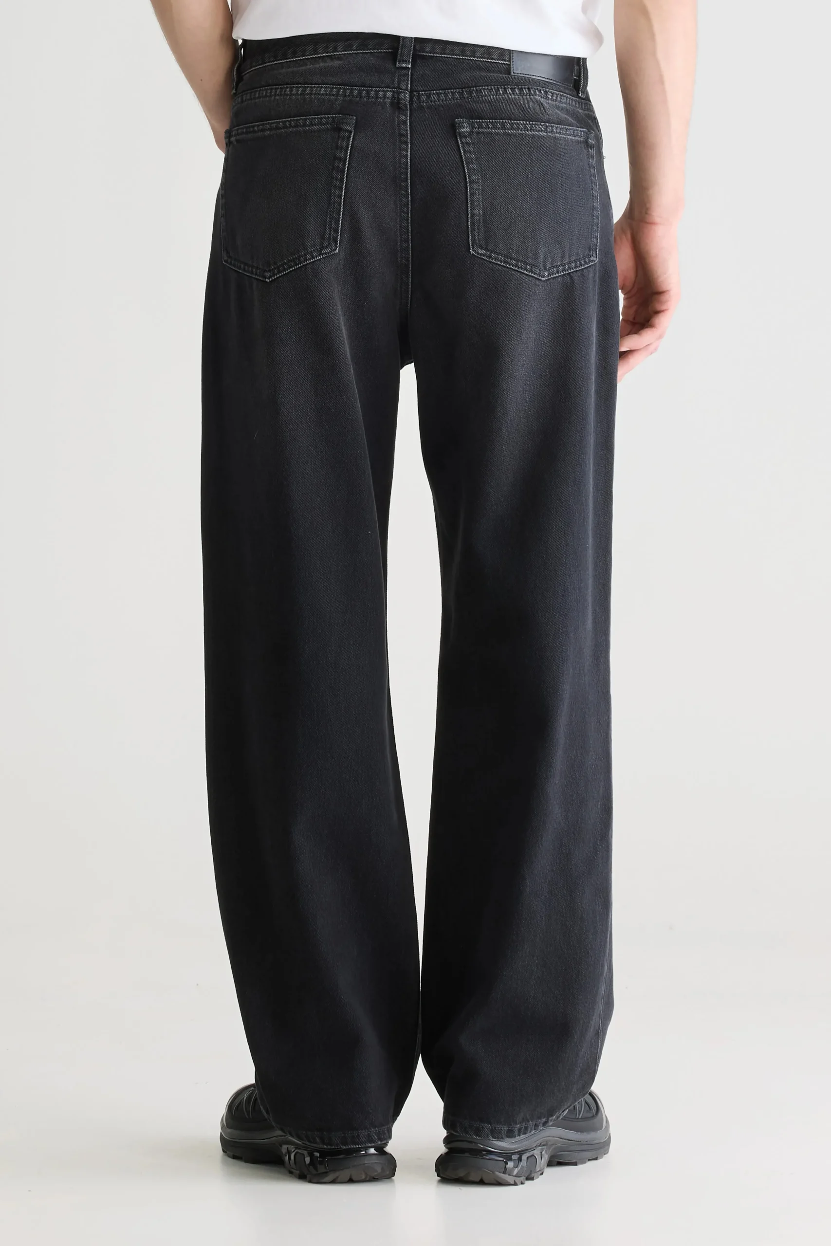Losse 5-pocketjeans met lager kruis en rechte wijde pijpen, gemaakt van middelzwaar katoen en Lyocell-denim in zwart met een “gebruikte” look.Losse pasvormLager kruis, wijde rechte pijpenMiddelzwaar katoen en Lyocell-denim, geen stretchKnoopsluitingBinnenbeenlengte: 31″ (gebaseerd op maat 32)De binnenbeenlengte past zich lichtjes aan afhankelijk van de gekozen maat, zodat de pasvorm proportioneel blijft.Zoom: 24,7 cmVoorheen: Point Jeans
