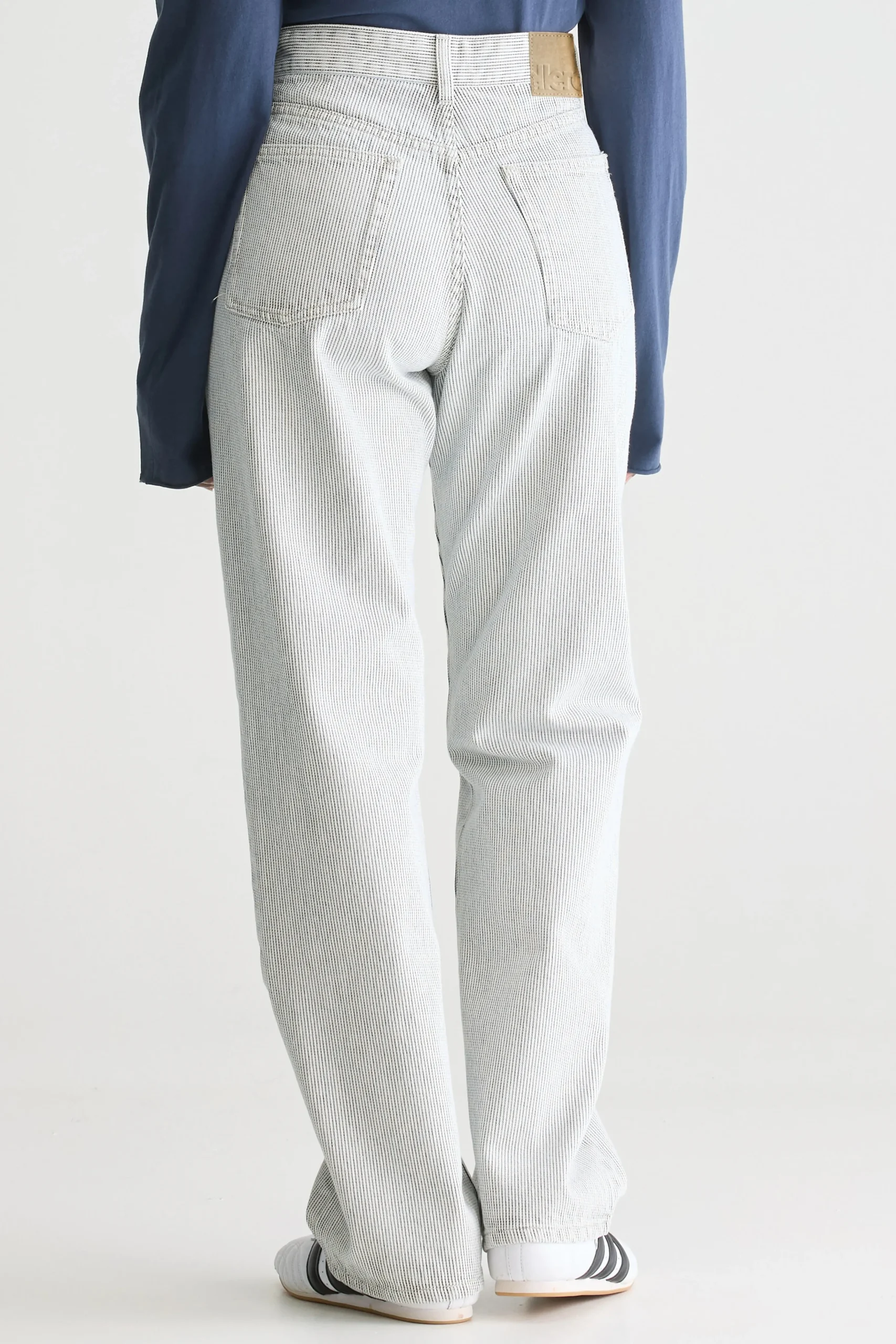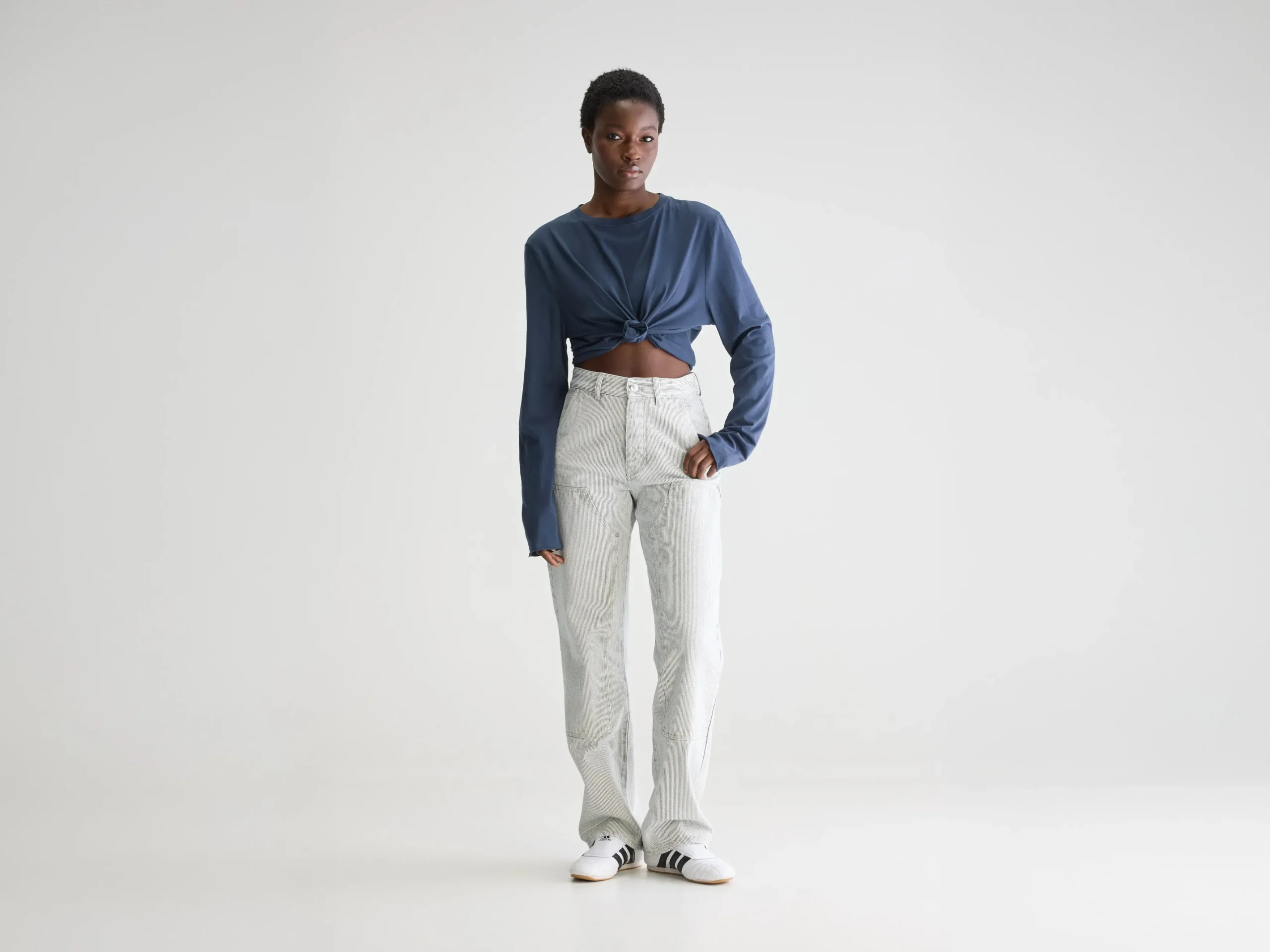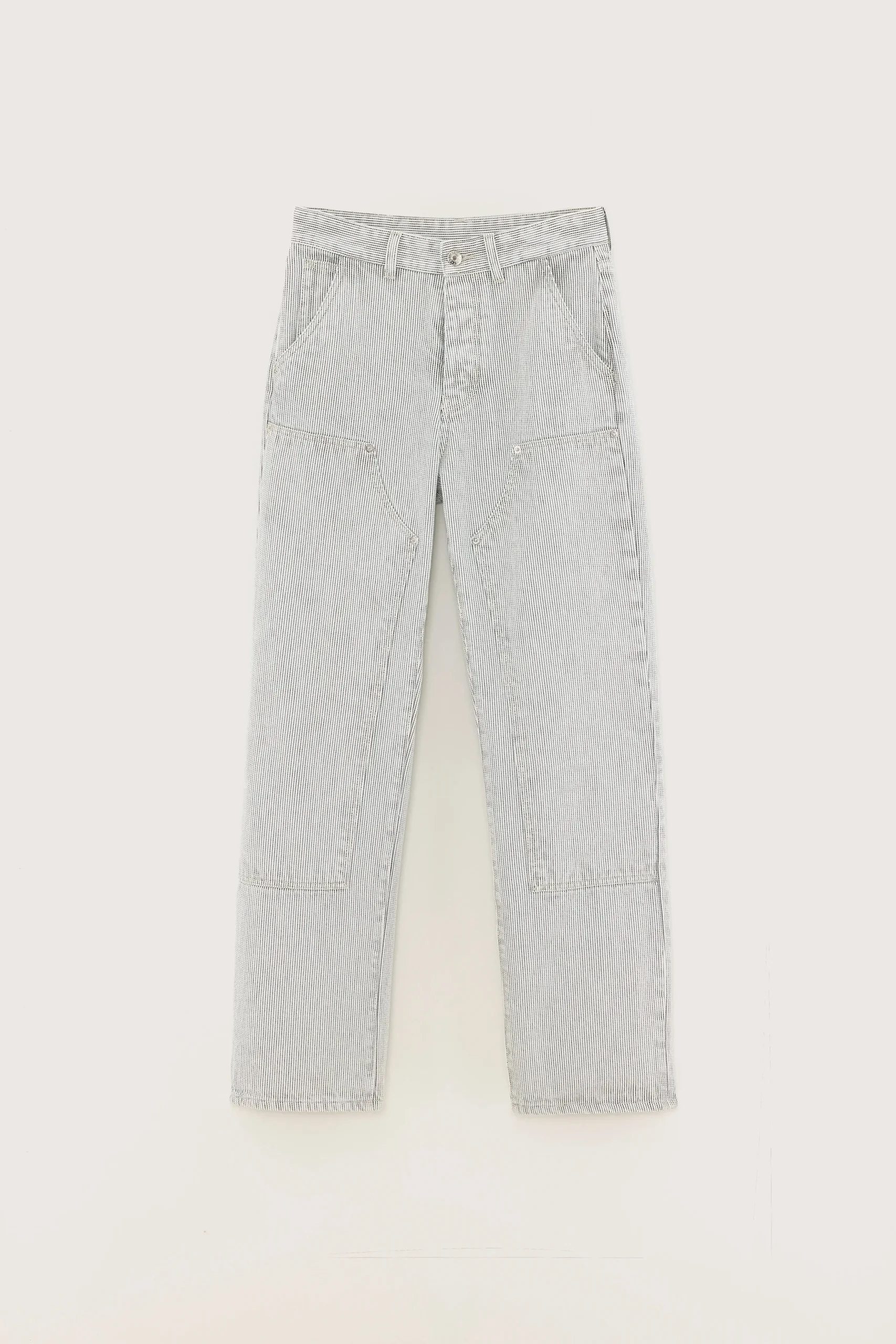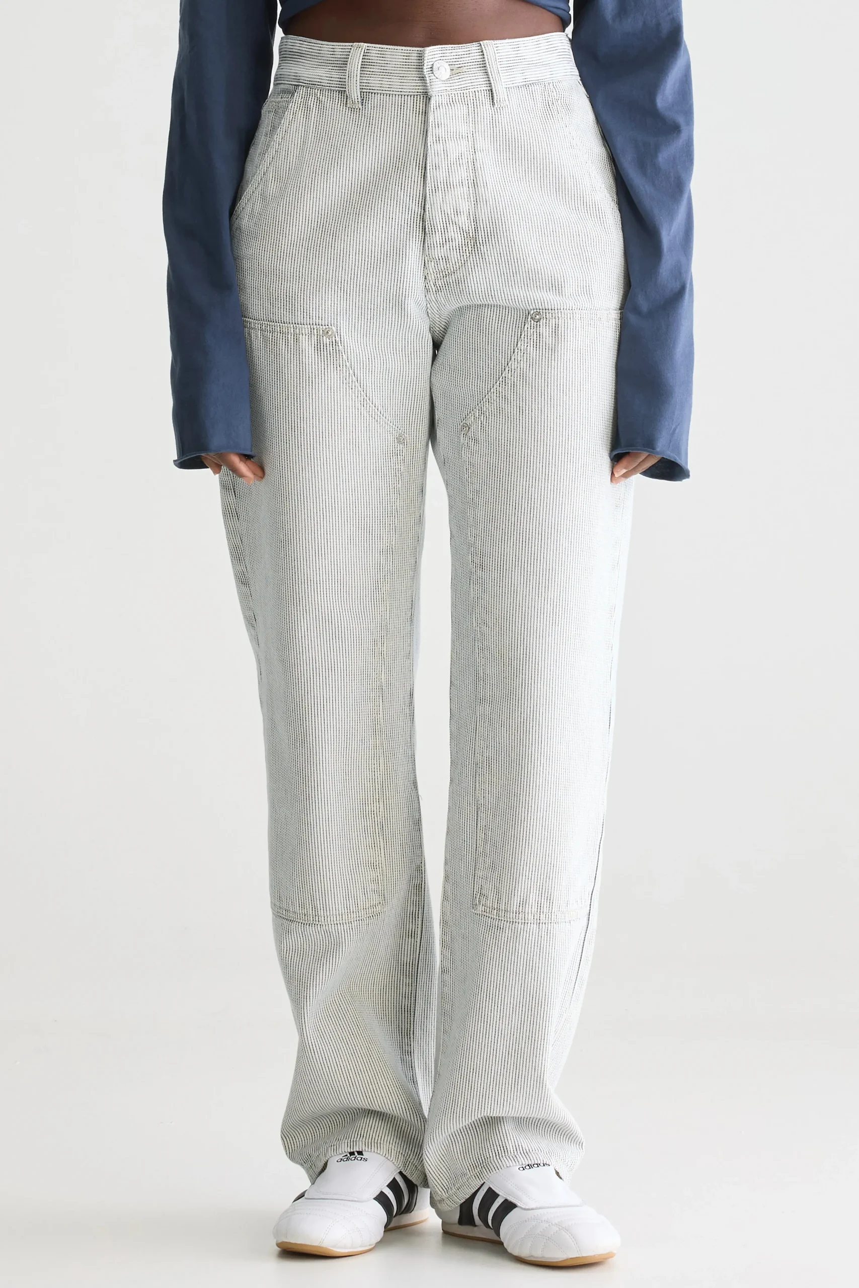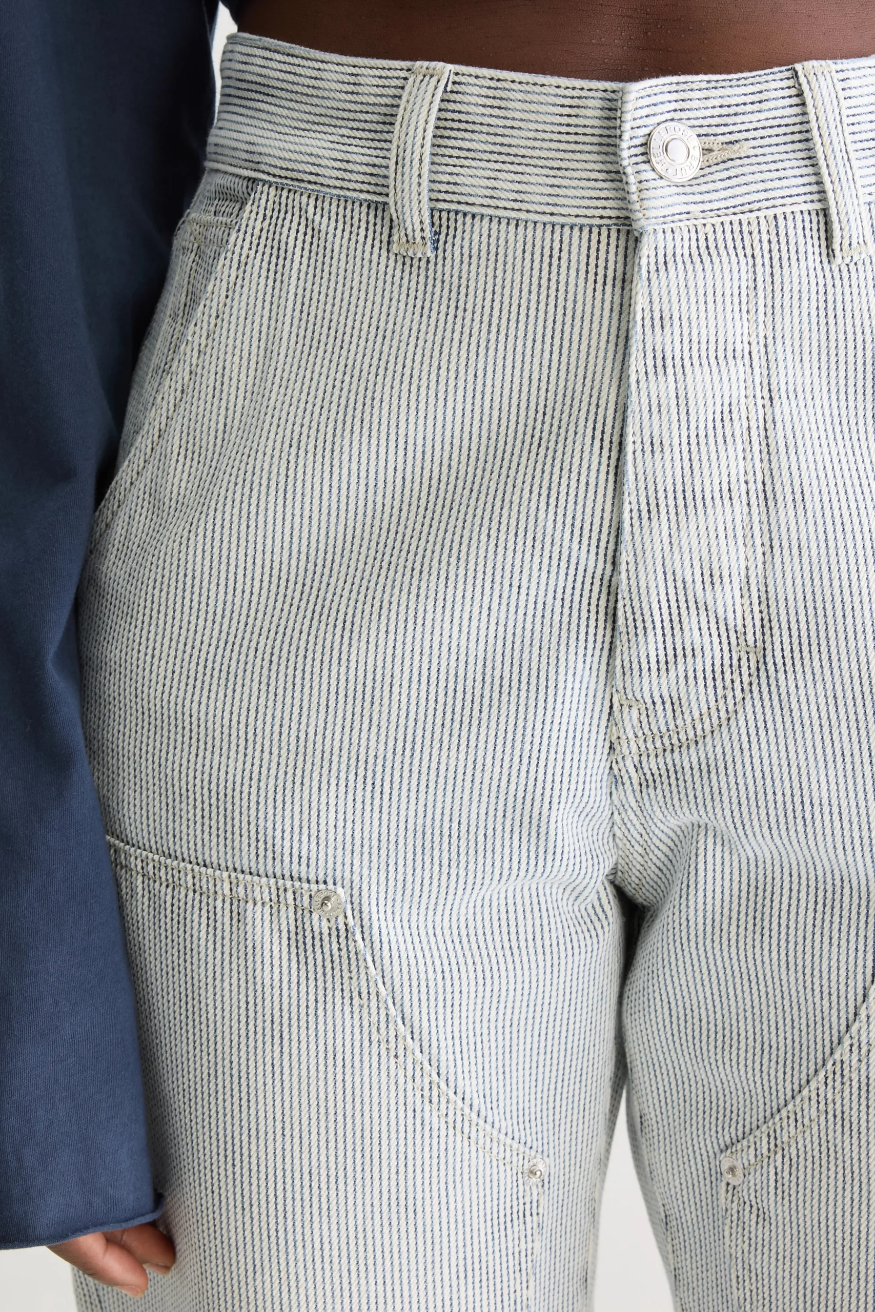 Relaxte mid-waist jeans in carpenter-stijl, klinknagels op de voorkant en schuine zakken, van ecru denim met dunne blauwe strepen.Relaxte pasvorm, carpenter-stijl Mid-waist, rechte pijpen Middelzwaar, geen stretchToon-op-toon patches vastgezet met koperen klinknagelsSchuine zakken vooraan Knoopsluiting Binnenbeenlengte: 31″(gebaseerd op maat 26)De binnenbeenlengte past zich lichtjes aan afhankelijk van de gekozen maat, zodat de pasvorm proportioneel blijft.Voorheen: Pulp Jeans