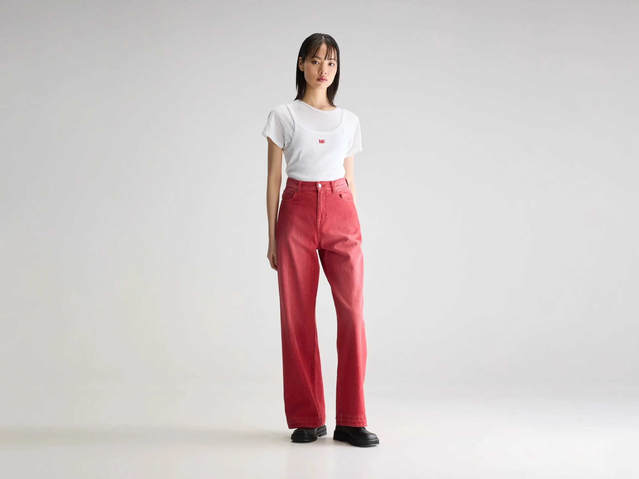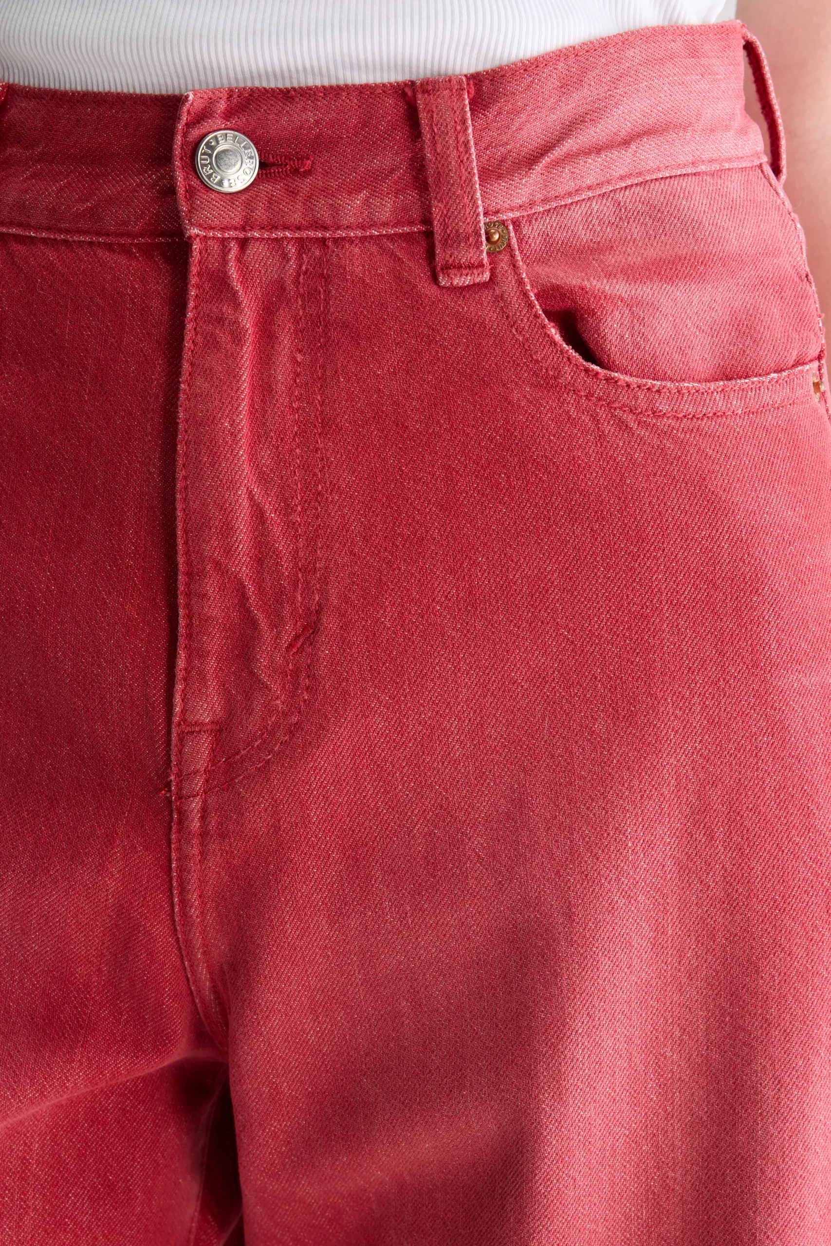 Boyfriend jeans met halfhoge taille en wijde pijpen van donkerrode denim, met distressed details op de zoom.Relaxte pasvorm Halfhoog, wijde pijpen Lichte denim, geen stretchRitssluitingBinnenbeenlengte: 32″(gebaseerd op maat 26)De binnenbeenlengte past zich lichtjes aan afhankelijk van de gekozen maat, zodat de pasvorm proportioneel blijft.Voorheen: Parthe Jeans