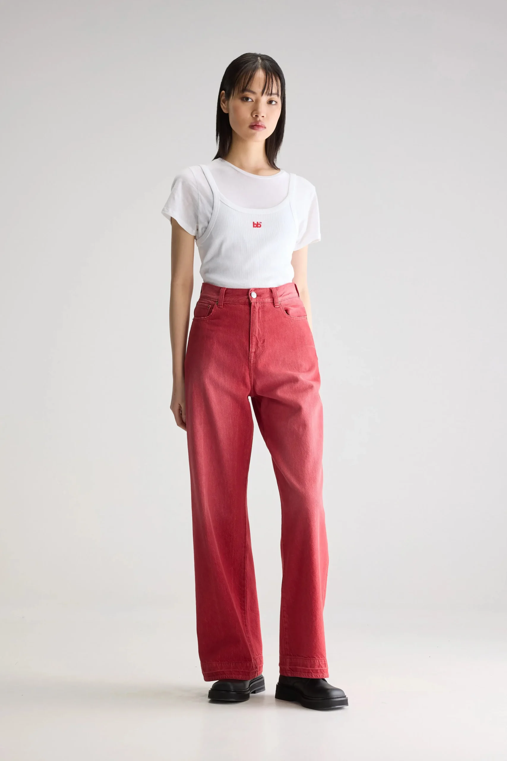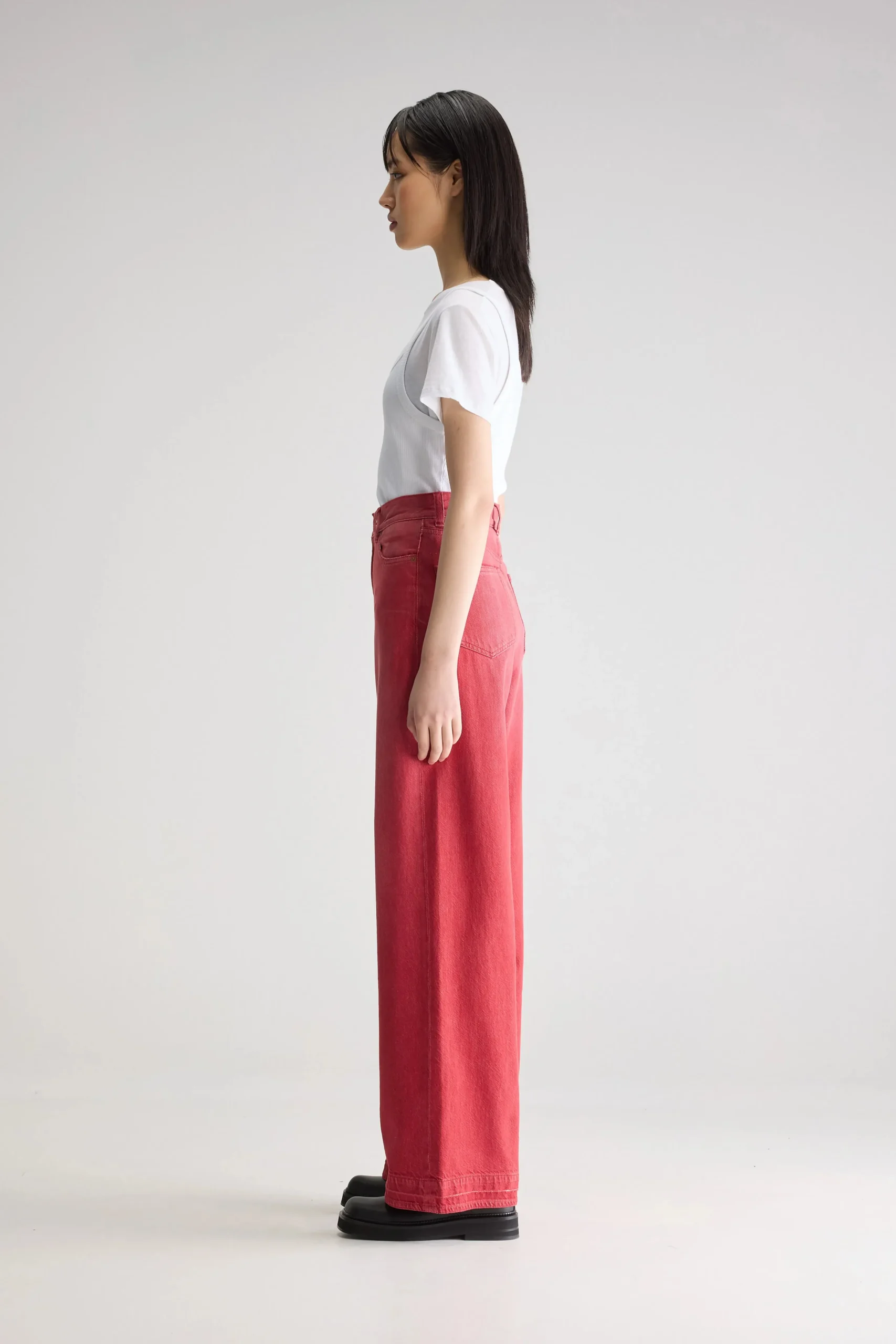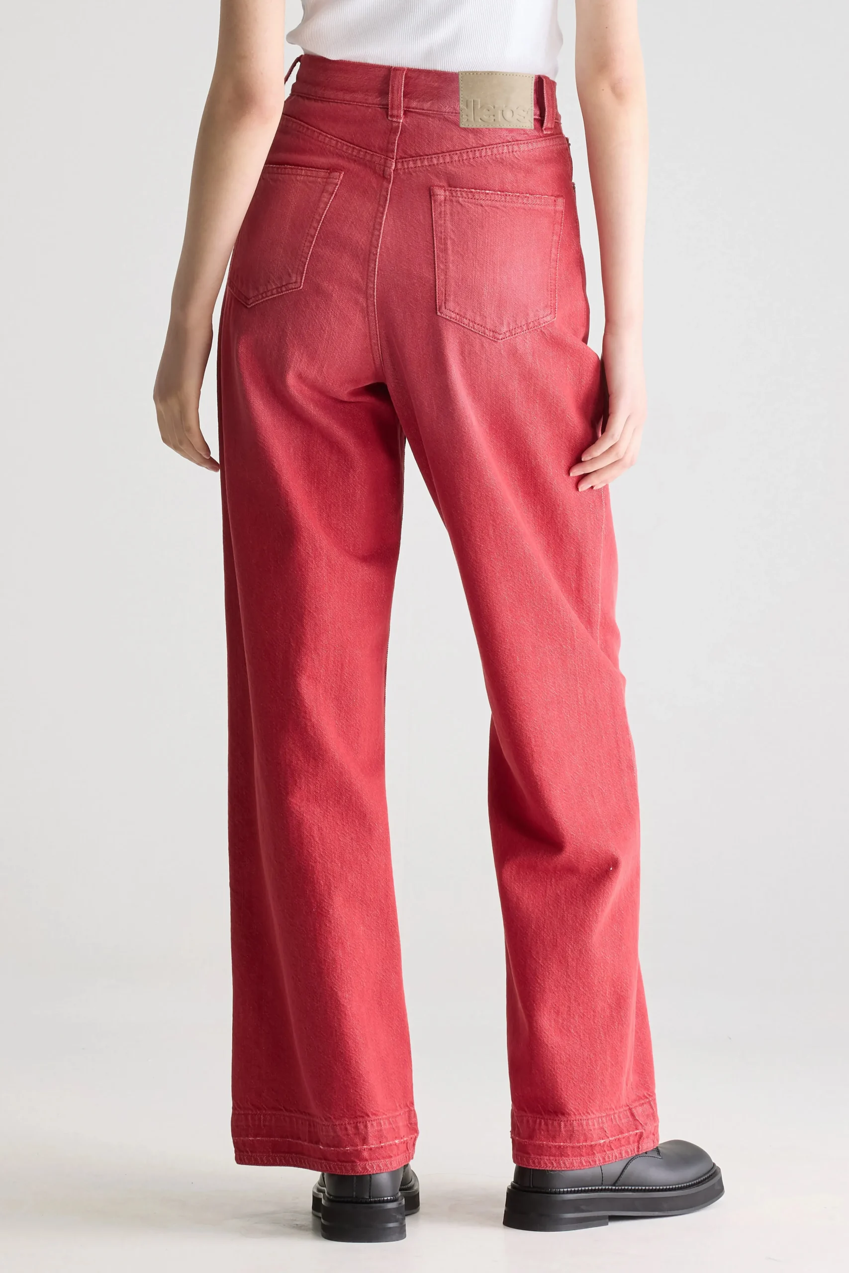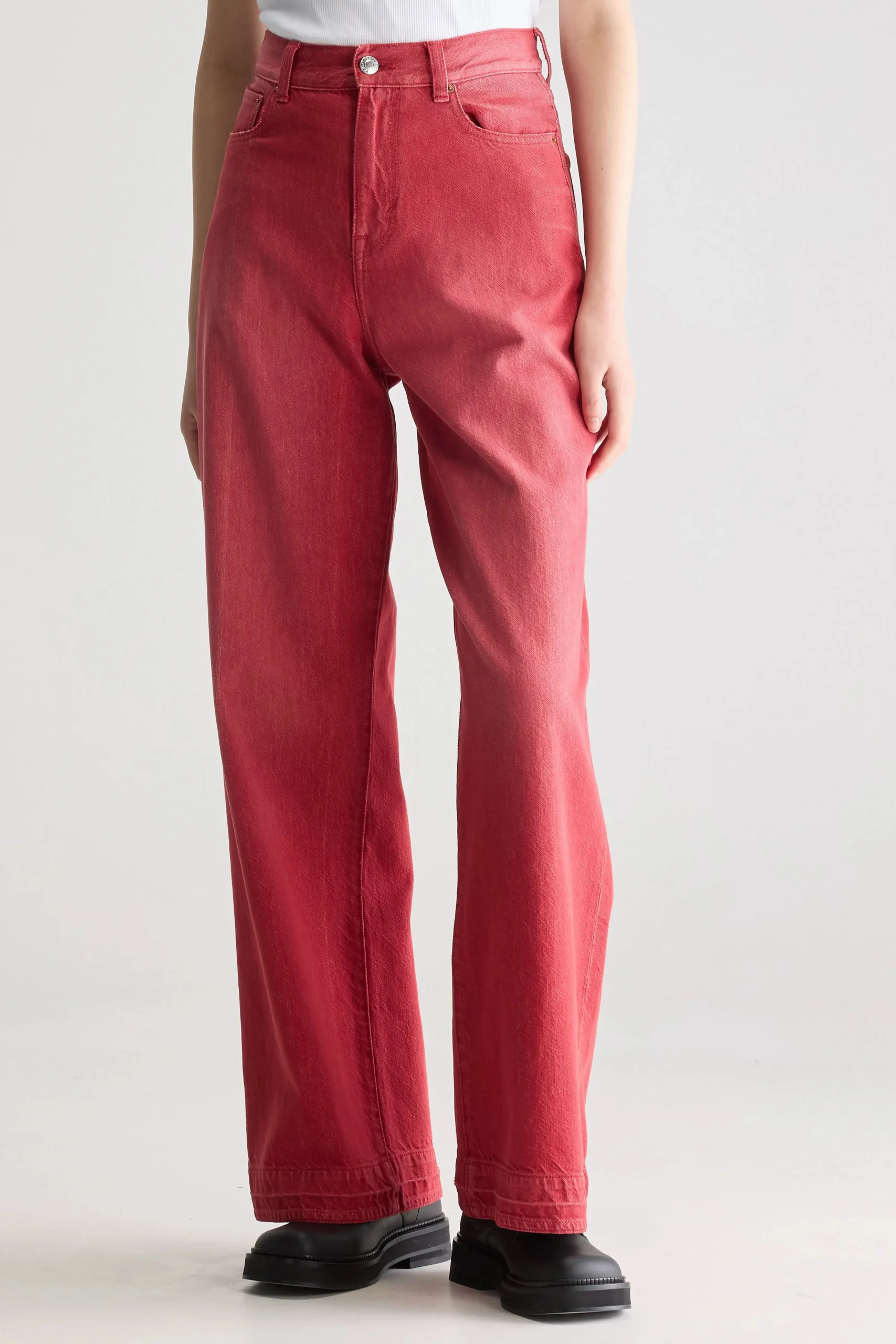 Boyfriend jeans met halfhoge taille en wijde pijpen van donkerrode denim, met distressed details op de zoom.Relaxte pasv…