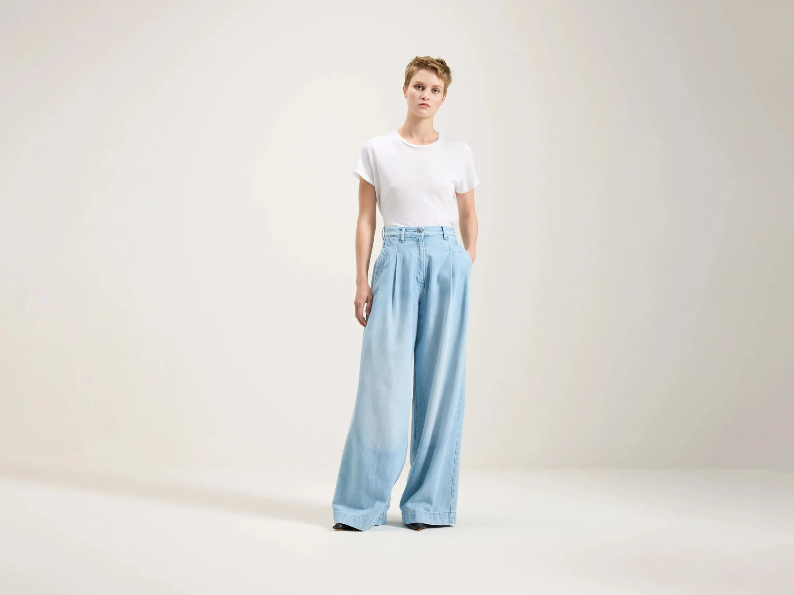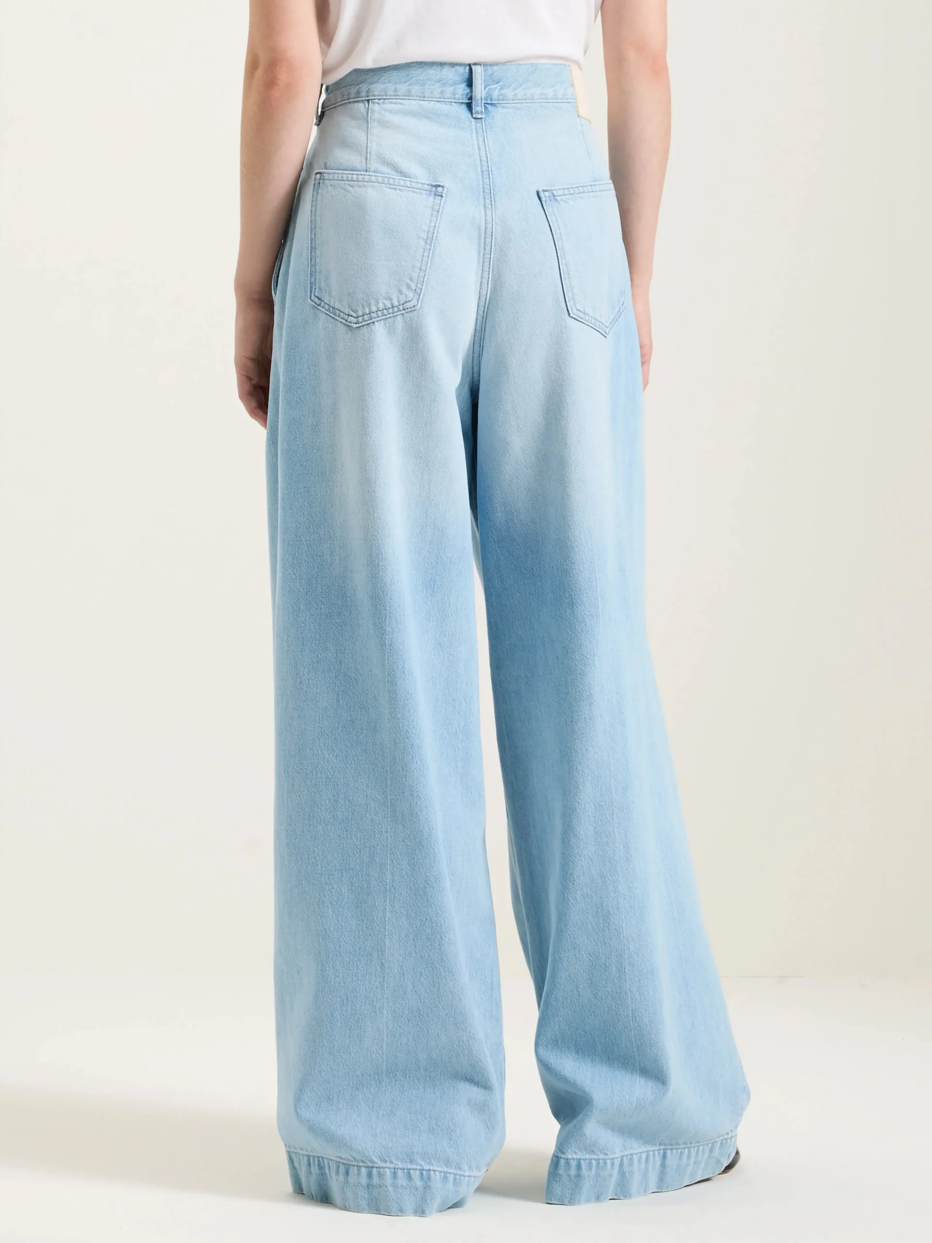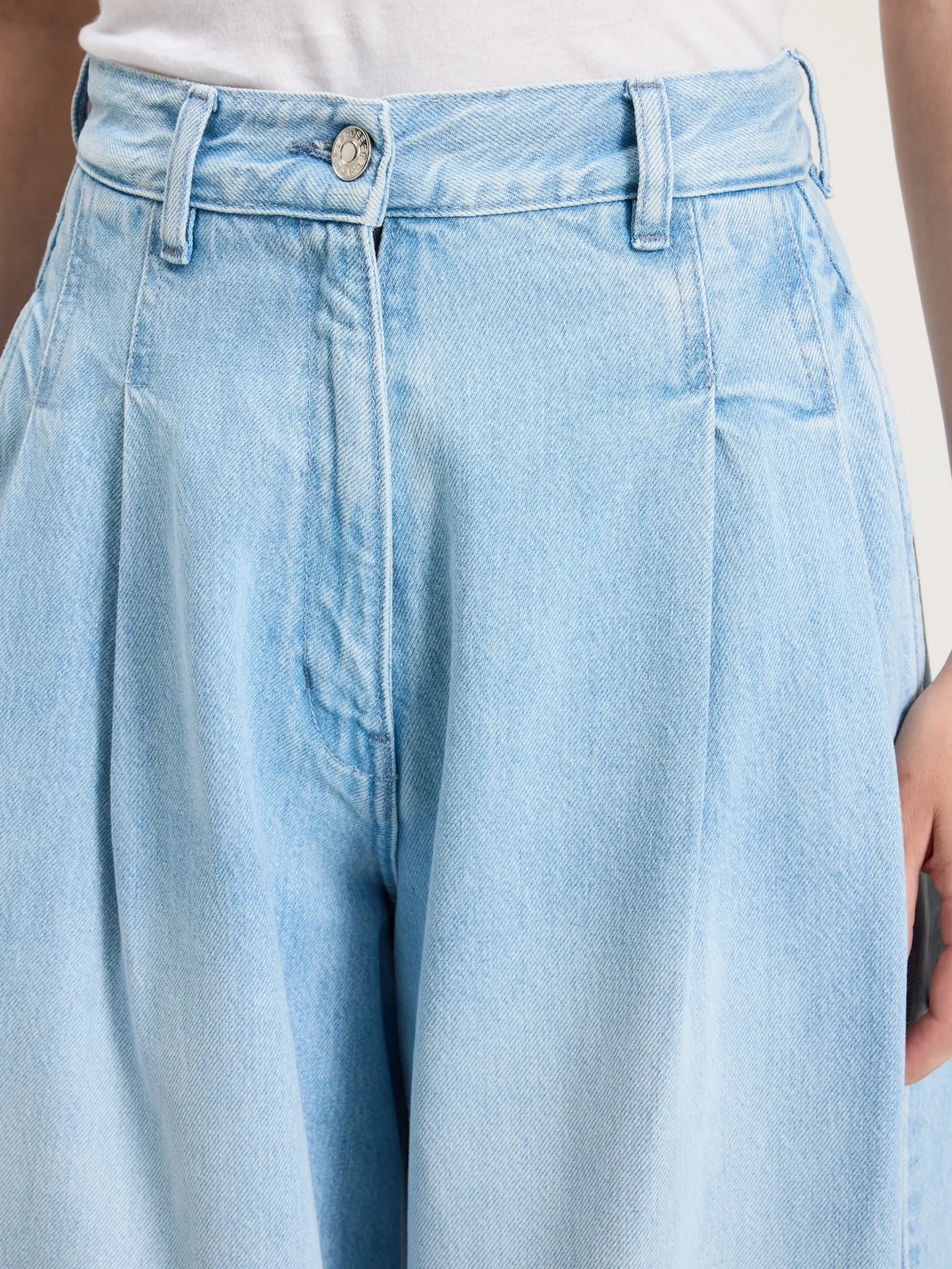 Geplooide jeans met halfhoge taille en super wijde pijpen in lichtblauw denim met een gedragen look, dat zacht en soepel aanvoelt.Geplooide stijlHalfhoog, super wijde pijpenDarts aan de achterkantZwaar, soepel denim, geen stretchRitssluitingBinnenbeenlengte: 32″ (gebaseerd op maat 26)De binnenbeenlengte past zich lichtjes aan afhankelijk van de gekozen maat, zodat de pasvorm proportioneel blijft.