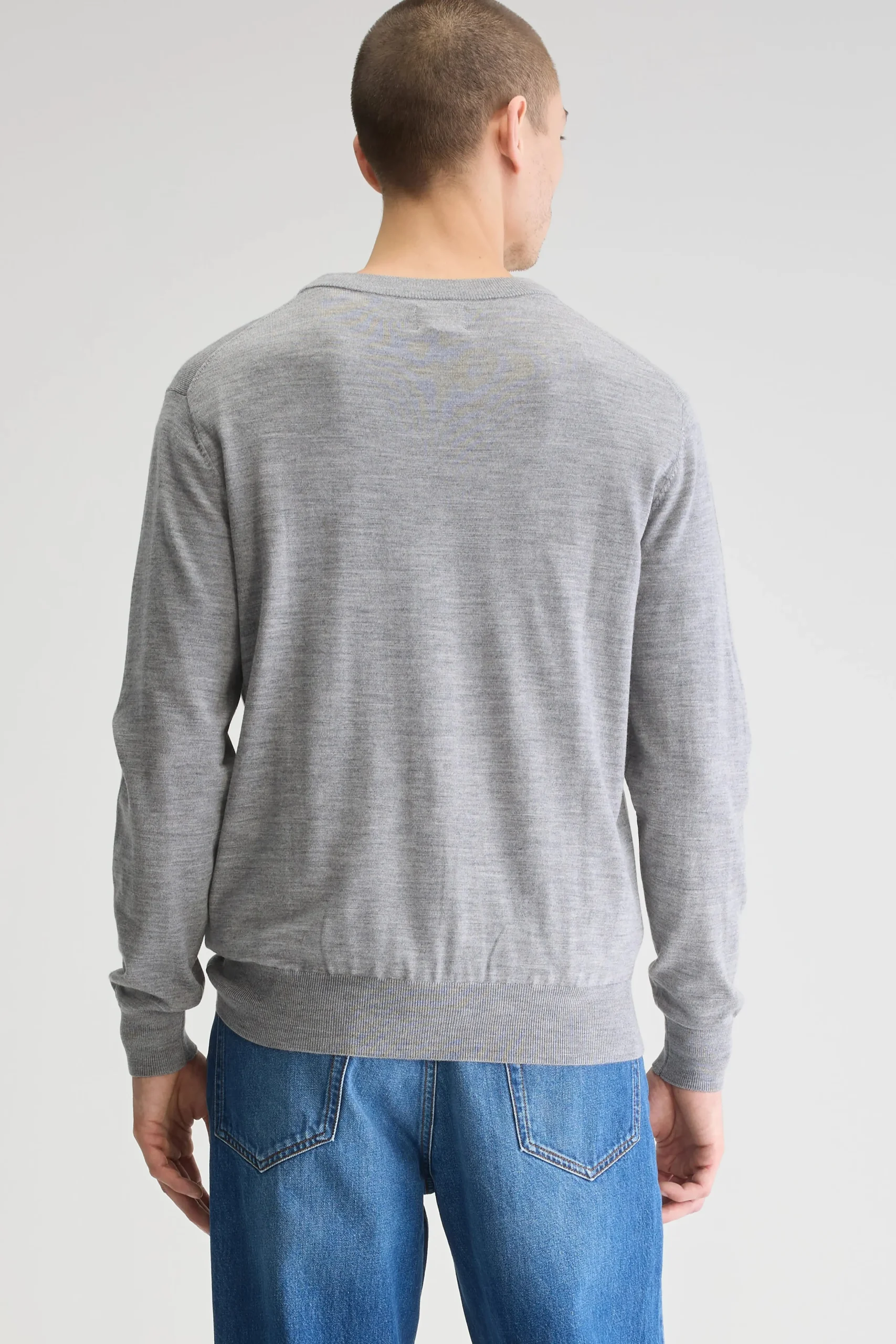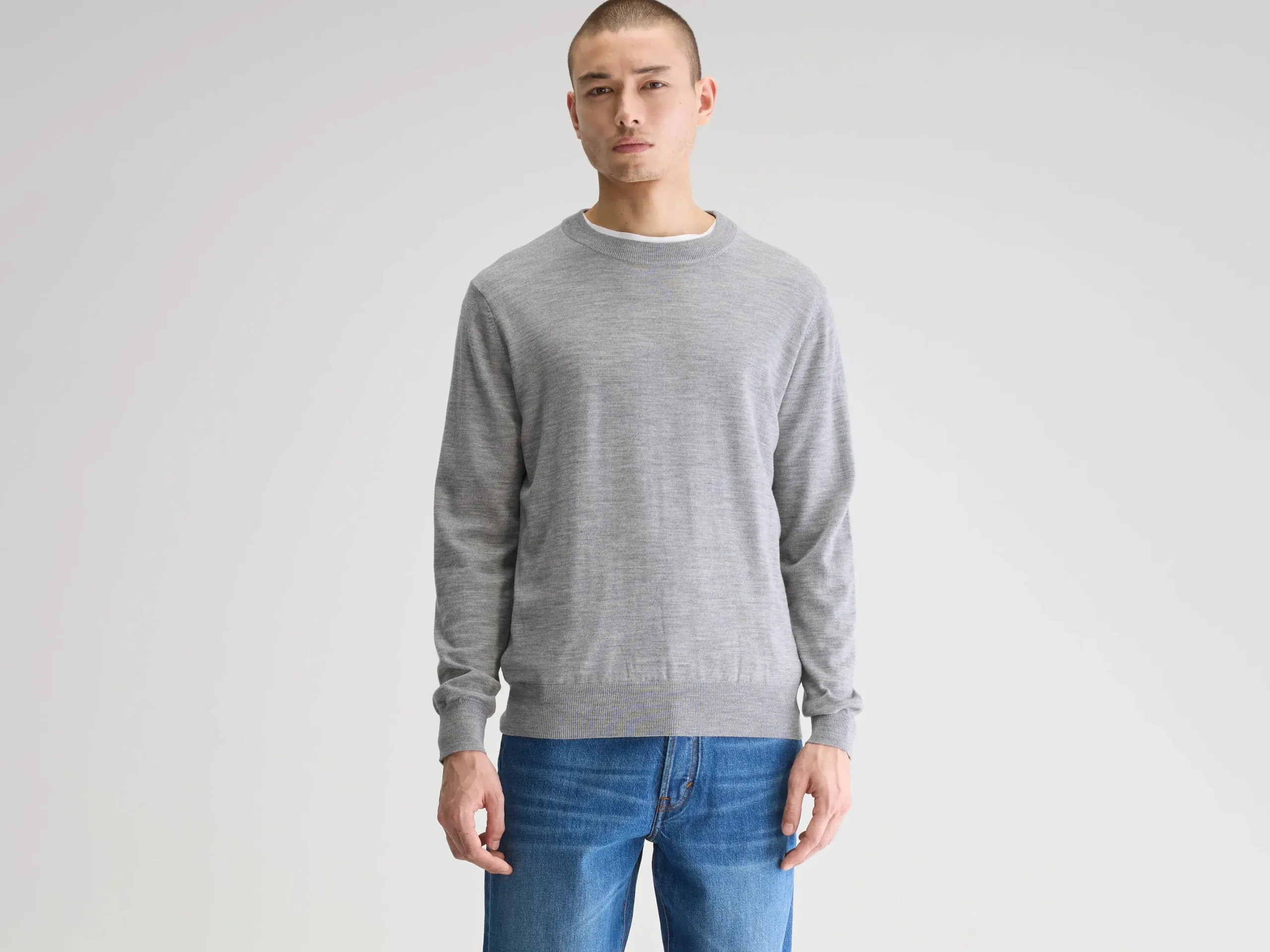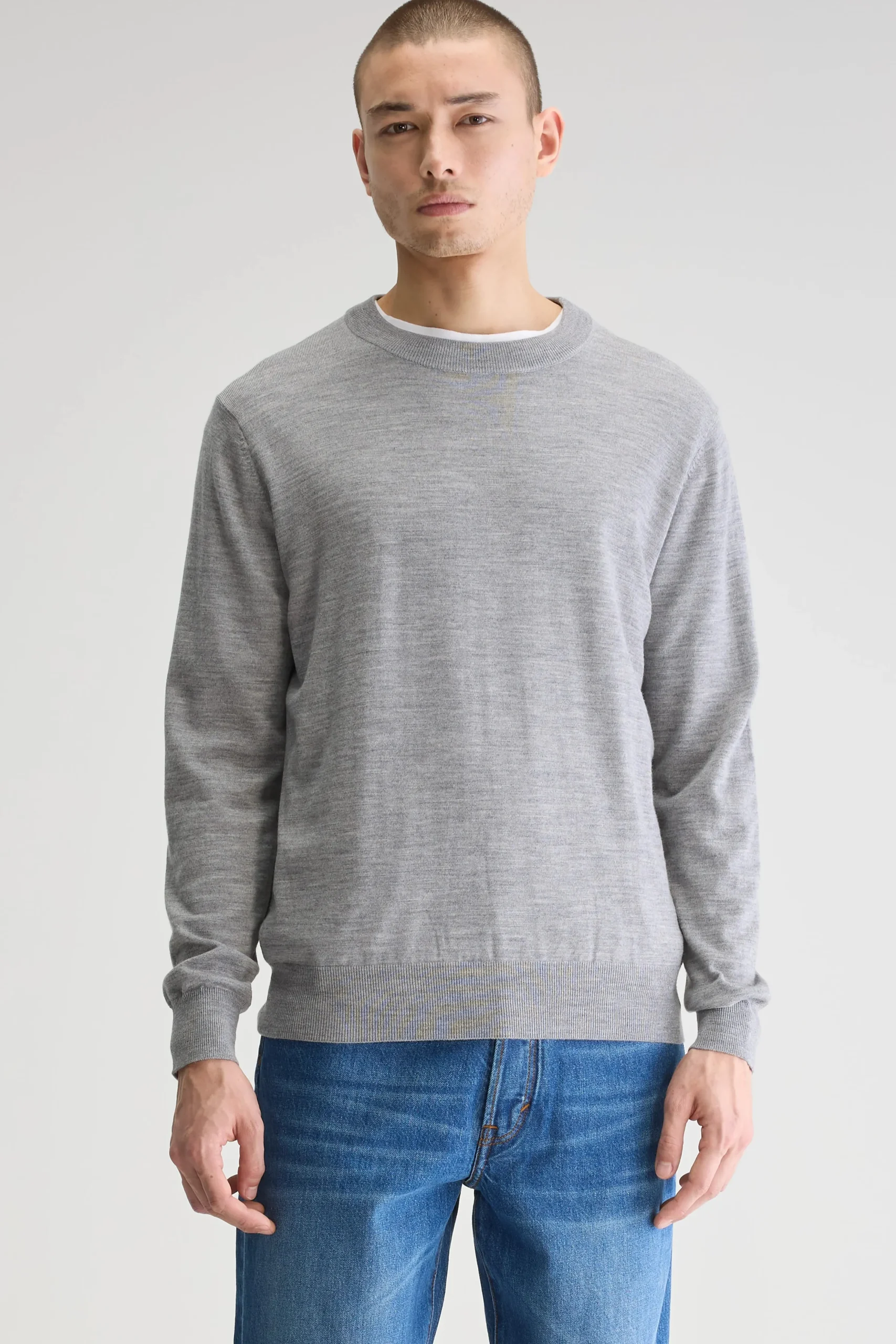 Klassieke trui met ronde hals, gemaakt van zachtgrijze, superfijne merinowol.Klassieke pasvormRonde hals Lange mouwen Fine gauge