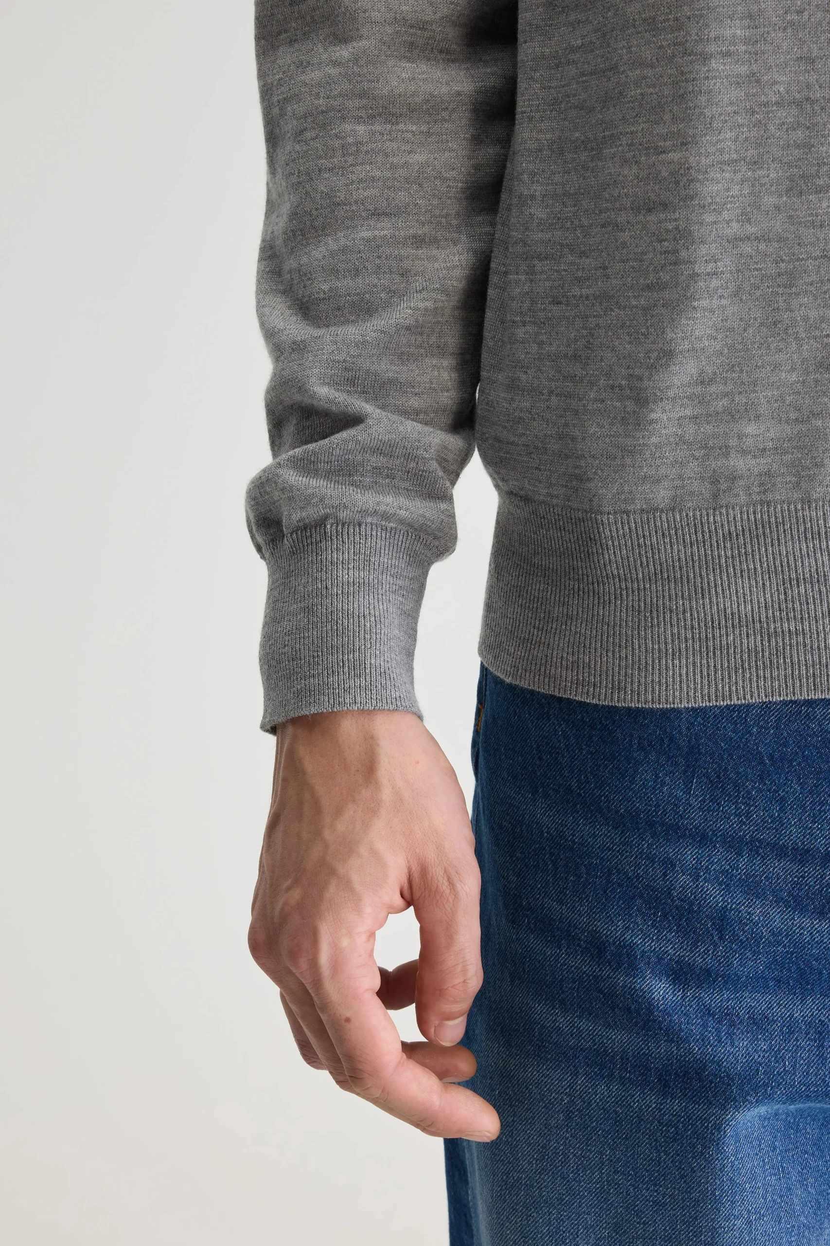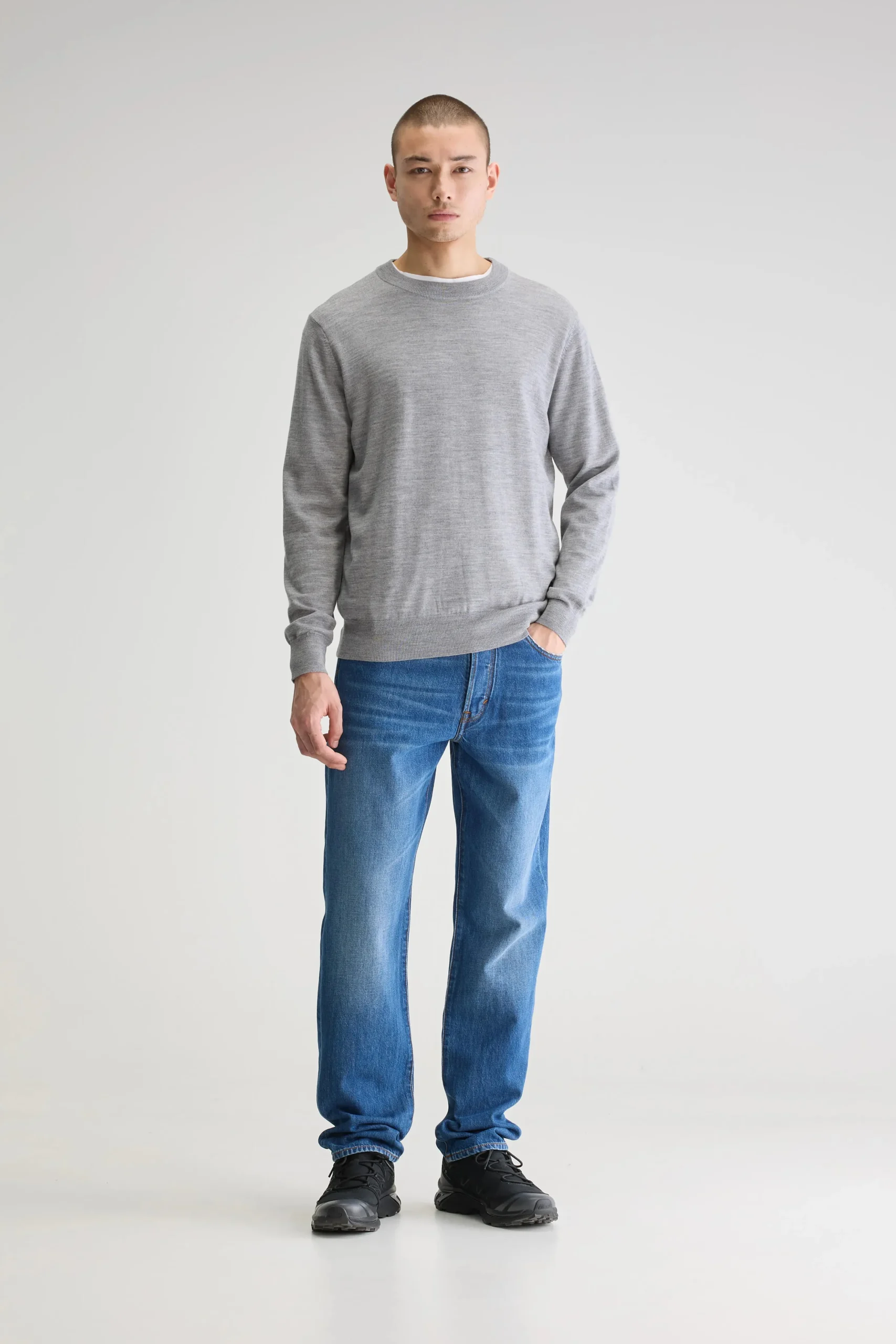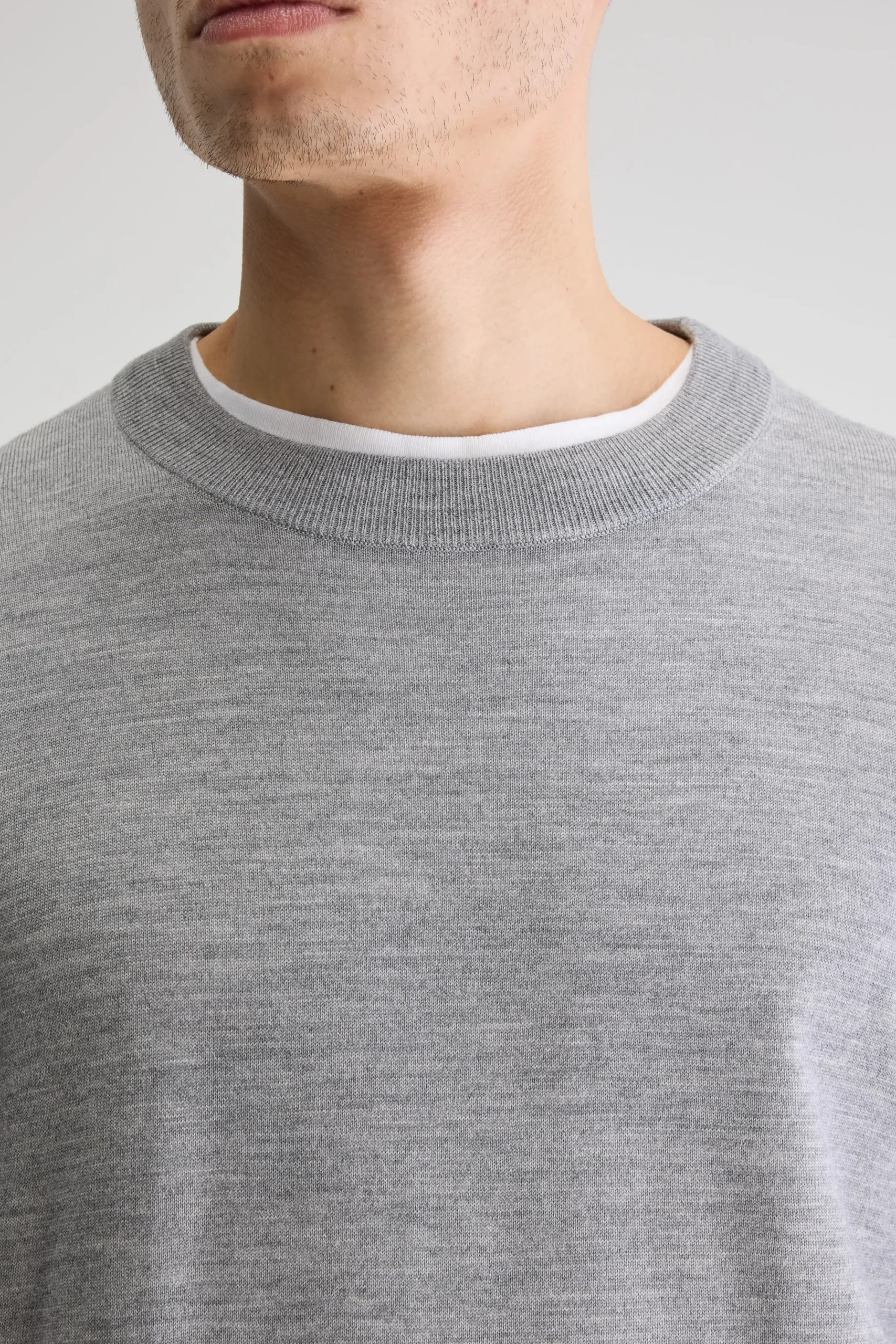 Klassieke trui met ronde hals, gemaakt van zachtgrijze, superfijne merinowol.Klassieke pasvormRonde hals Lange mouwen Fine gauge