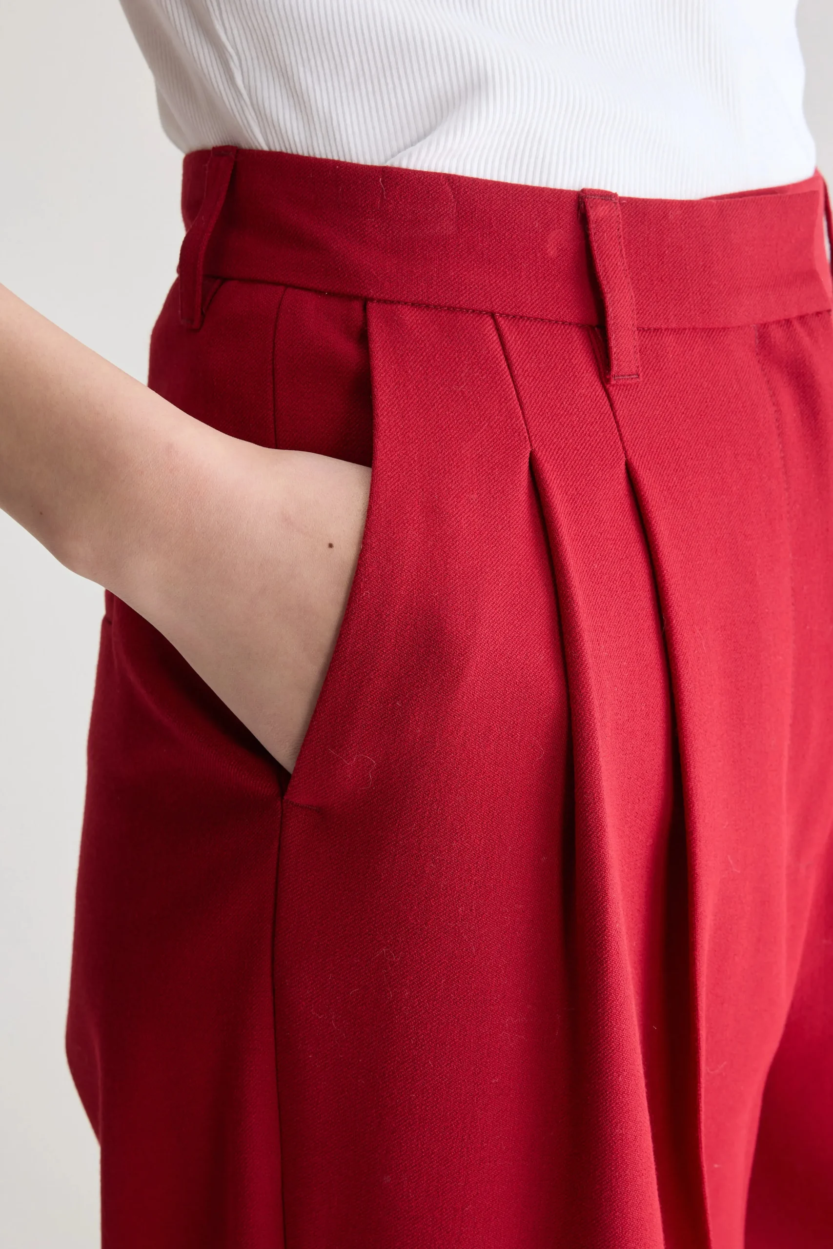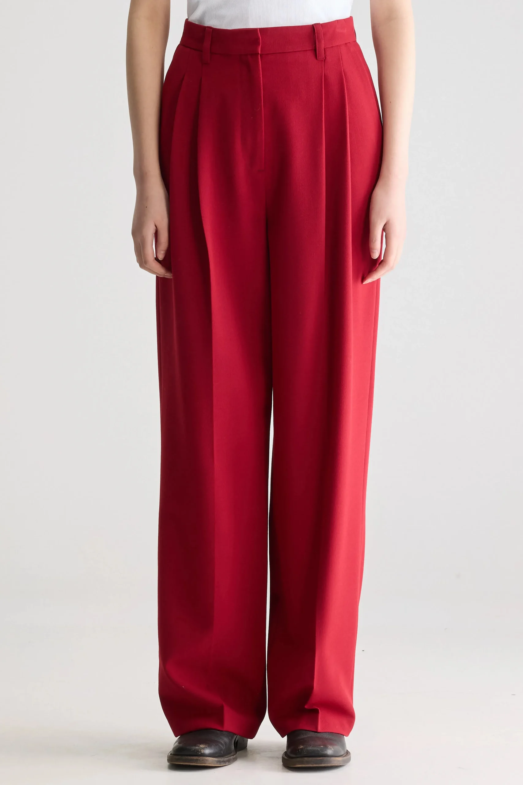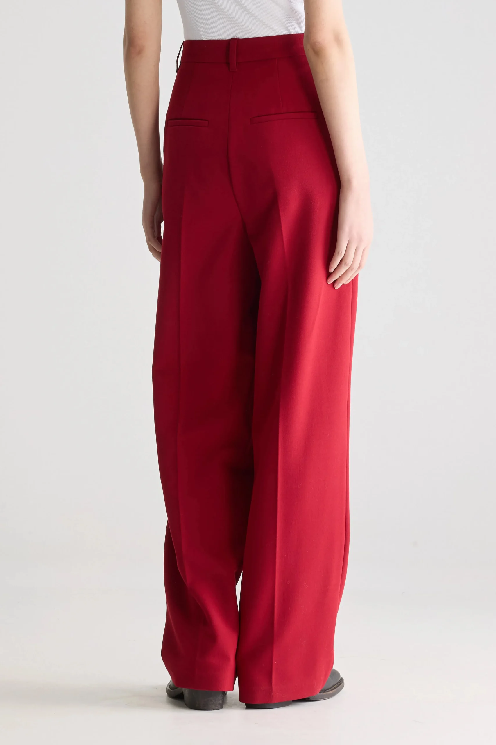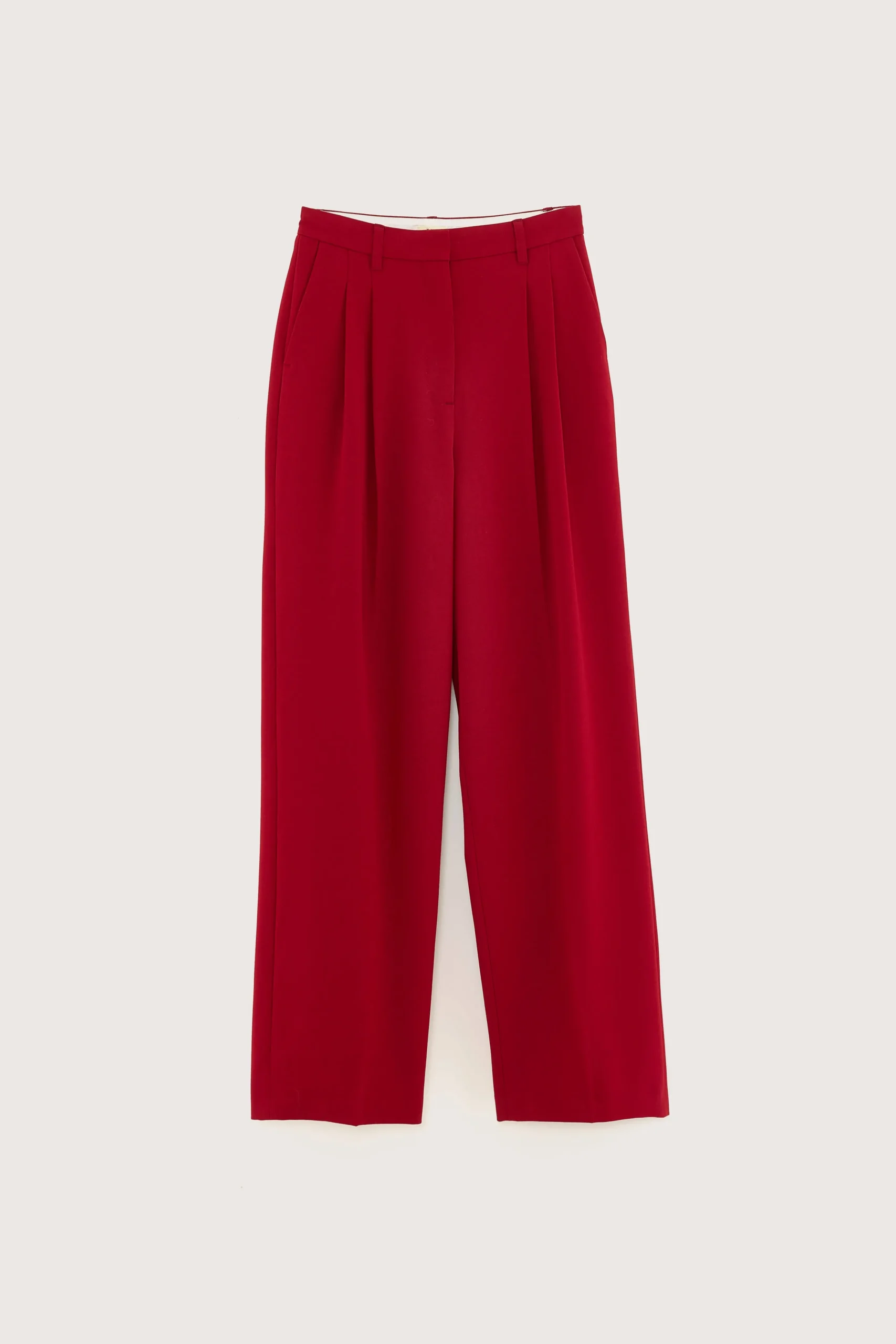 Hoog getailleerde broek met geplooide voorkant en rechte pijpen in keperstof met rozenhouttint.Regular fit, getailleerde stijl Hoge taille, rechte pijpen Geen stretchGeplooide voorkantAchterzakken met koord RiemlussenRits- en haaksluitingBinnenbeenlengte: 31″(gebaseerd op maat 36)De binnenbeenlengte past zich lichtjes aan afhankelijk van de gekozen maat, zodat de pasvorm proportioneel blijft.